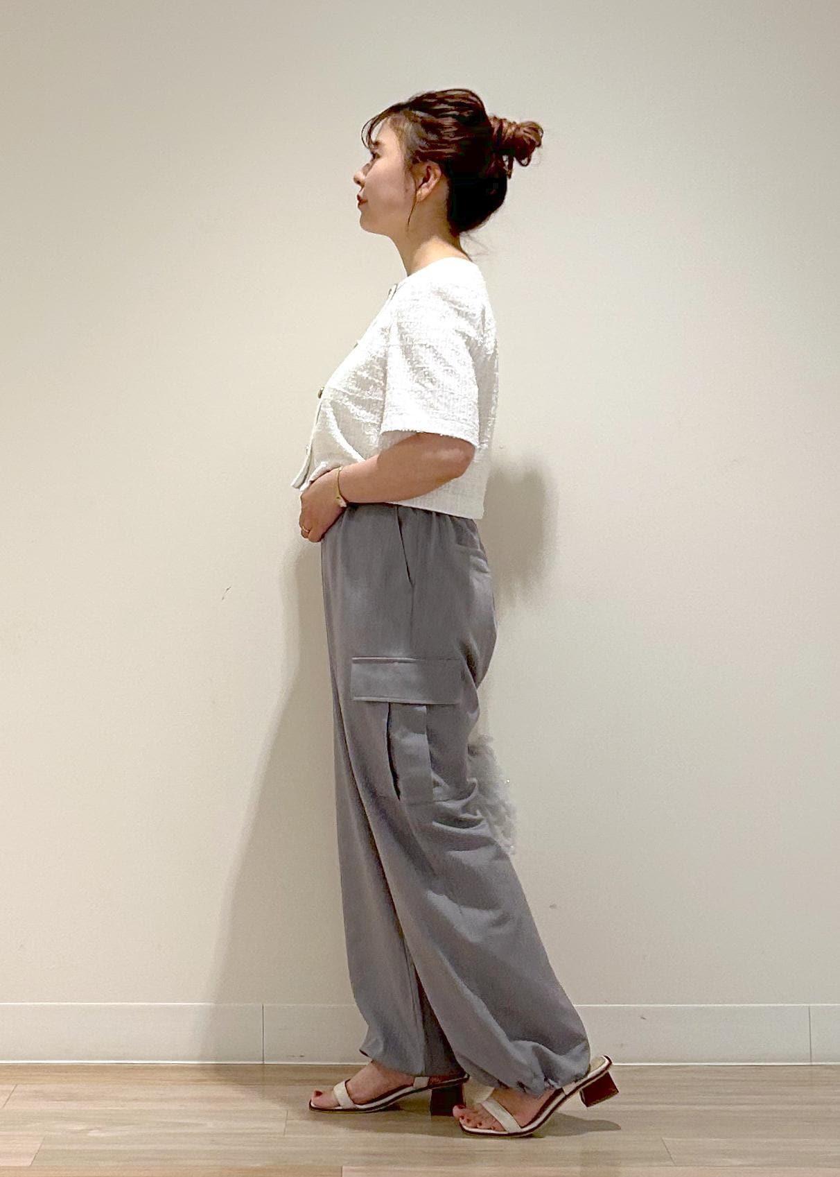 カーゴパンツは裾を絞り、サンダルやジャケットなどのキレイめなアイテムと合わせ、大人っぽいキレイめなコーディネートにしました。スニーカーで合わせると、スポーツミックススタイルが出来上がります。