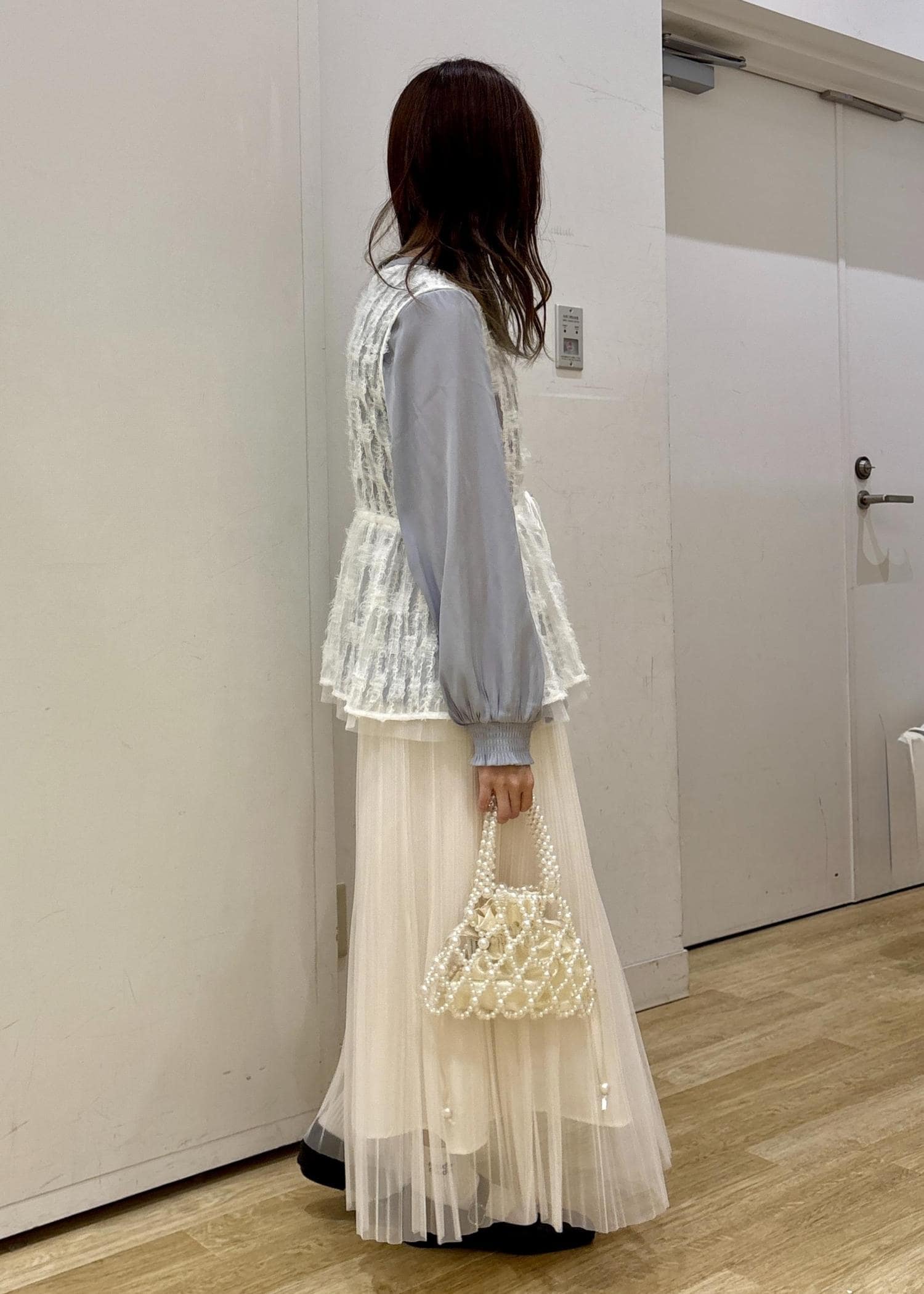 ブラウスは淡いペールトーンのカラーで、カラーアイテムが苦手な方でも取り入れやすくトレンド感のあるコーデになります!