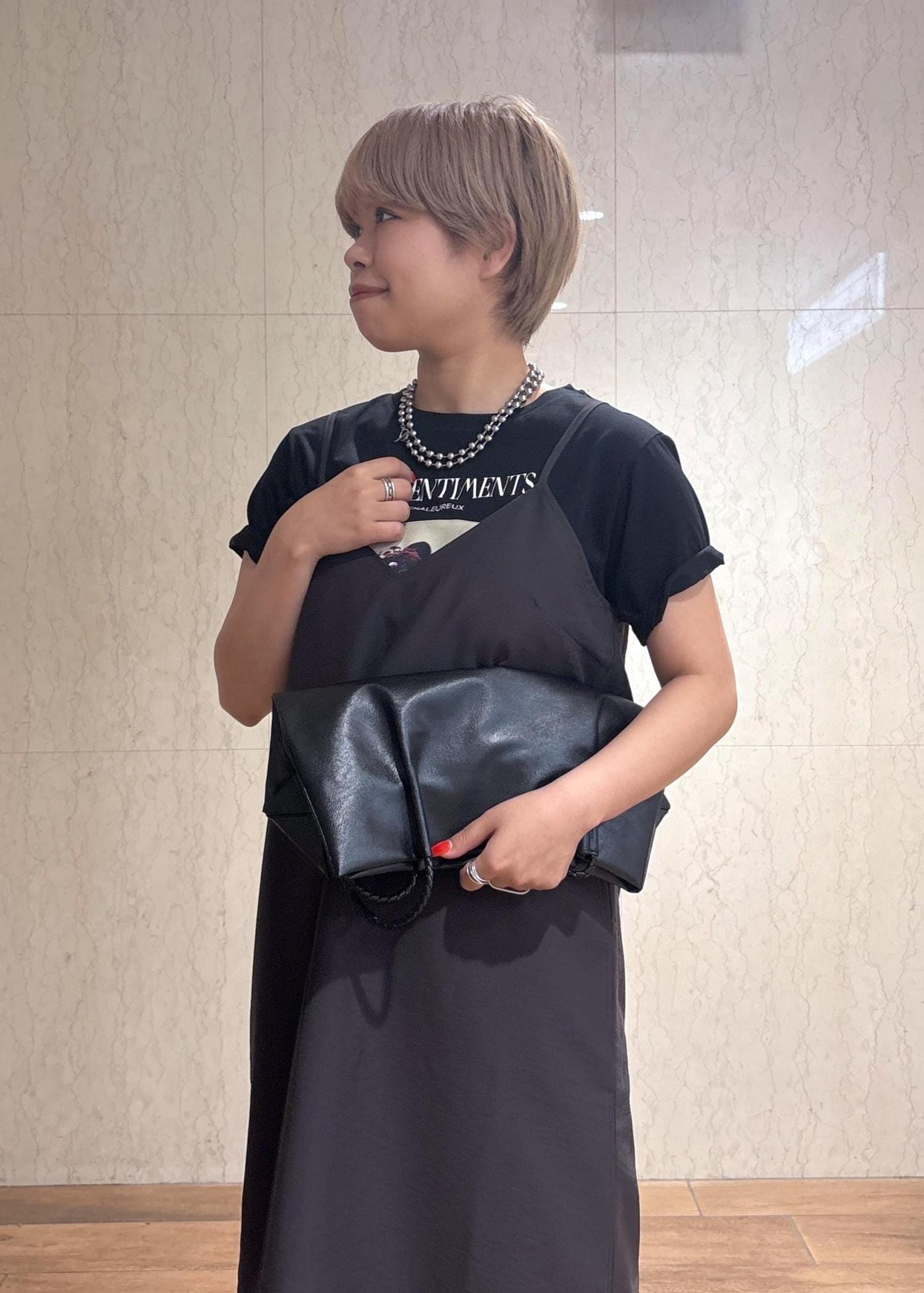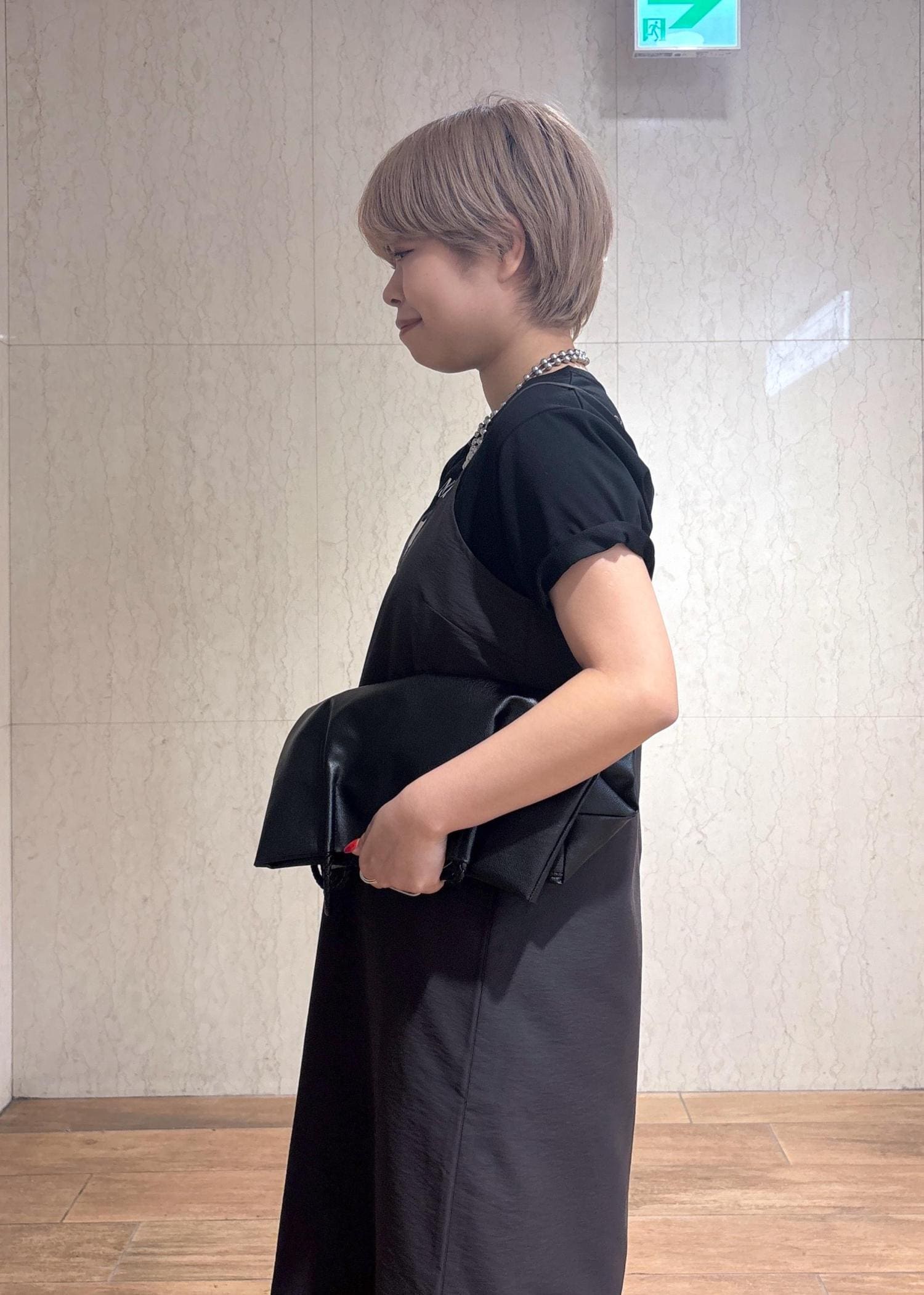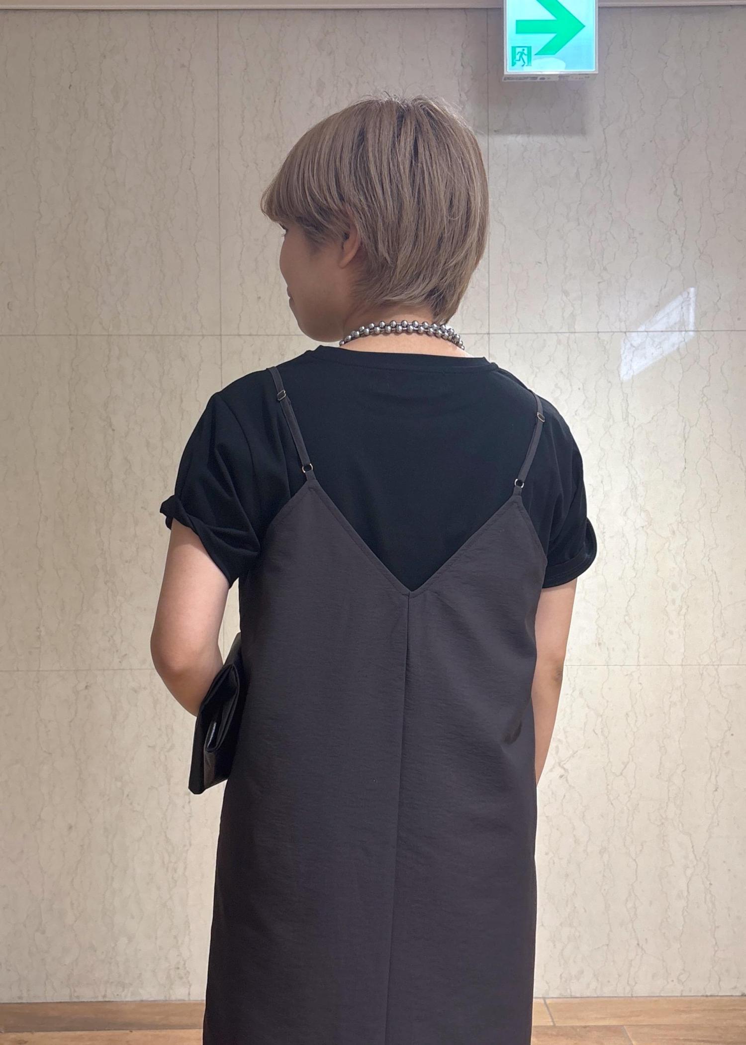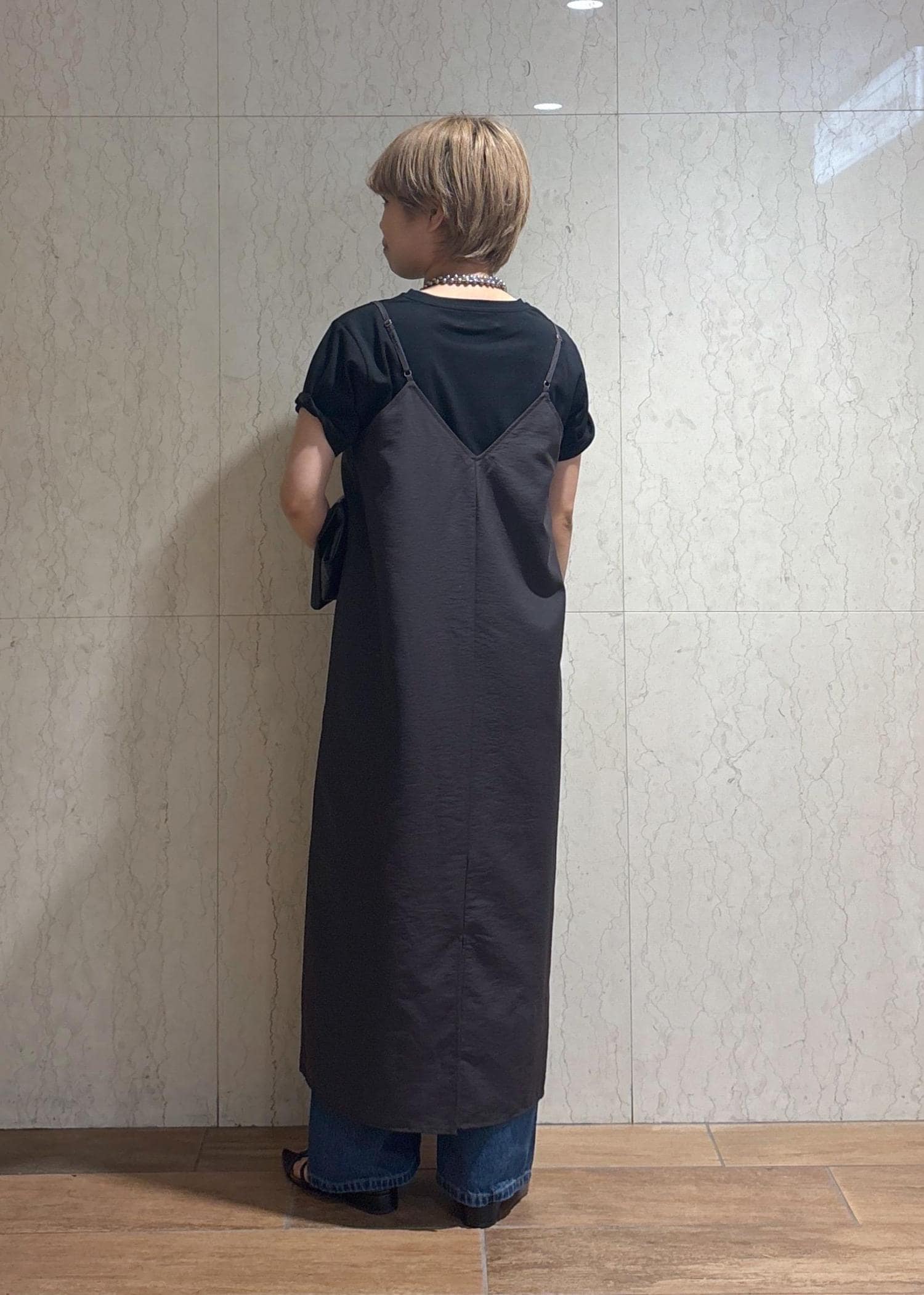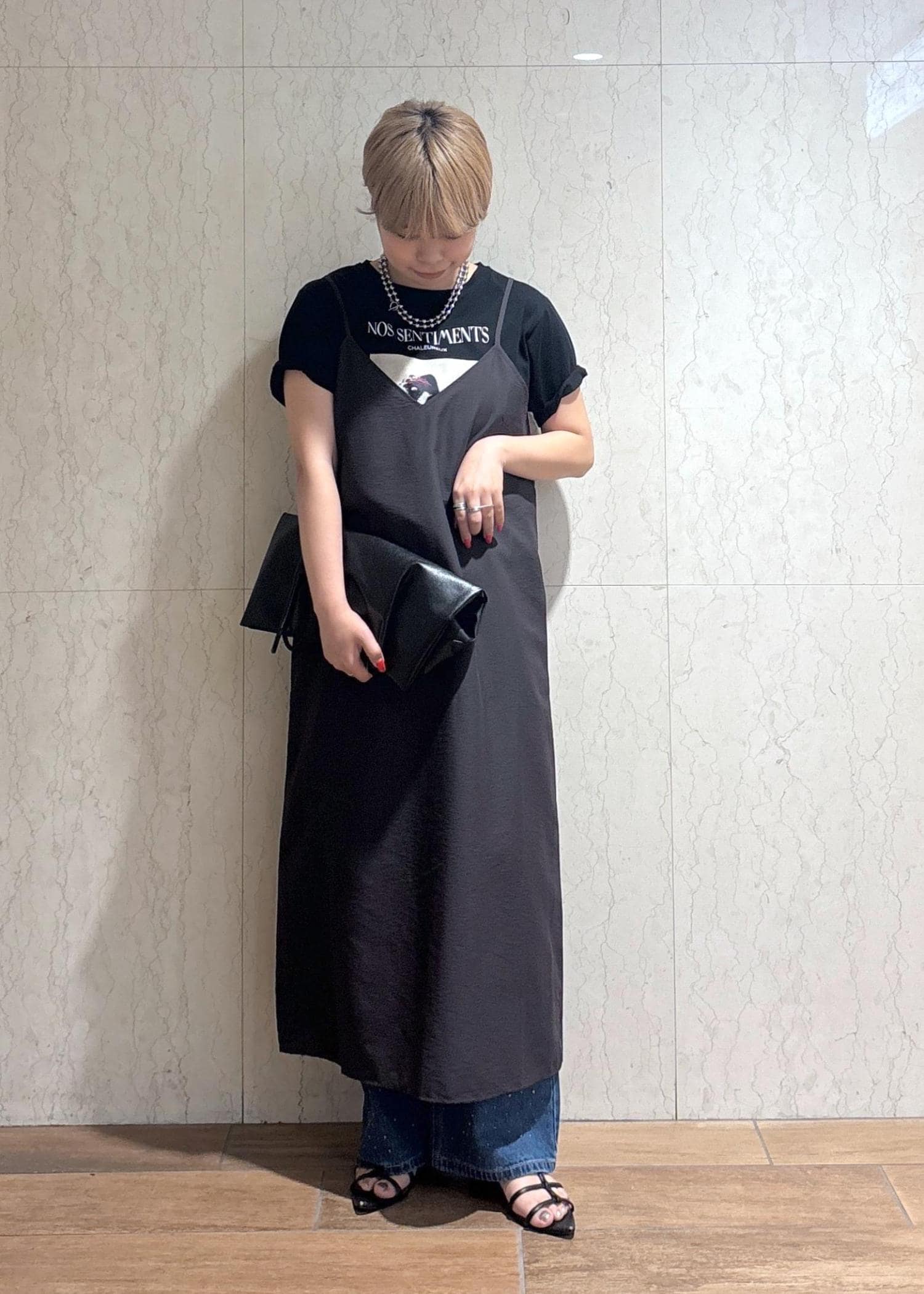 今回はチャコールグレーのキャミワンピを主役にコーディネートを組みました。