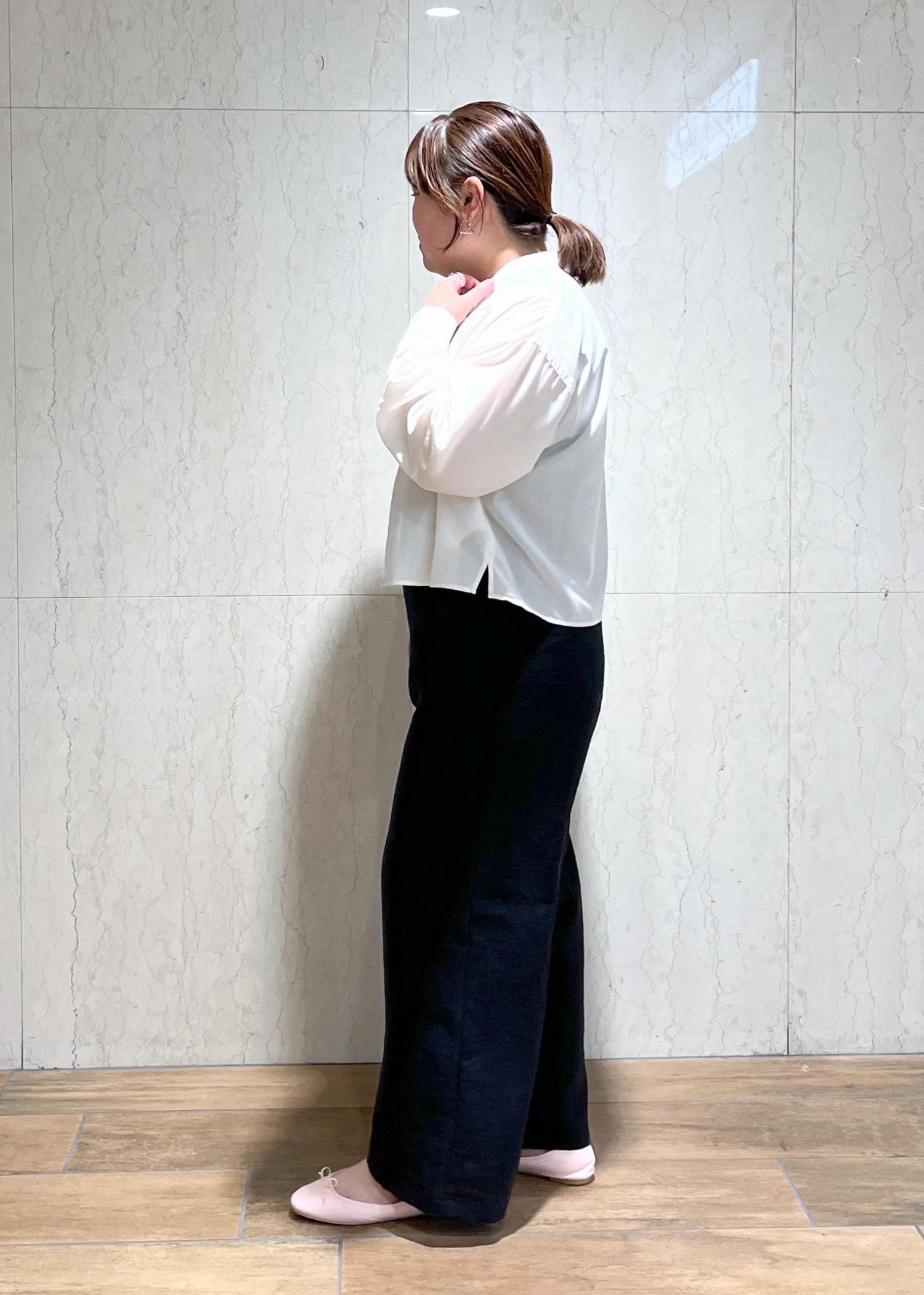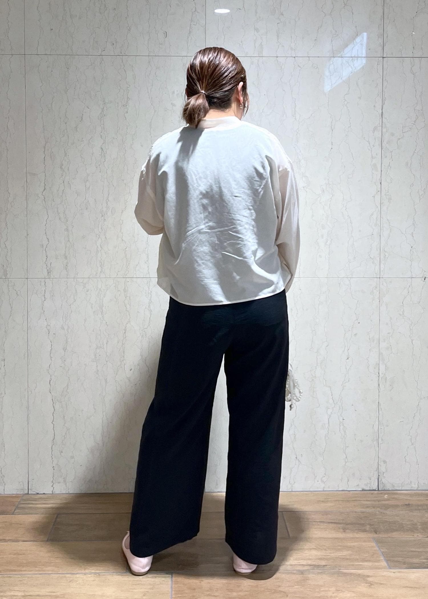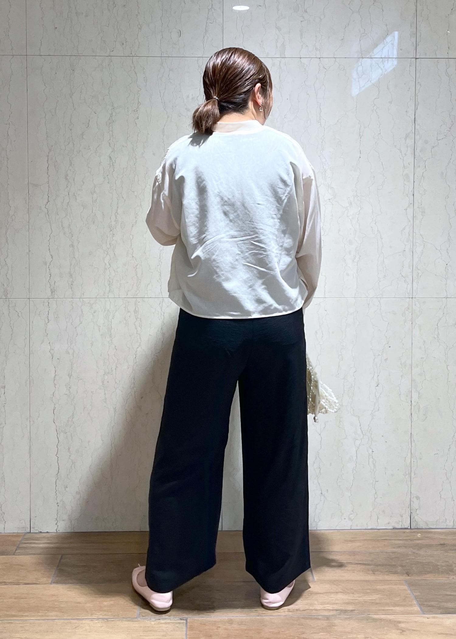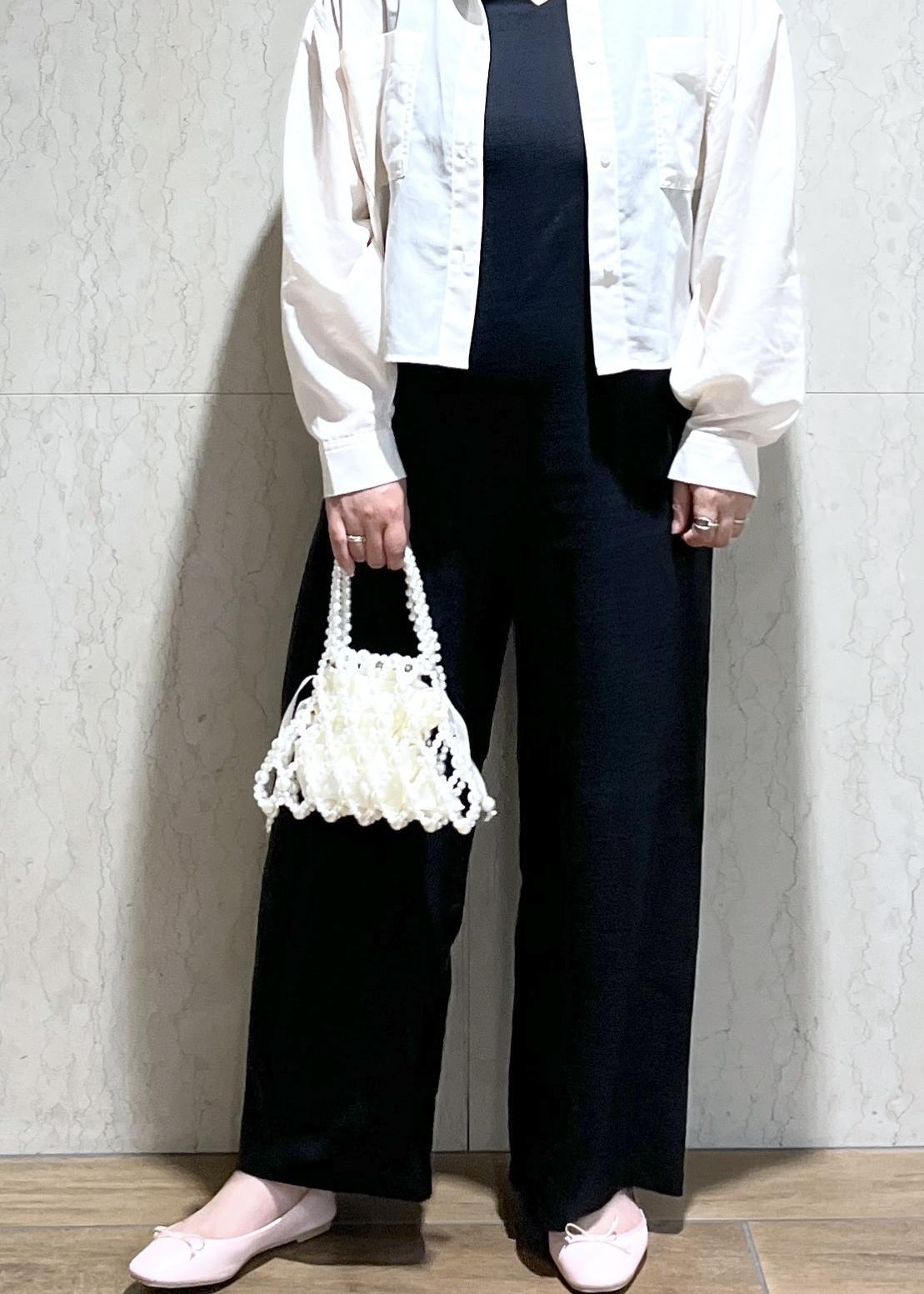 ホワイト×ブラックのモノトーンだったので足元はピンクのバレエシューズを合わせて女性らしくしました。