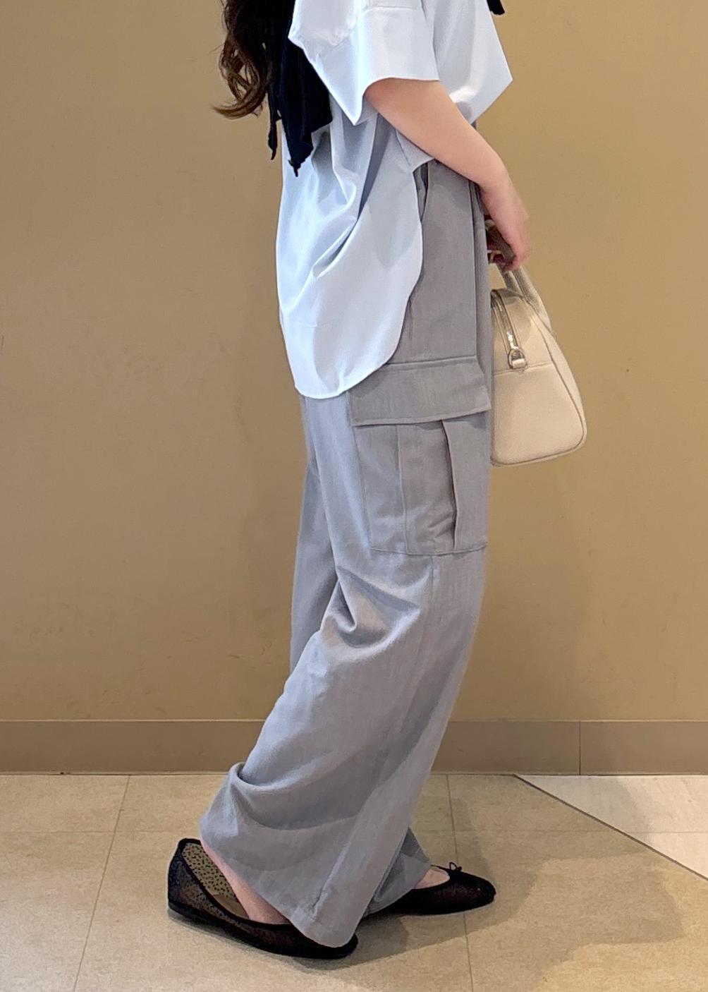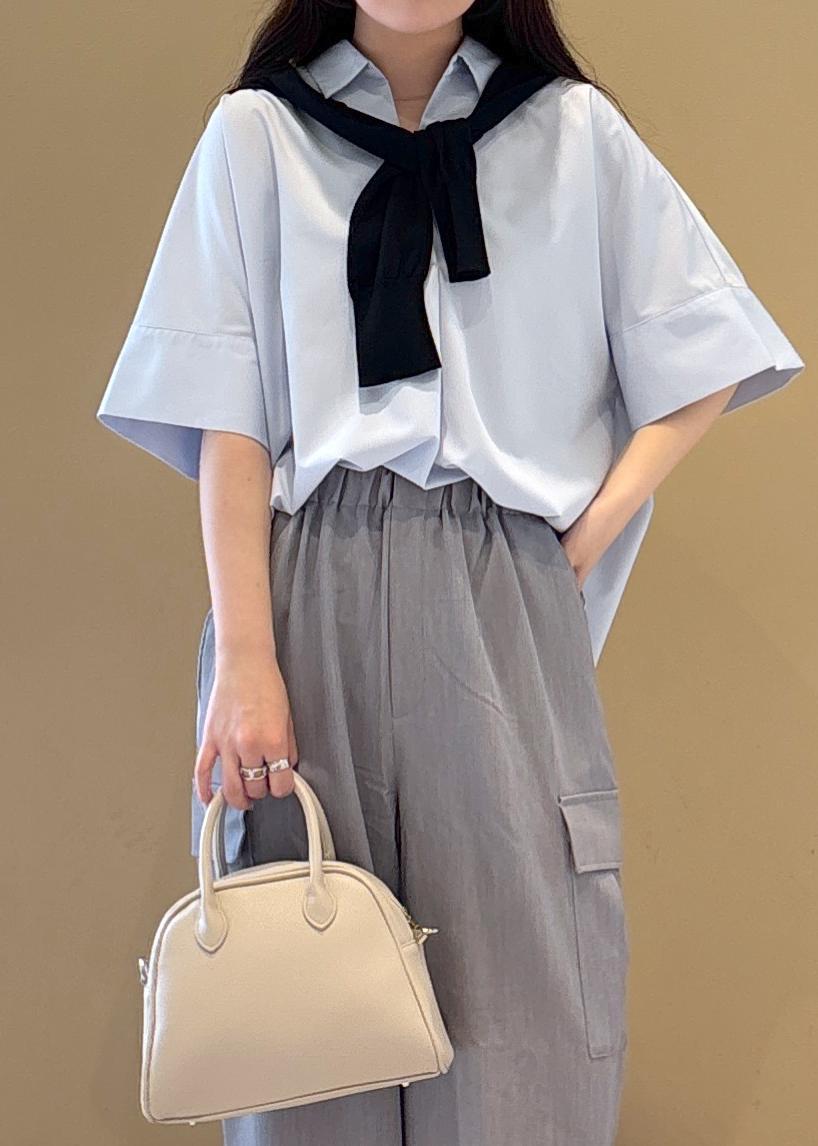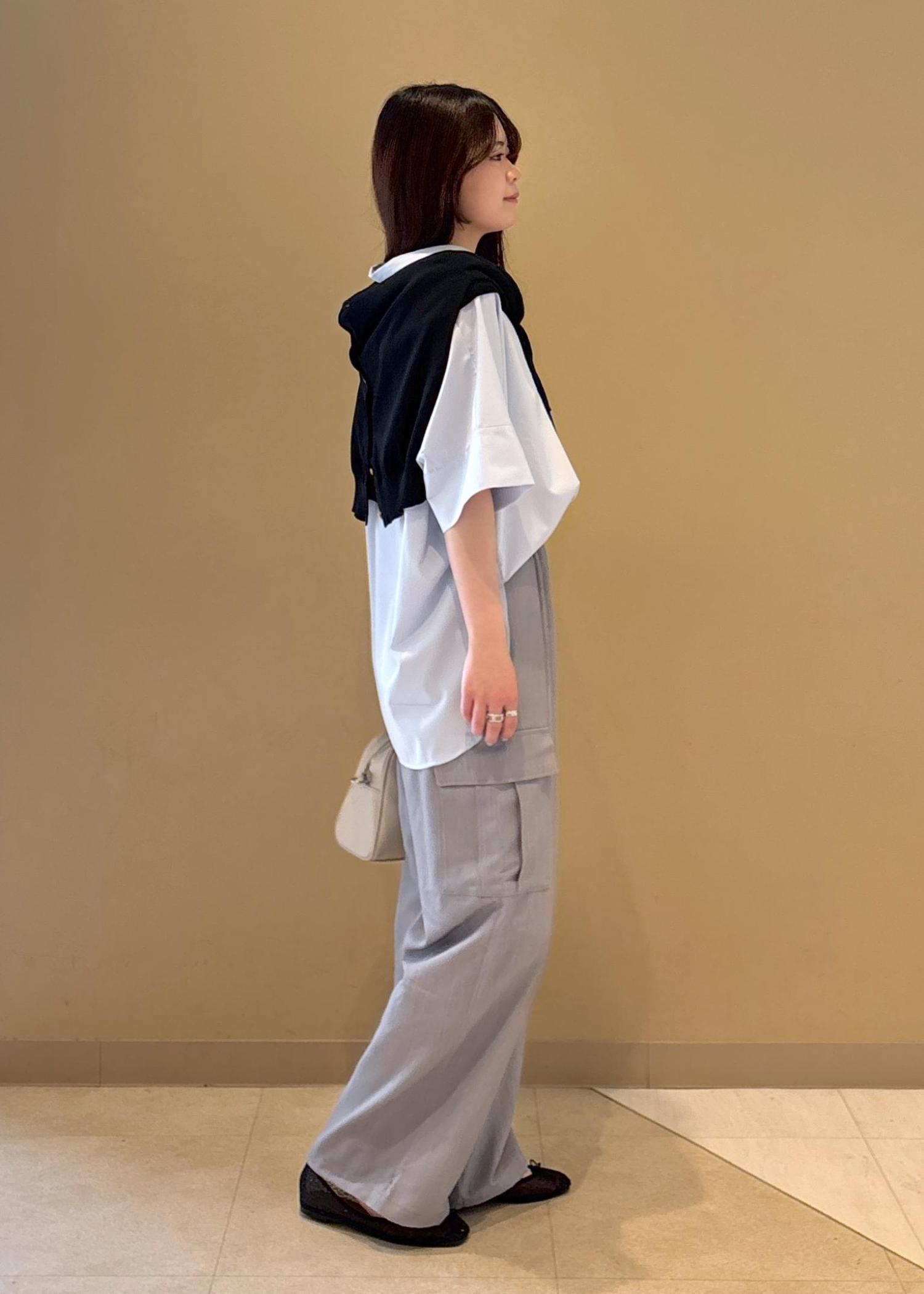 淡めのブルーとグレーの色合わせで清涼感のあるキレイめオフィスコーデ。サラッと着られる素材とサイズ感にして夏場の着やすさも兼ね備えたスタイルです。