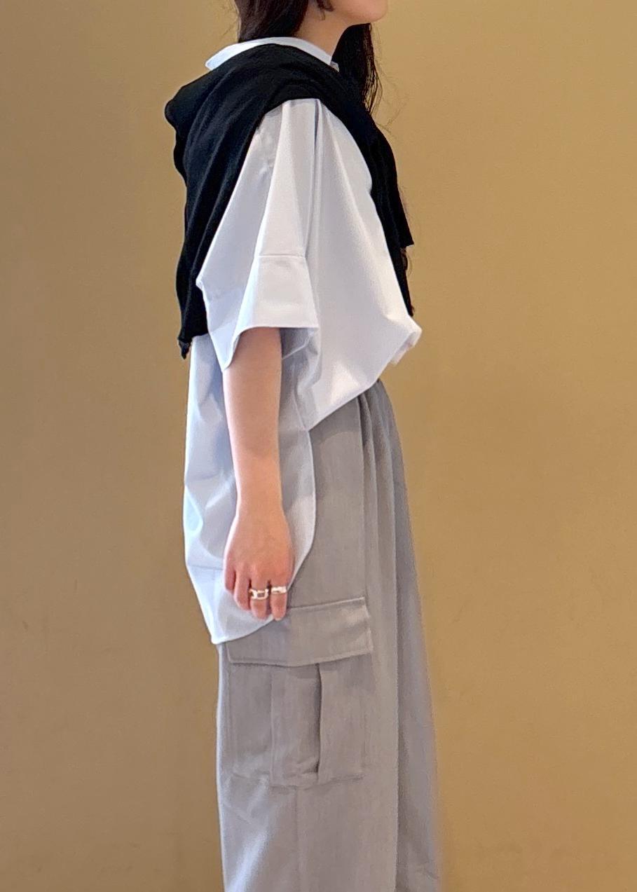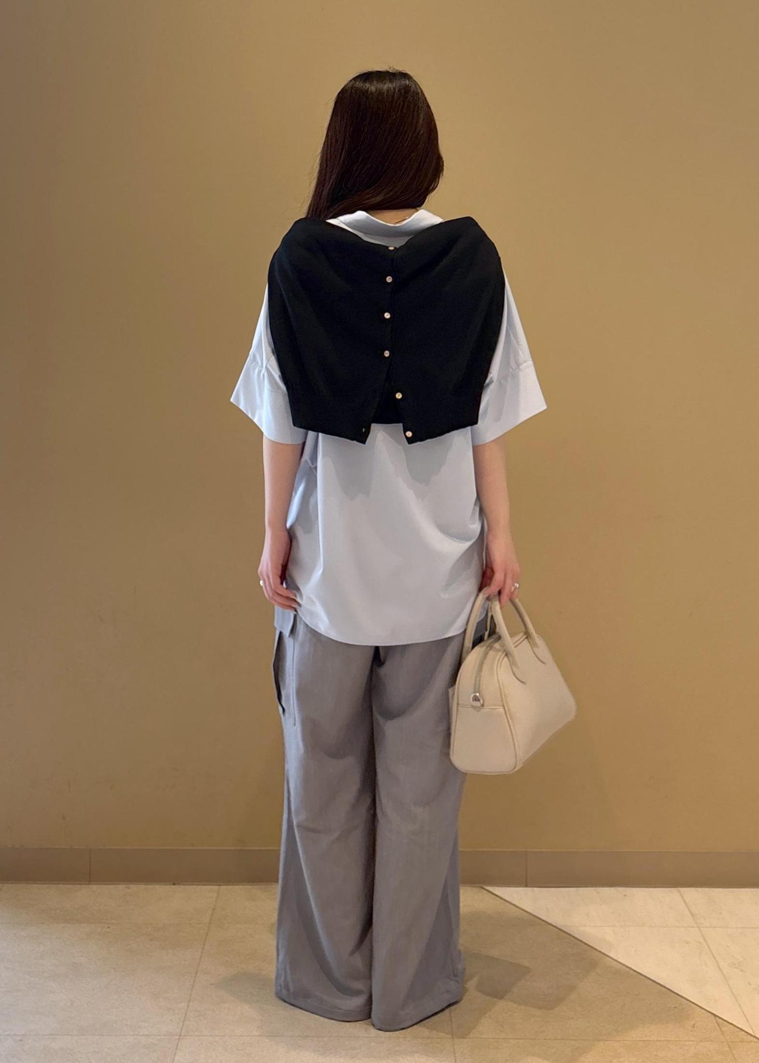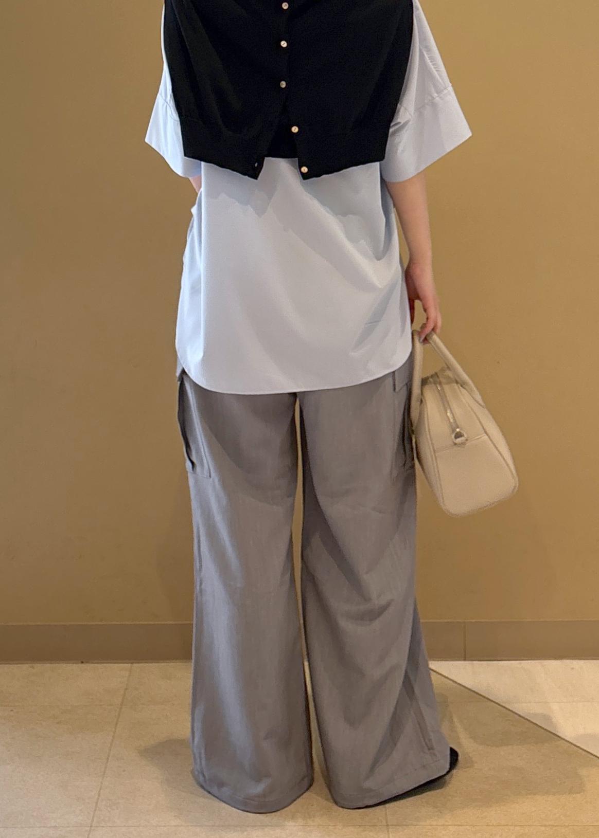 淡めのブルーとグレーの色合わせで清涼感のあるキレイめオフィスコーデ。サラッと着られる素材とサイズ感にして夏場の着やすさも兼ね備えたスタイルです。