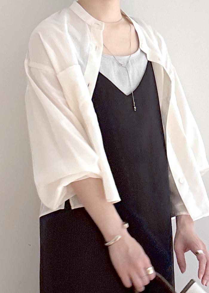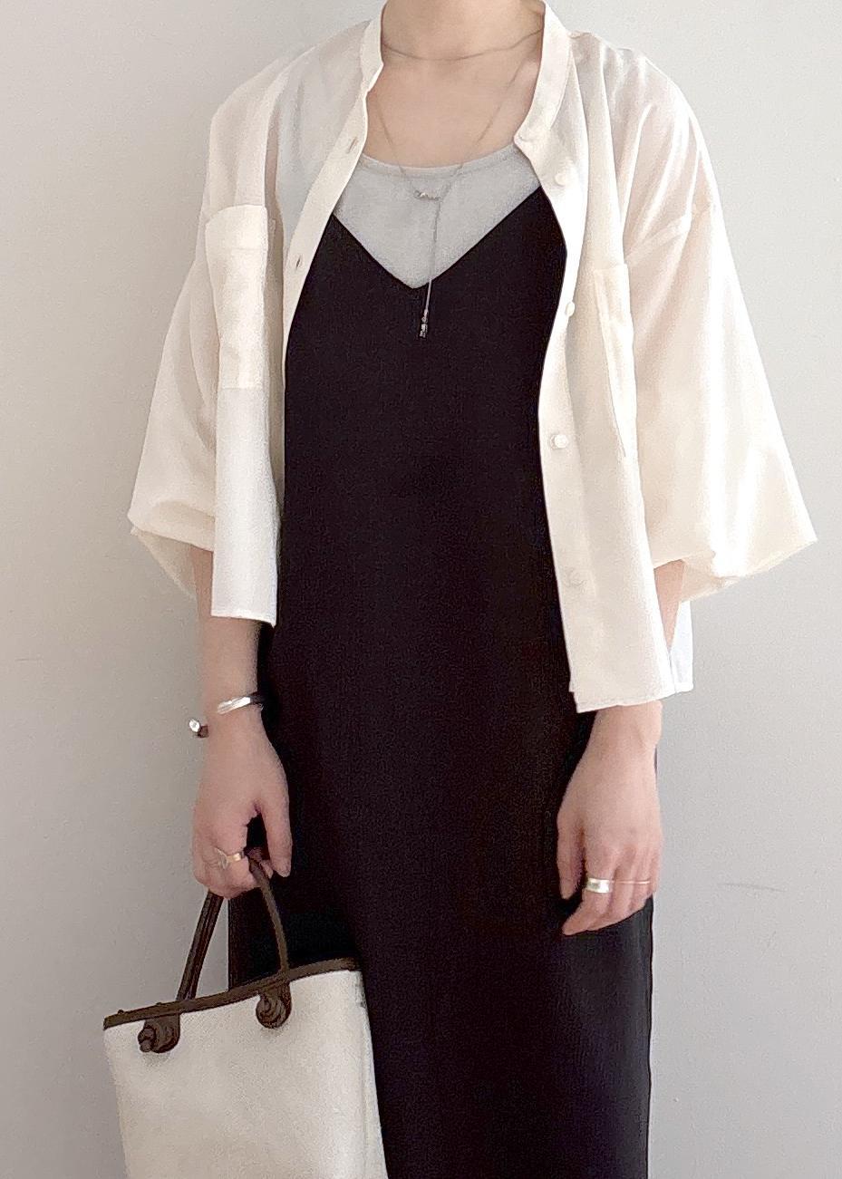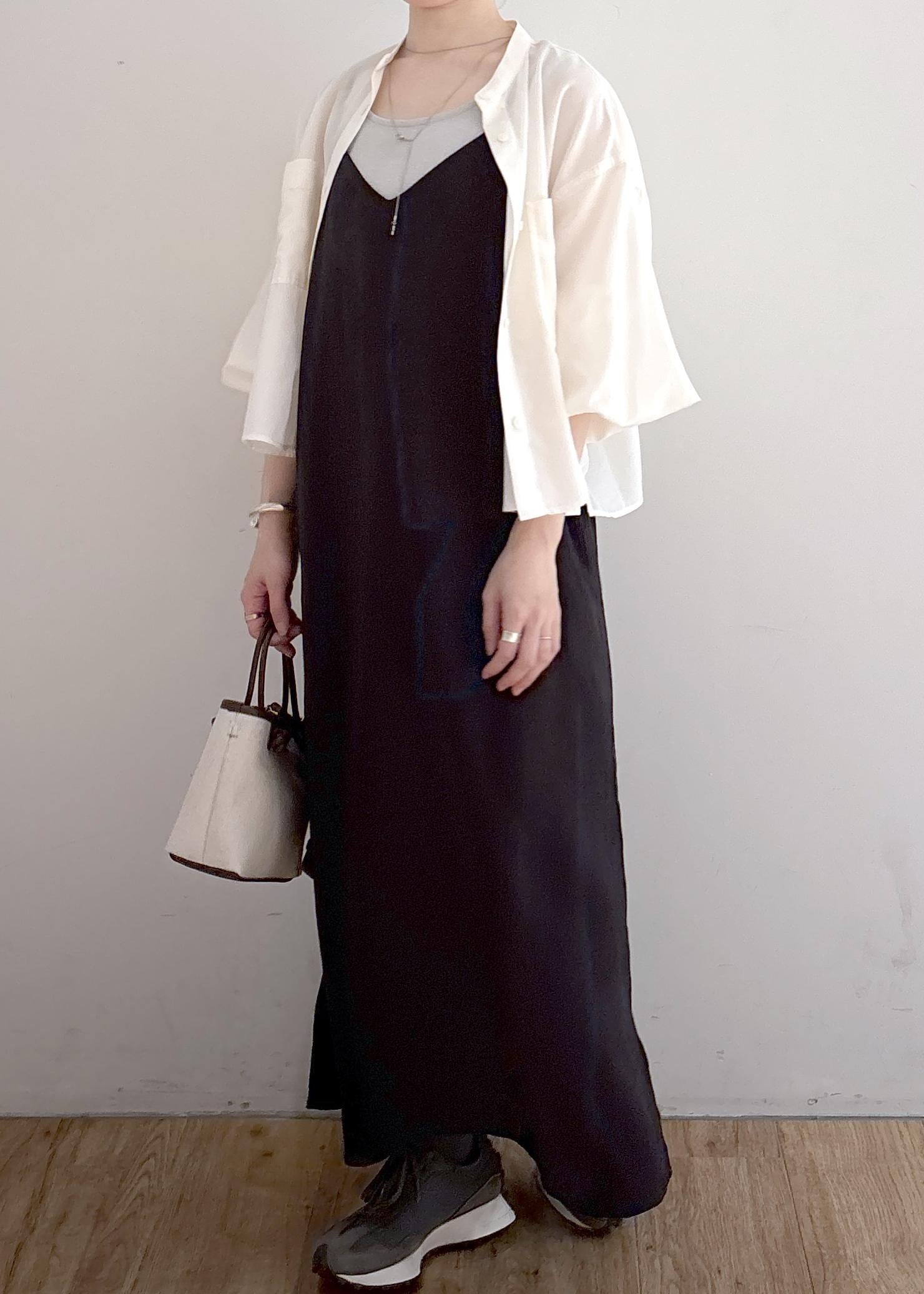 シアーのシャツにキャミワンピを合わせた楽ちんコーディネートです。ワンピは肩紐の調節ができるので短めに着て下にパンツなどを合わせても可愛いです◎