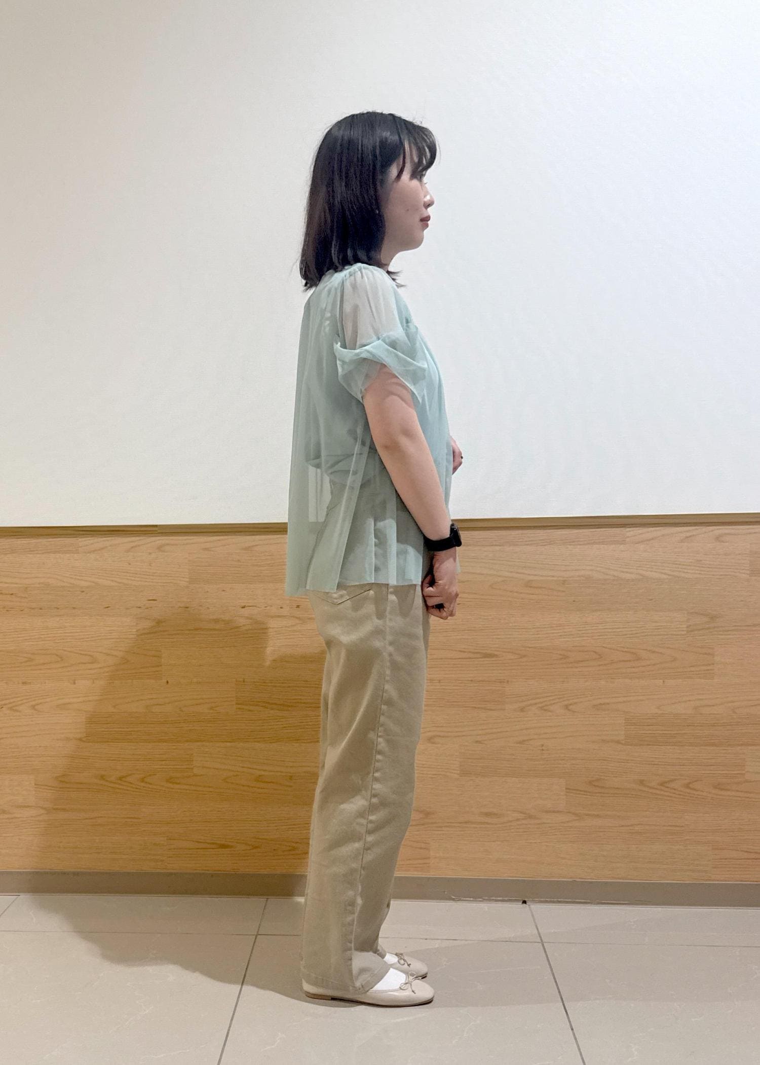 私のおすすめは柔らかい素材なので、デニムやチノパン、カーゴパンツなど硬めの素材やメンズライクなボトムスと合わせると甘めになりすぎないです。 -
