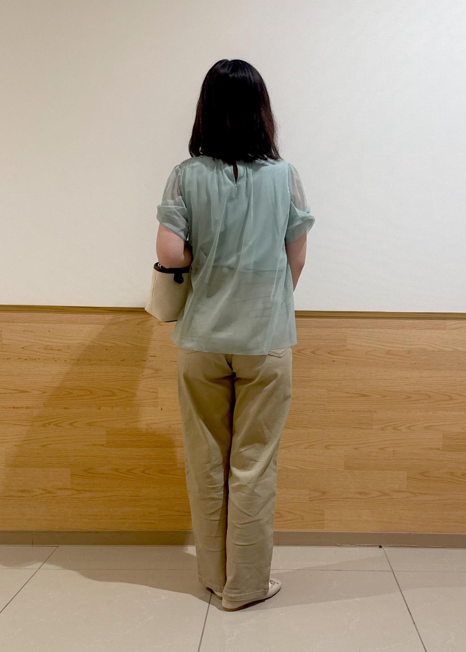 軽やかなチュールカットソーに、ストレートシルエットのマムデニムを合わせたきれいめカジュアルコーデです。