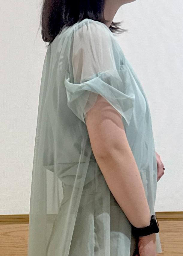 裾に向かって広がっているデザインで着心地はゆったりとしていて、また袖もそこまで締め付け感が無いです。