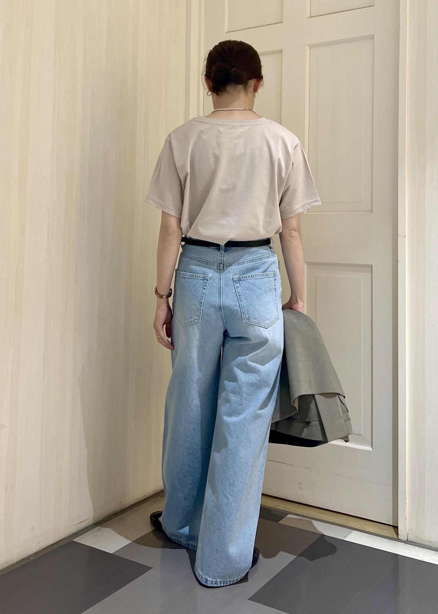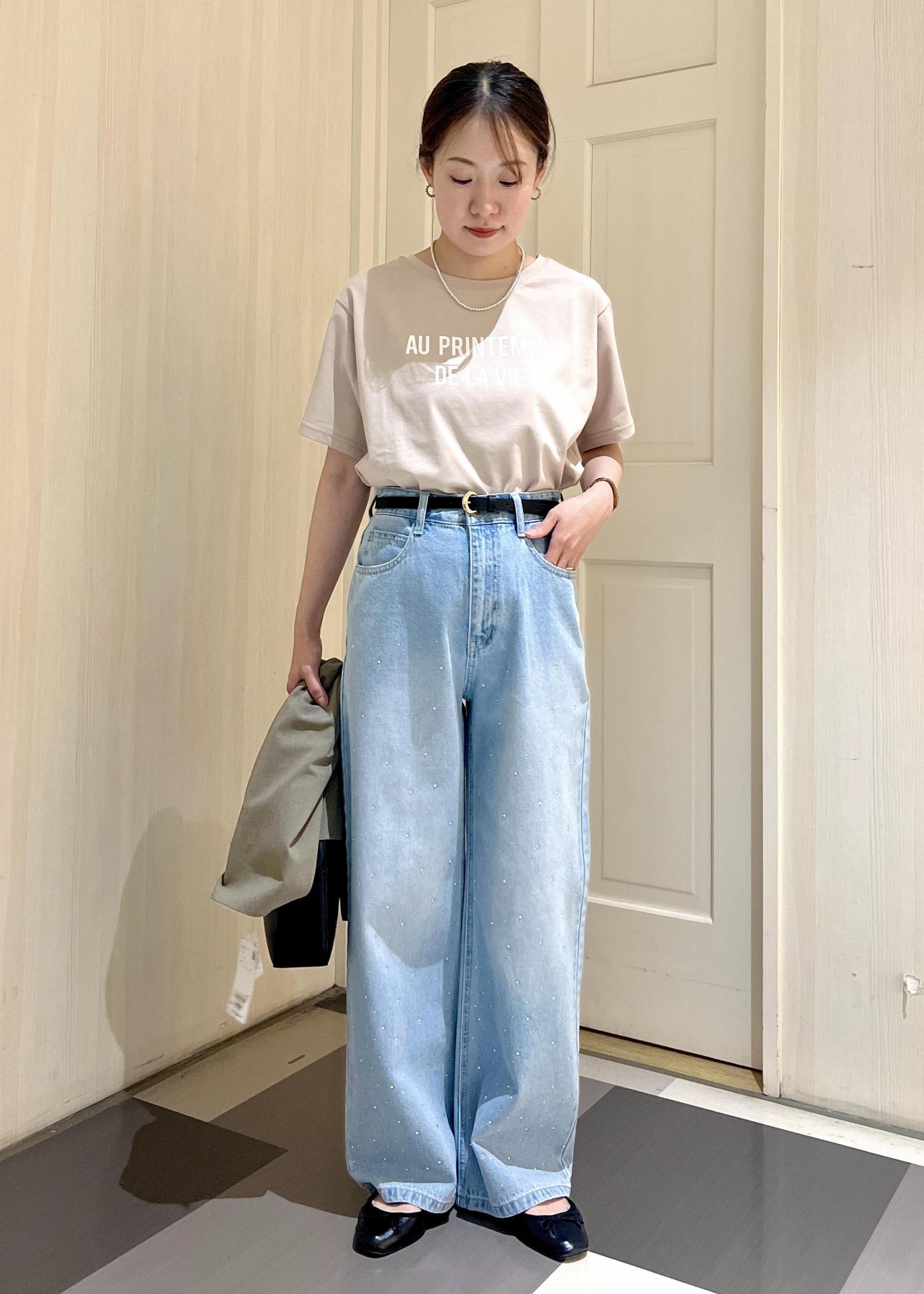 シンプルなTシャツコーデですが、ビジューのデニムパンツで大人な印象に!