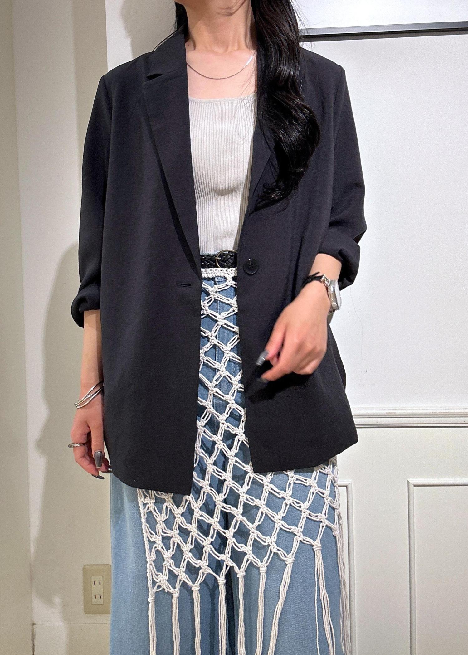 黒のジャケットを羽織ることで全体を引き締めつつ、