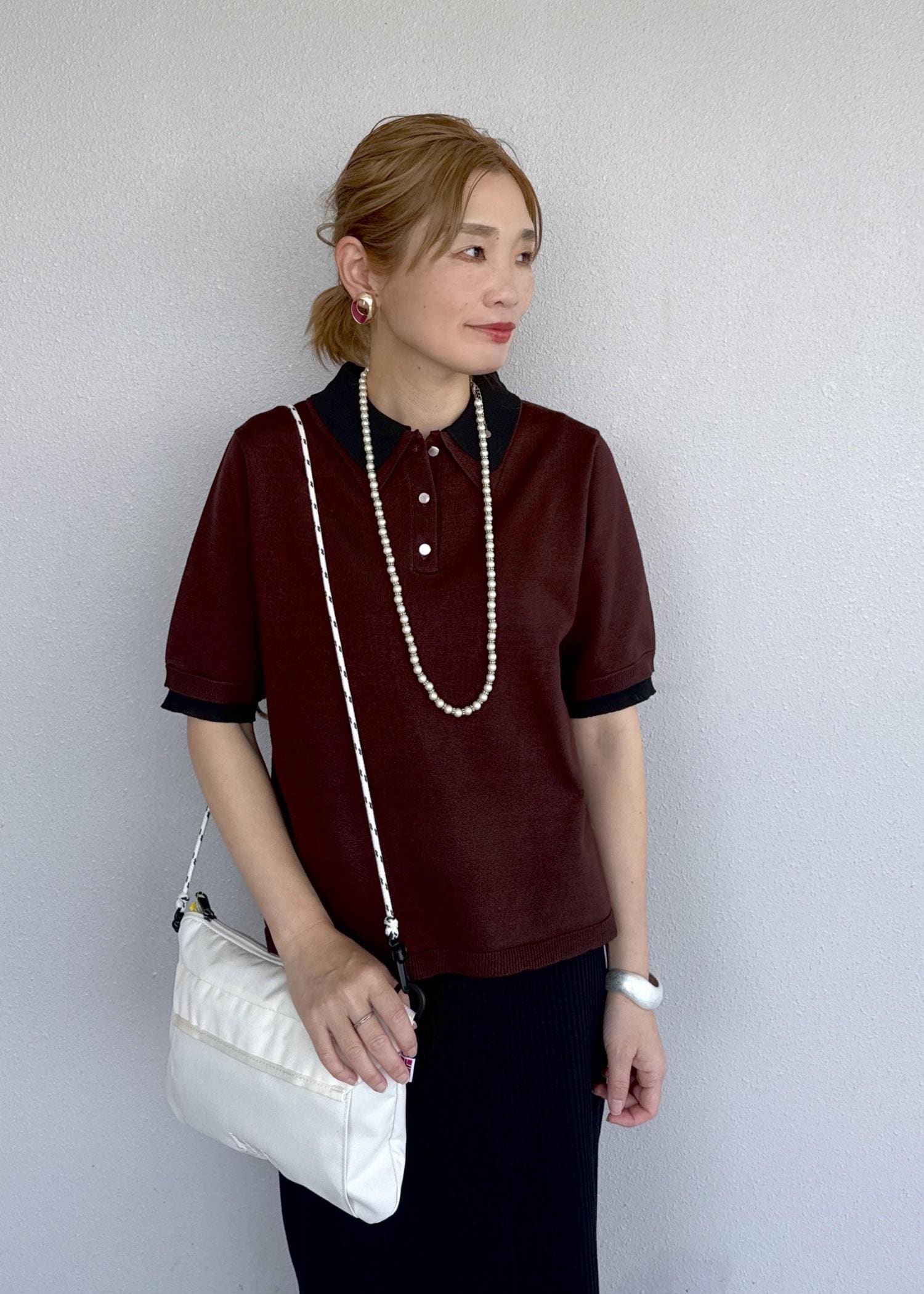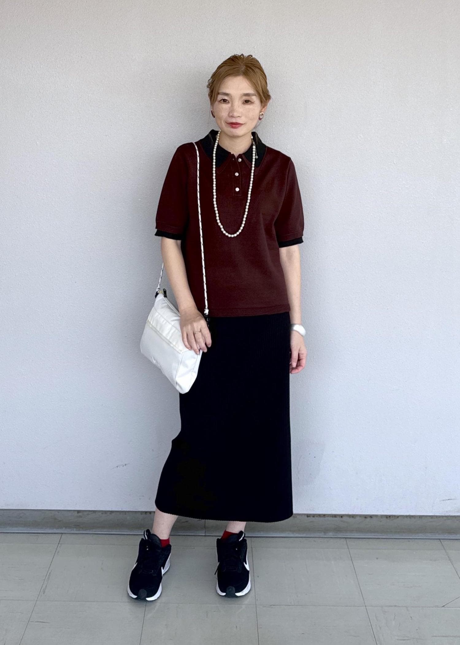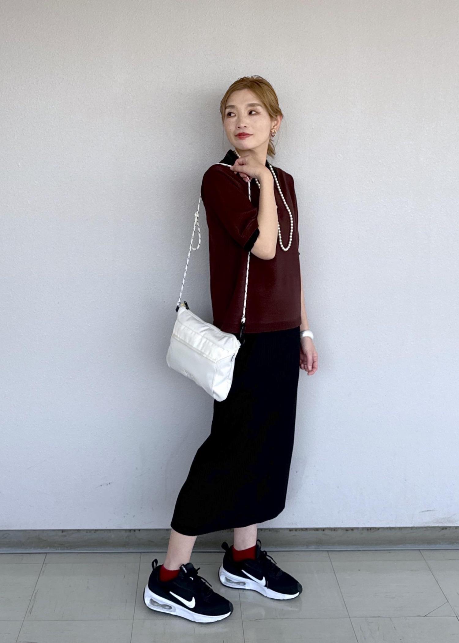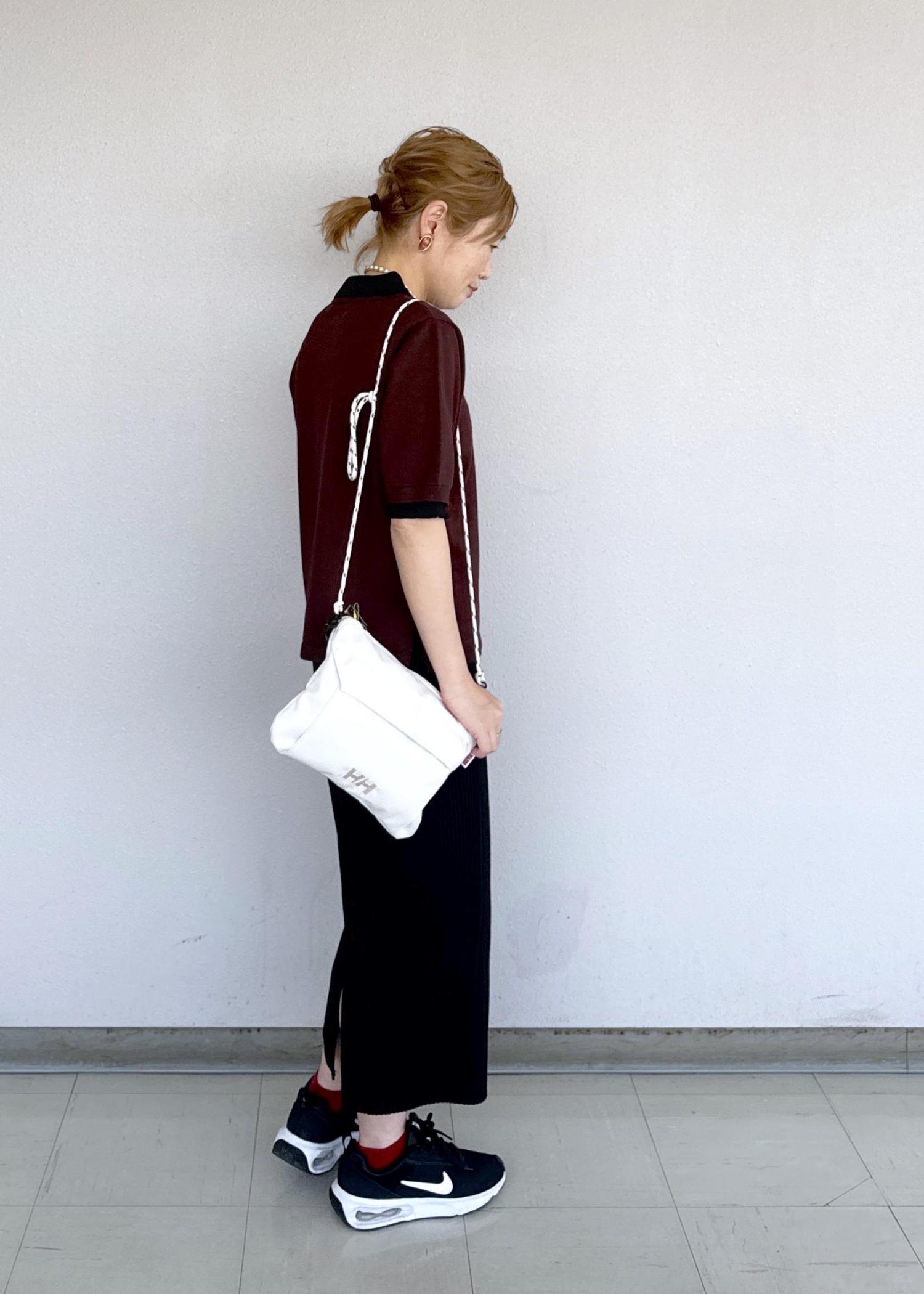 レイヤード風な襟が可愛いレトロなポロシャツにスッキリとしたアイラインスカートを合わせたコーディネートです。