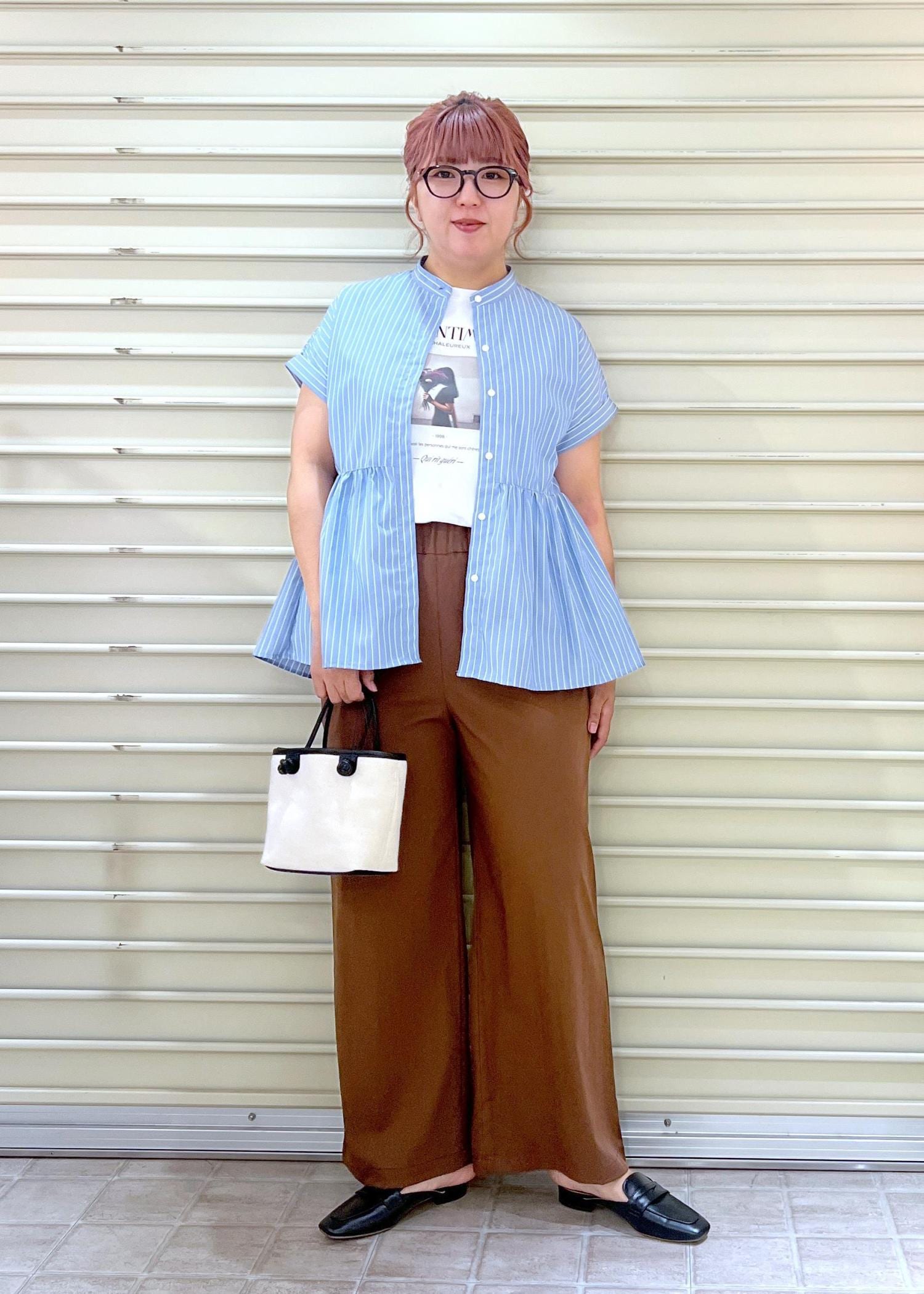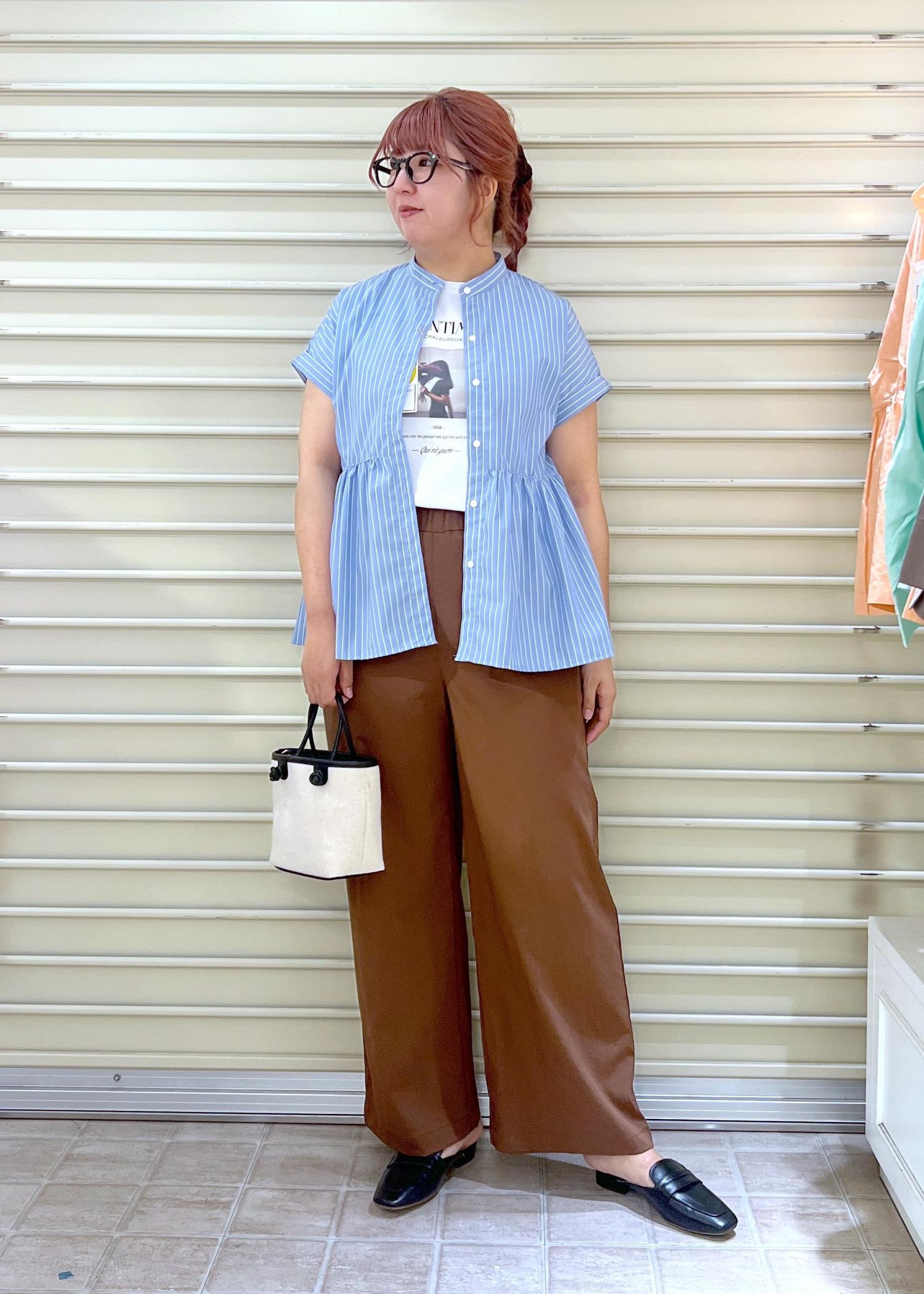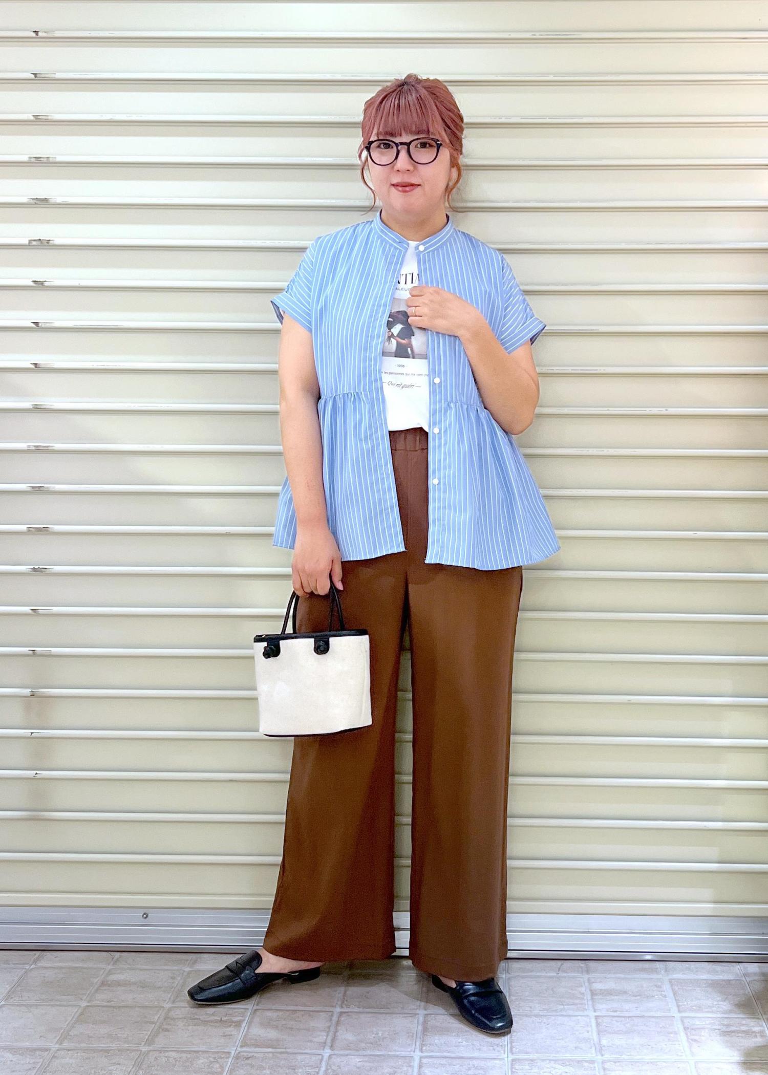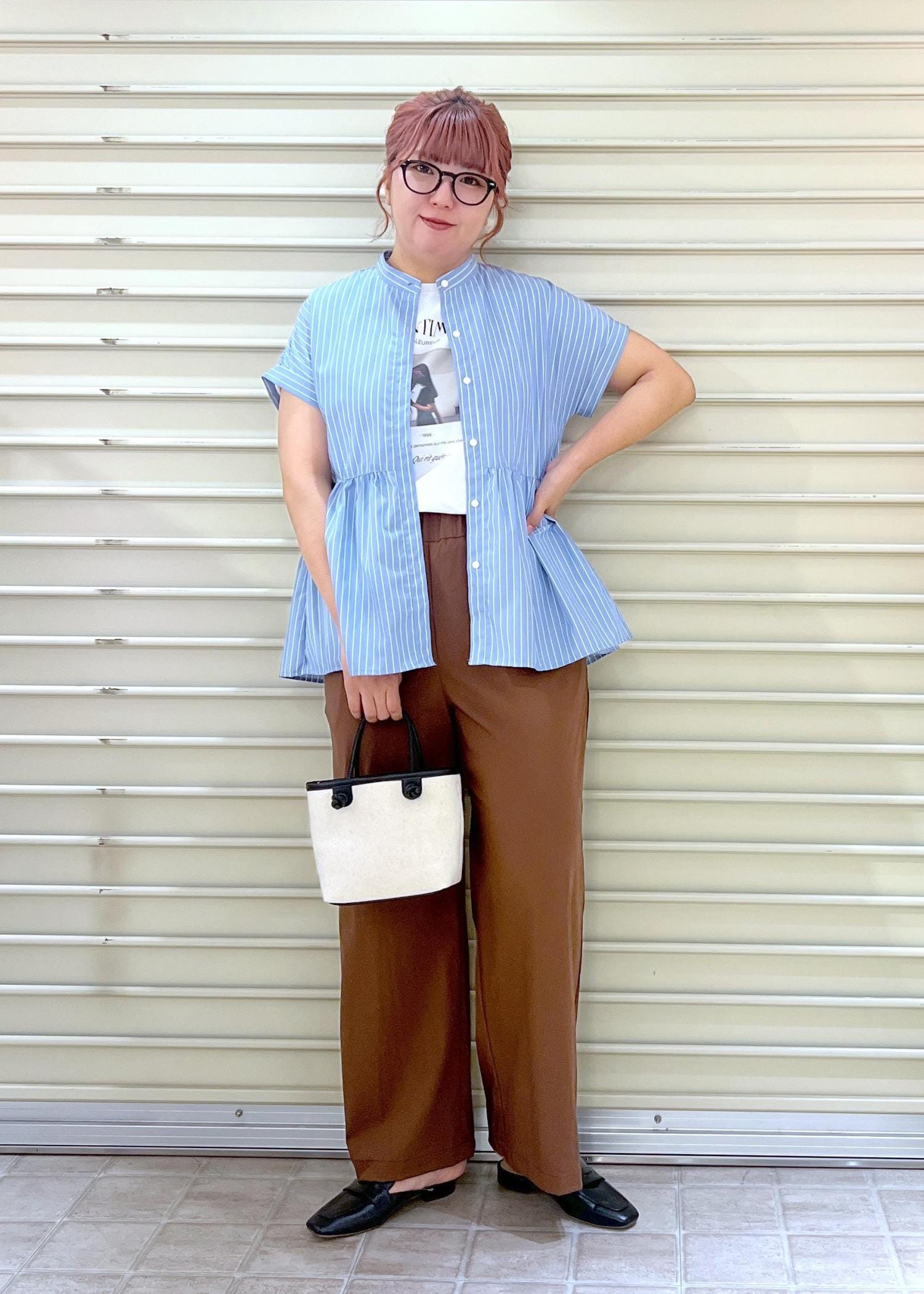 ブルー×ブラウンで初夏の爽やかコーデです。