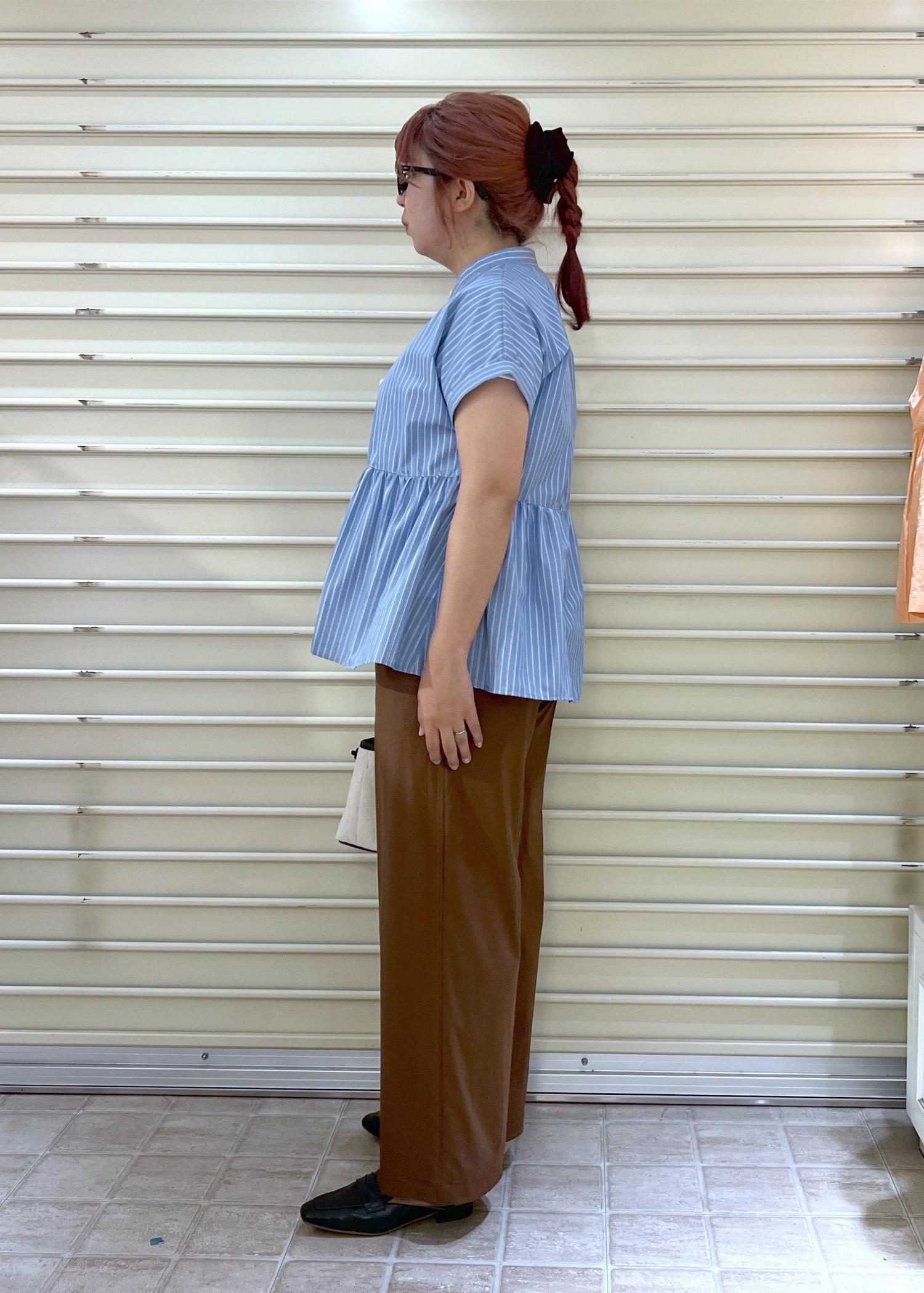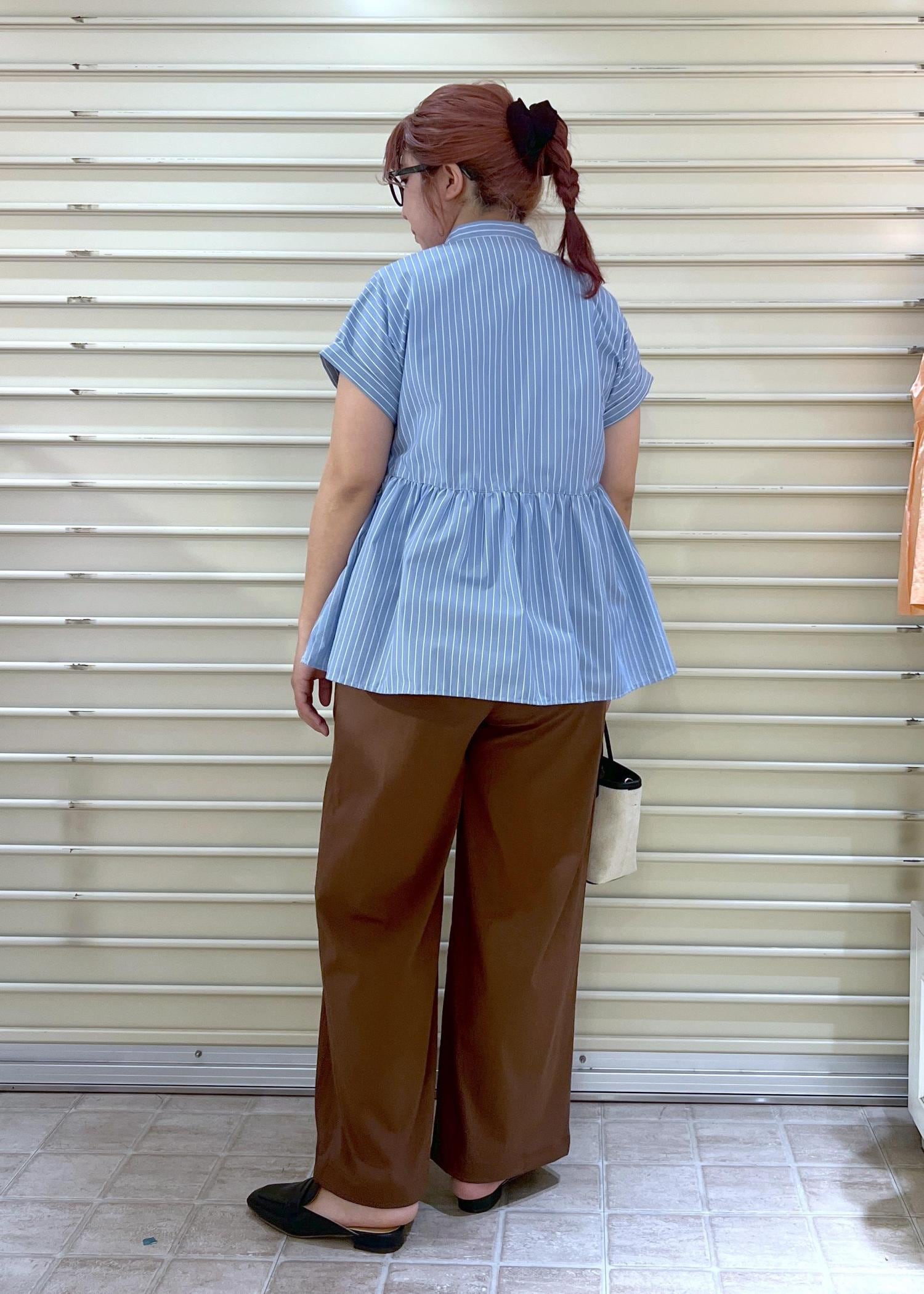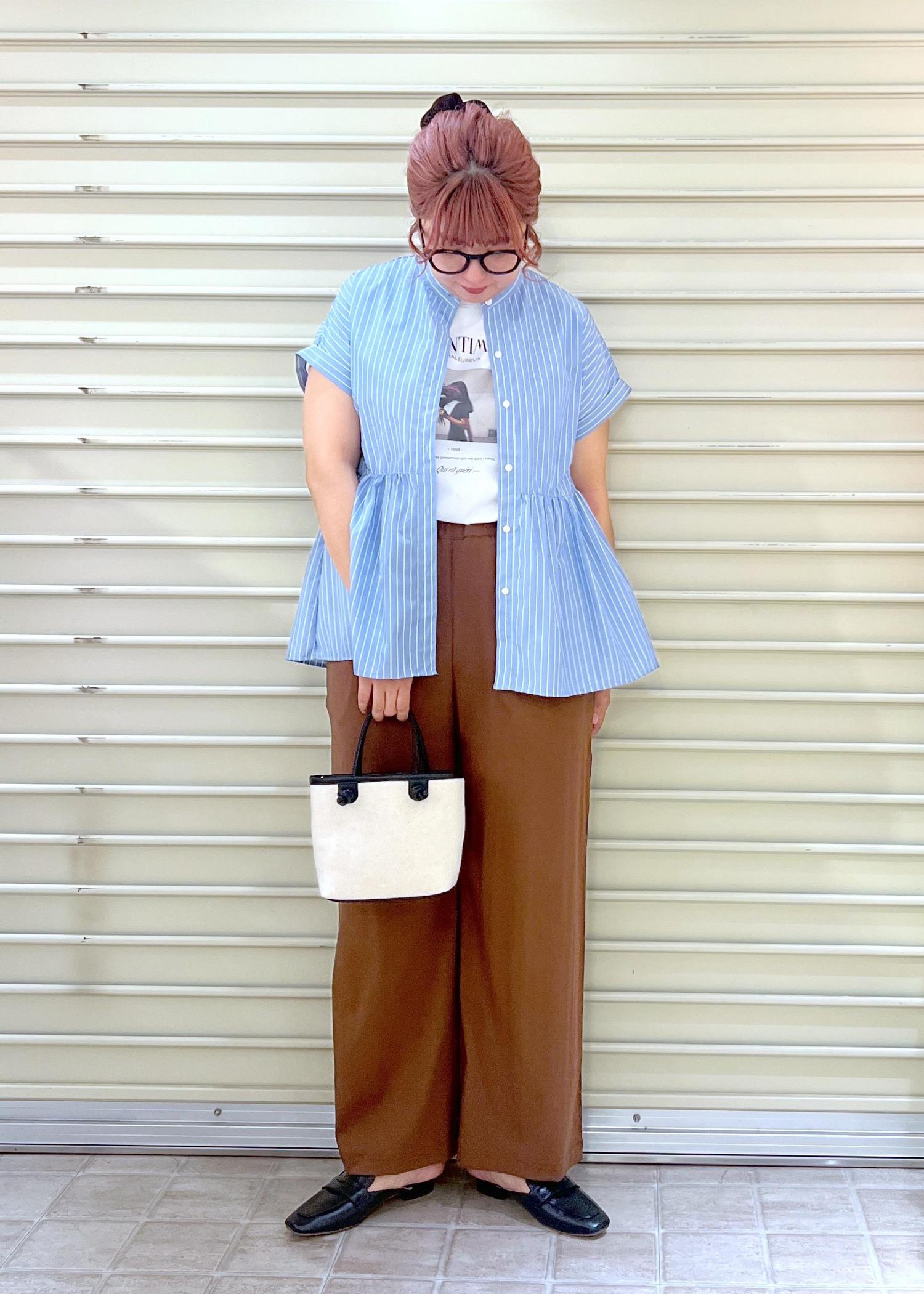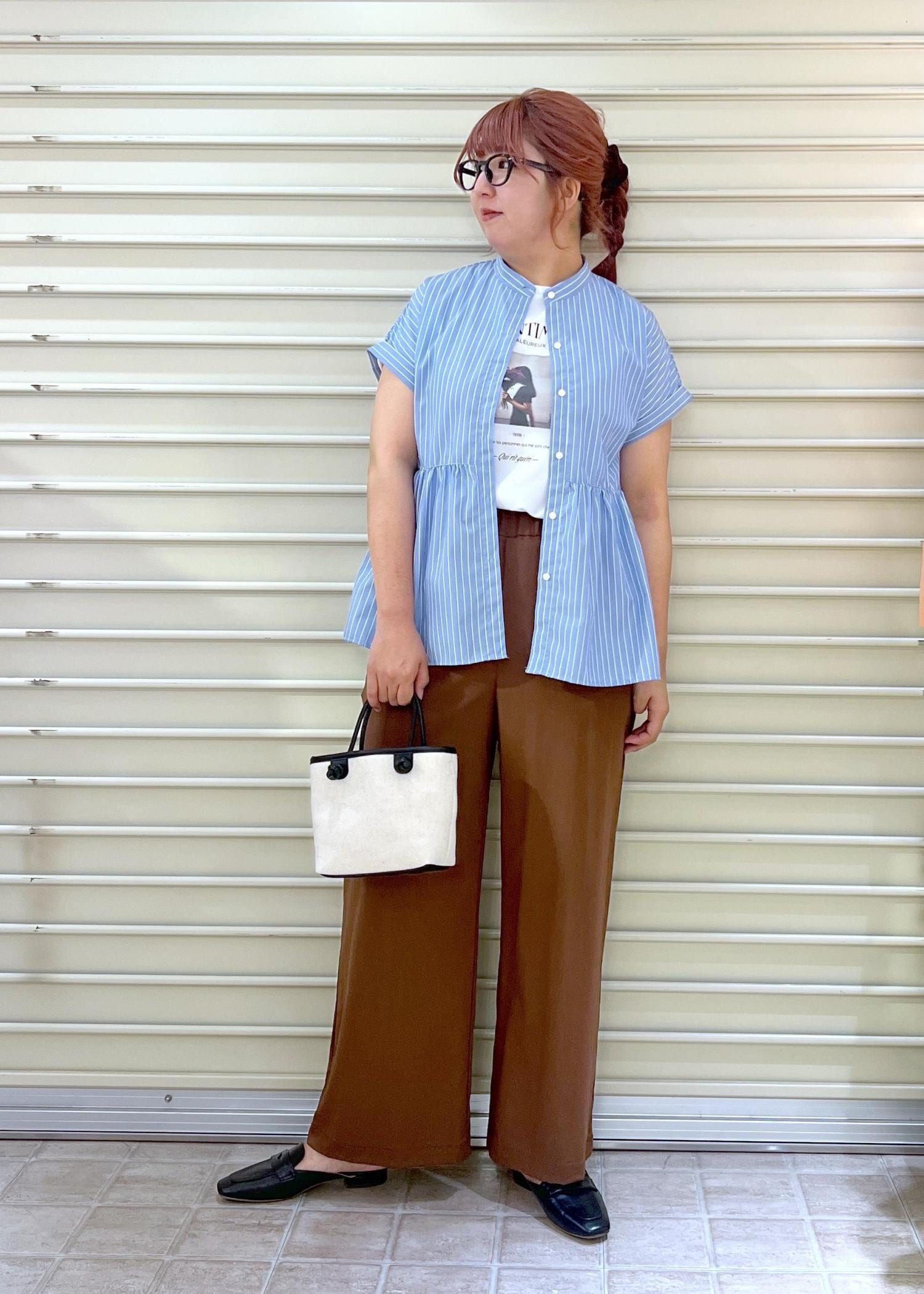 ブルー×ブラウンで初夏の爽やかコーデです。