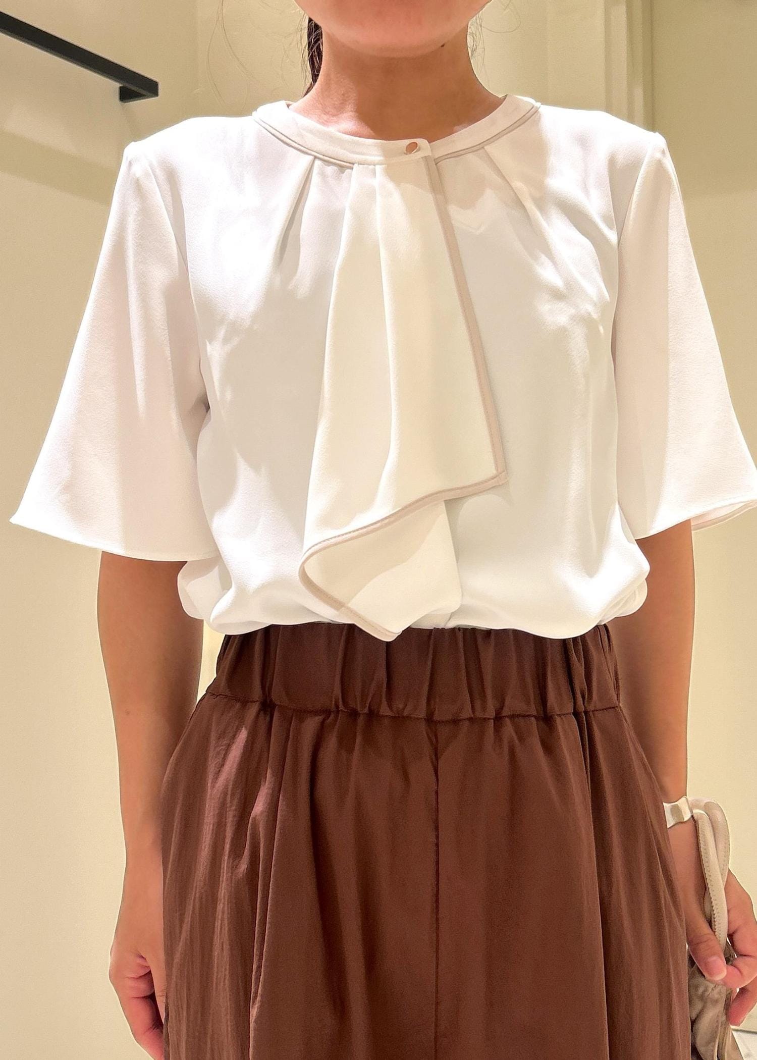 【WEB限定サイズ】配色ボウタイ風ハーフスリーブブラウス/通勤対応