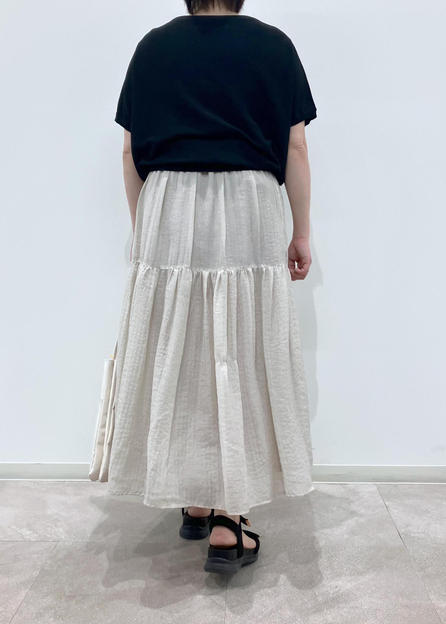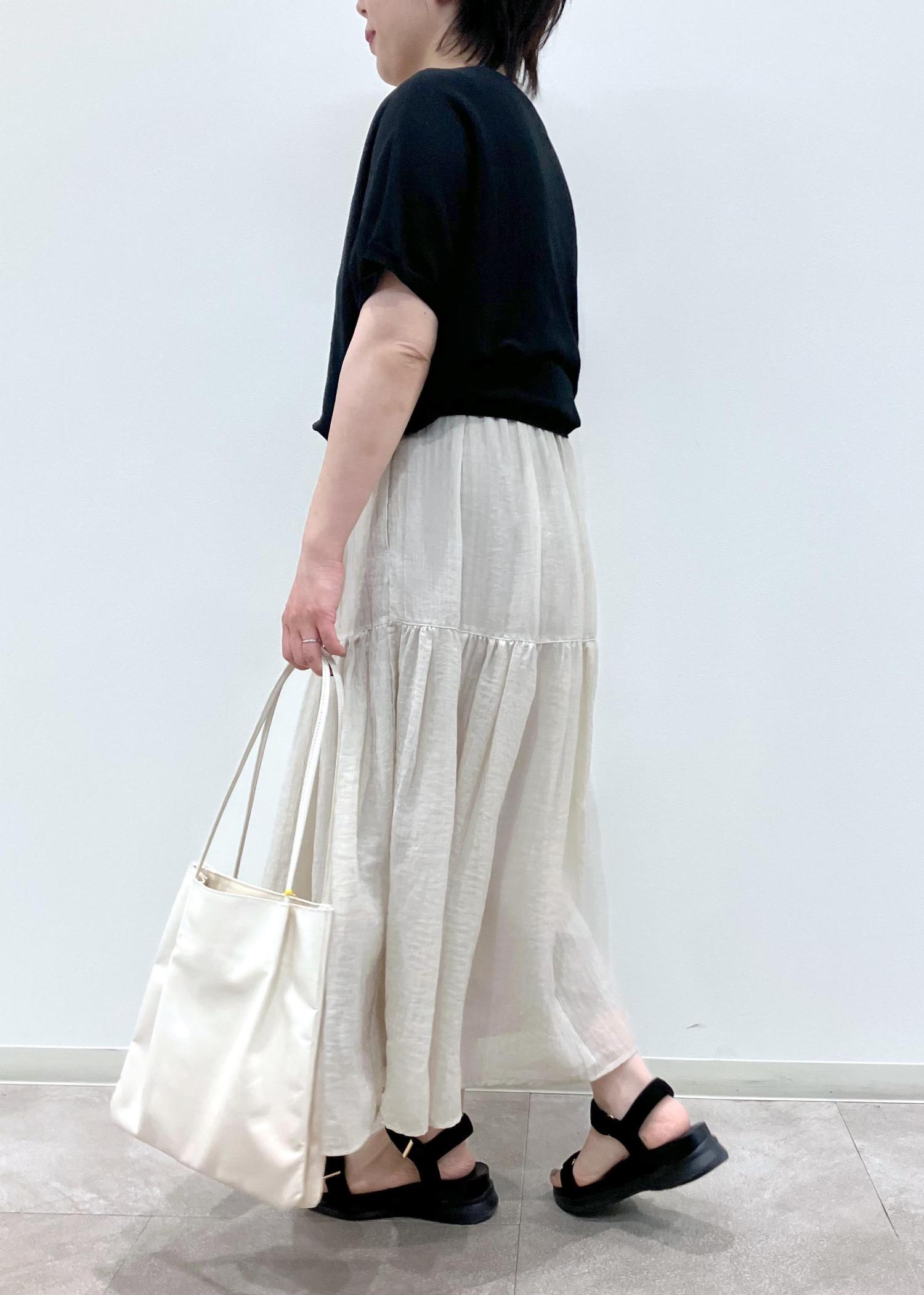 Comfort Seriesコンフォートシリーズの二の腕が隠れるニットにティアードスカートをコーディネートしました。