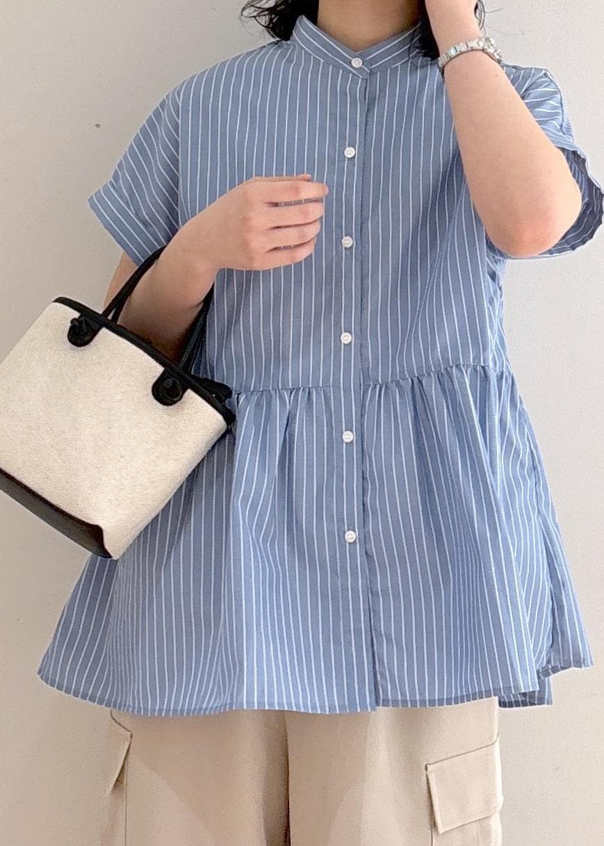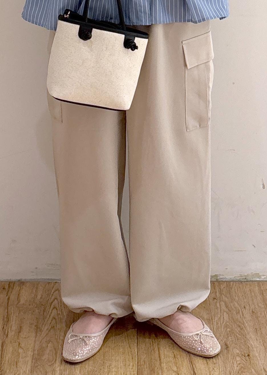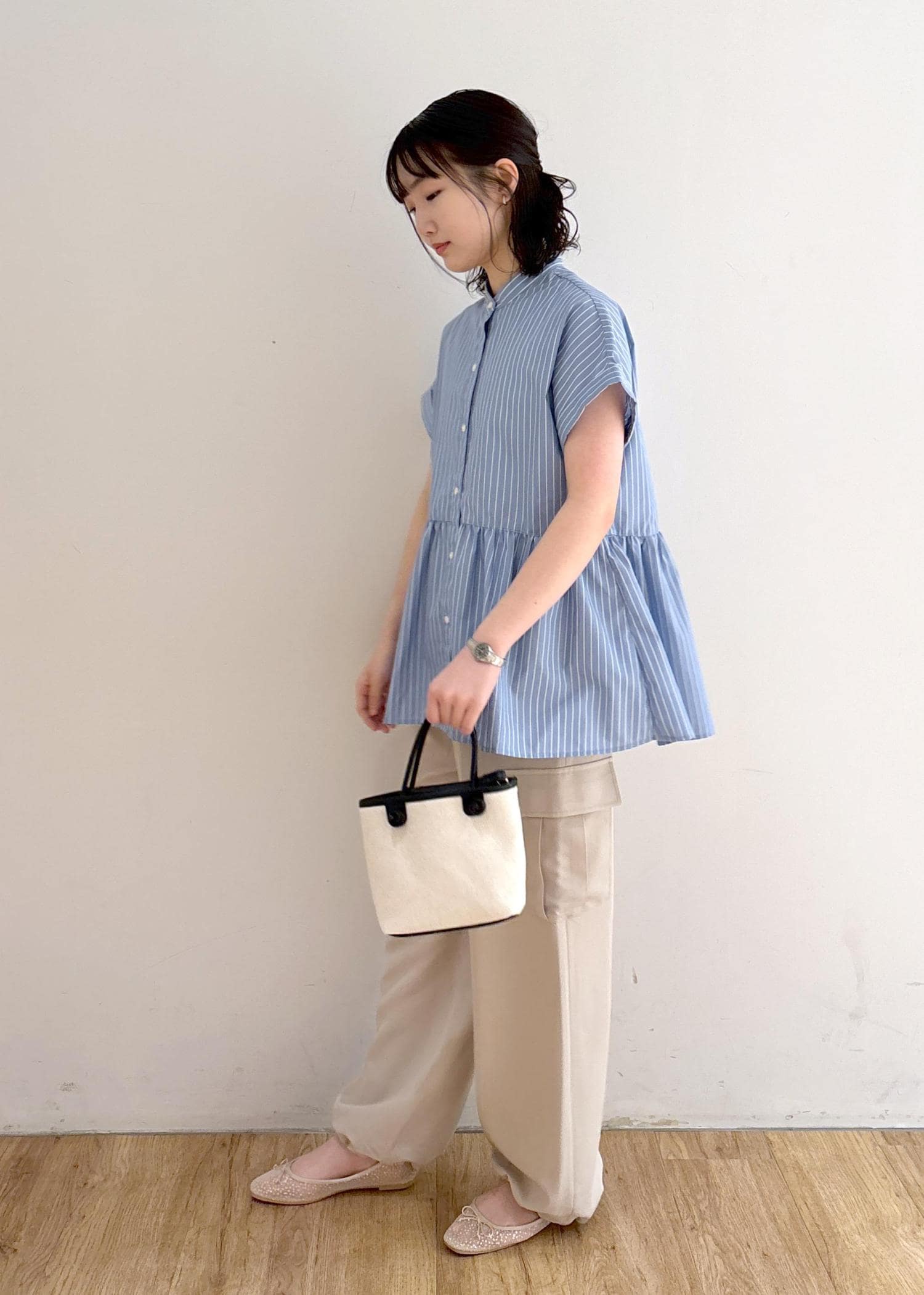 これからの季節、万能なストライプの涼しげなブラウスを使ったヘルシーなコーディネートにしてみました!ドローコード絞めるとカーゴパンツにも緩めるとワイドストレートで綺麗めに合わせやすいパンツでおすすめです。足元は柔らかい色みで明るく季節感を出せます!