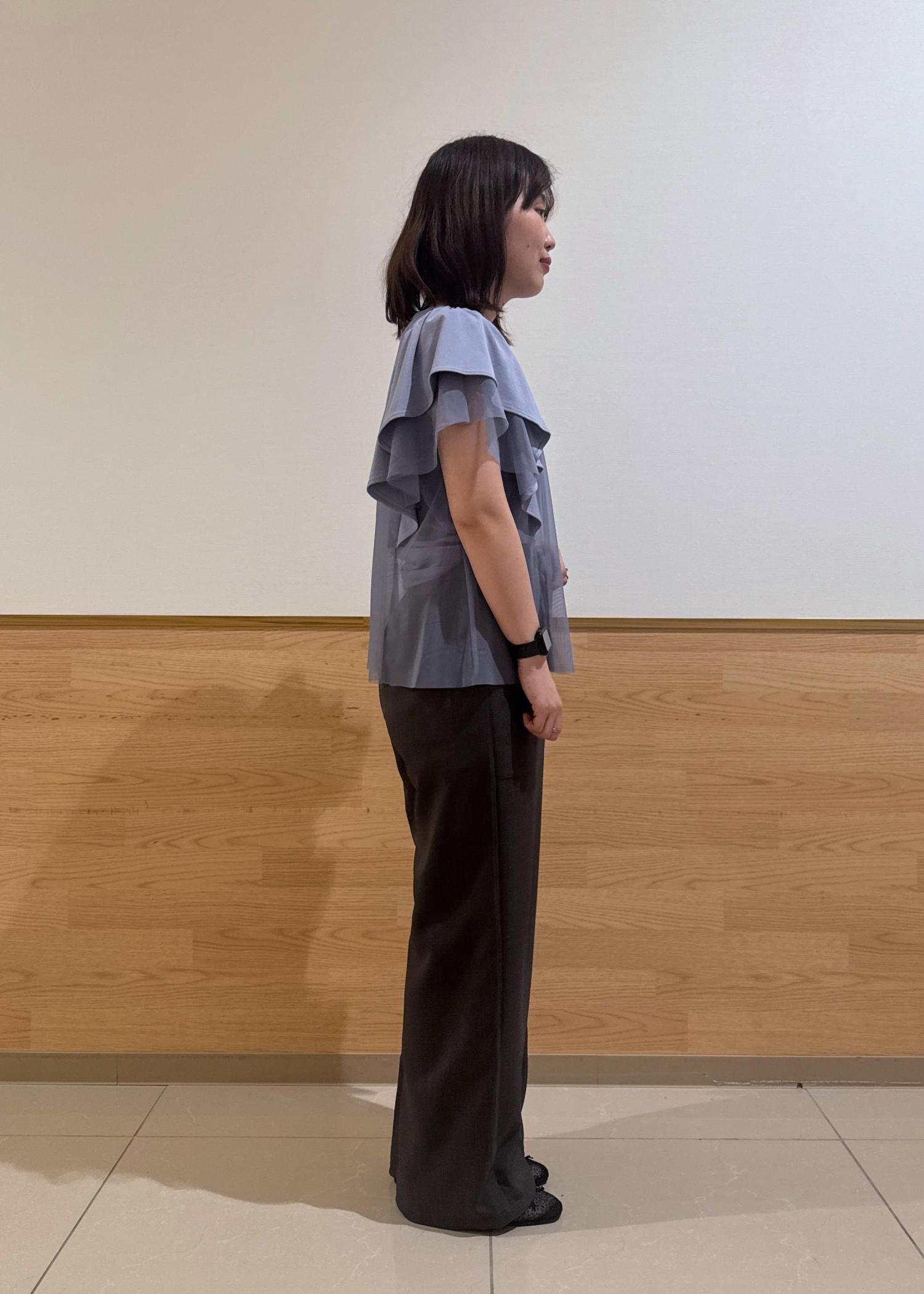 袖がフリルでチュール素材なカットソーですが、チャコールのパンツでカチッとして、甘めになりすぎないように仕上げました。