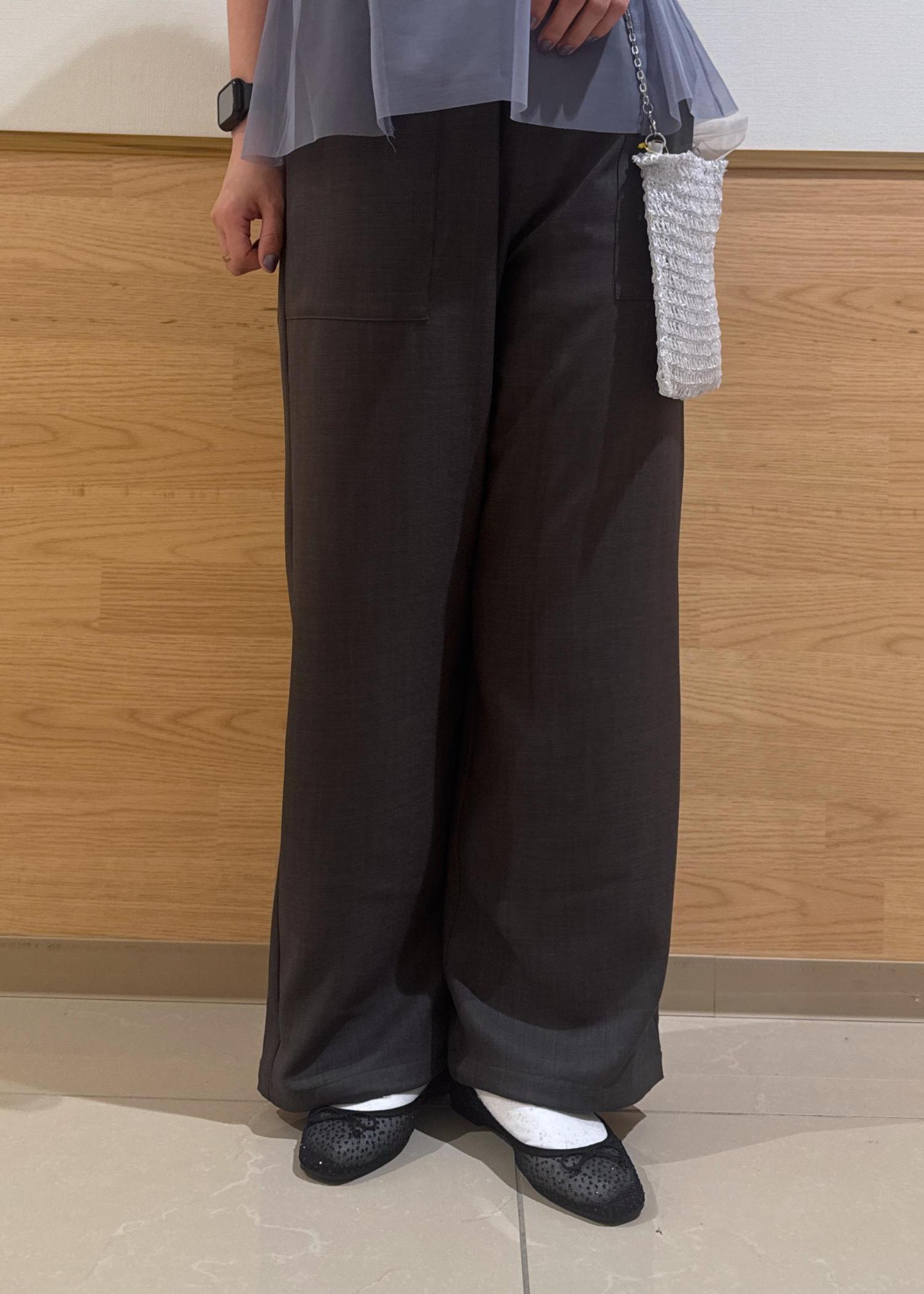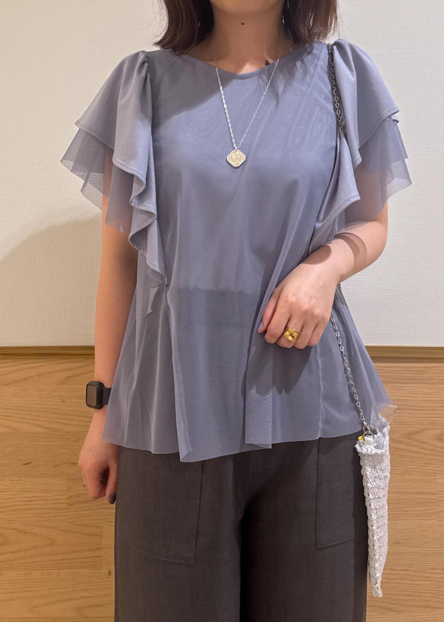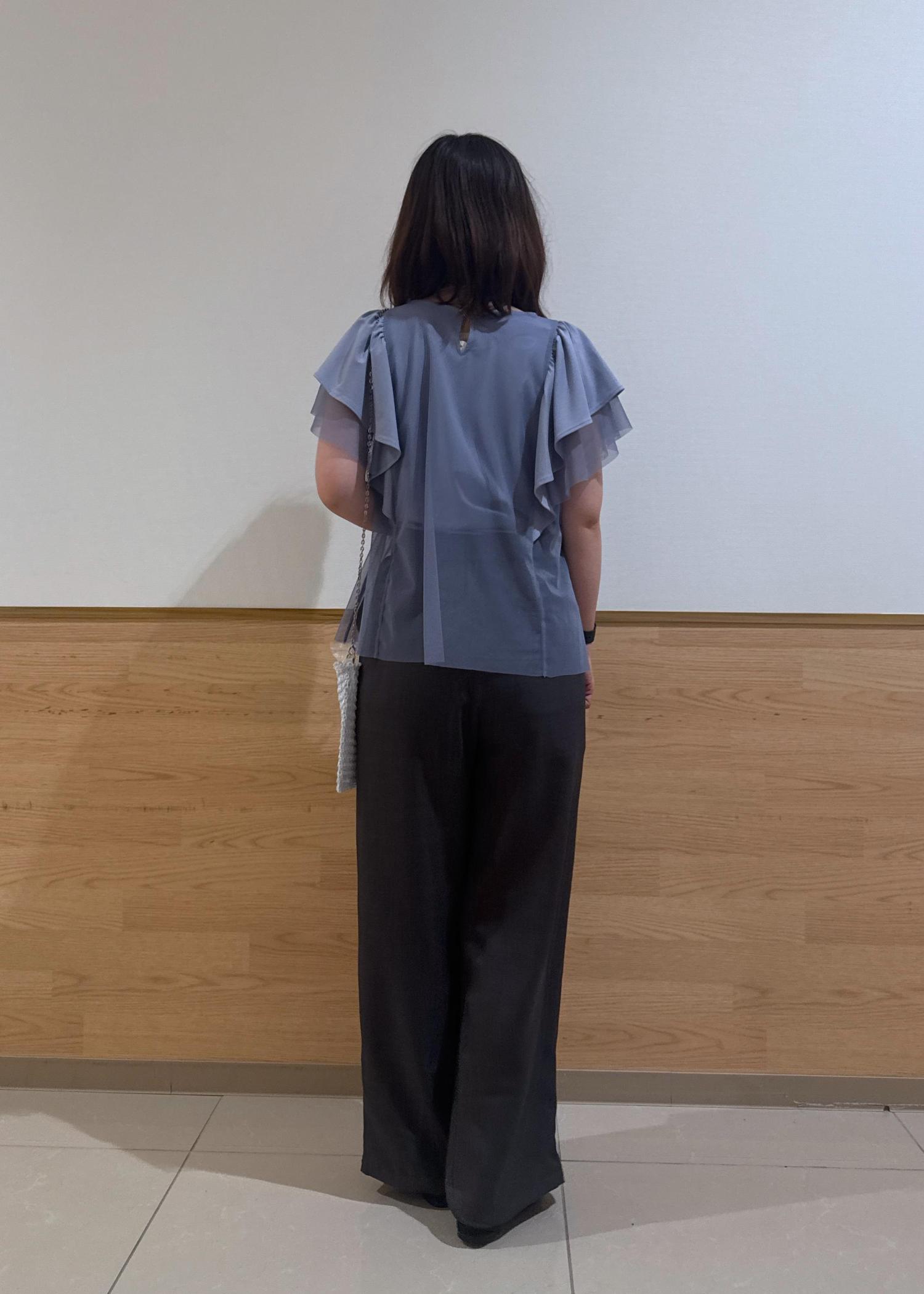 きれいめなチュールカットソーに、チャコールのイージーワイドパンツを合わせたきれいめカジュアルコーデです。