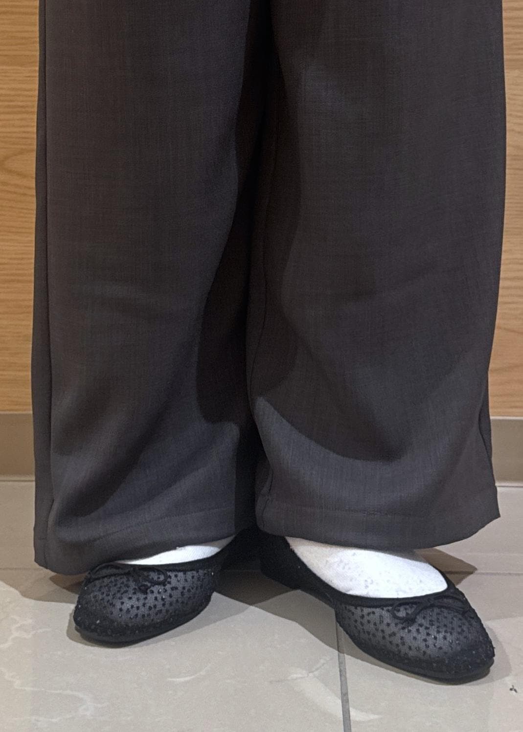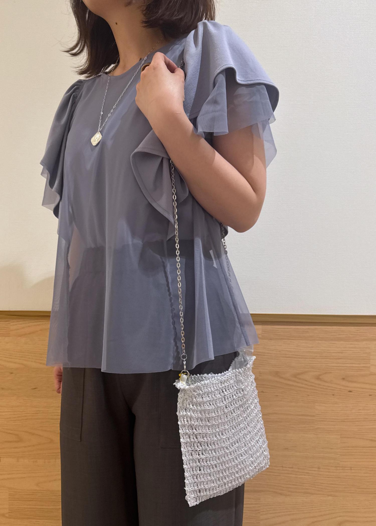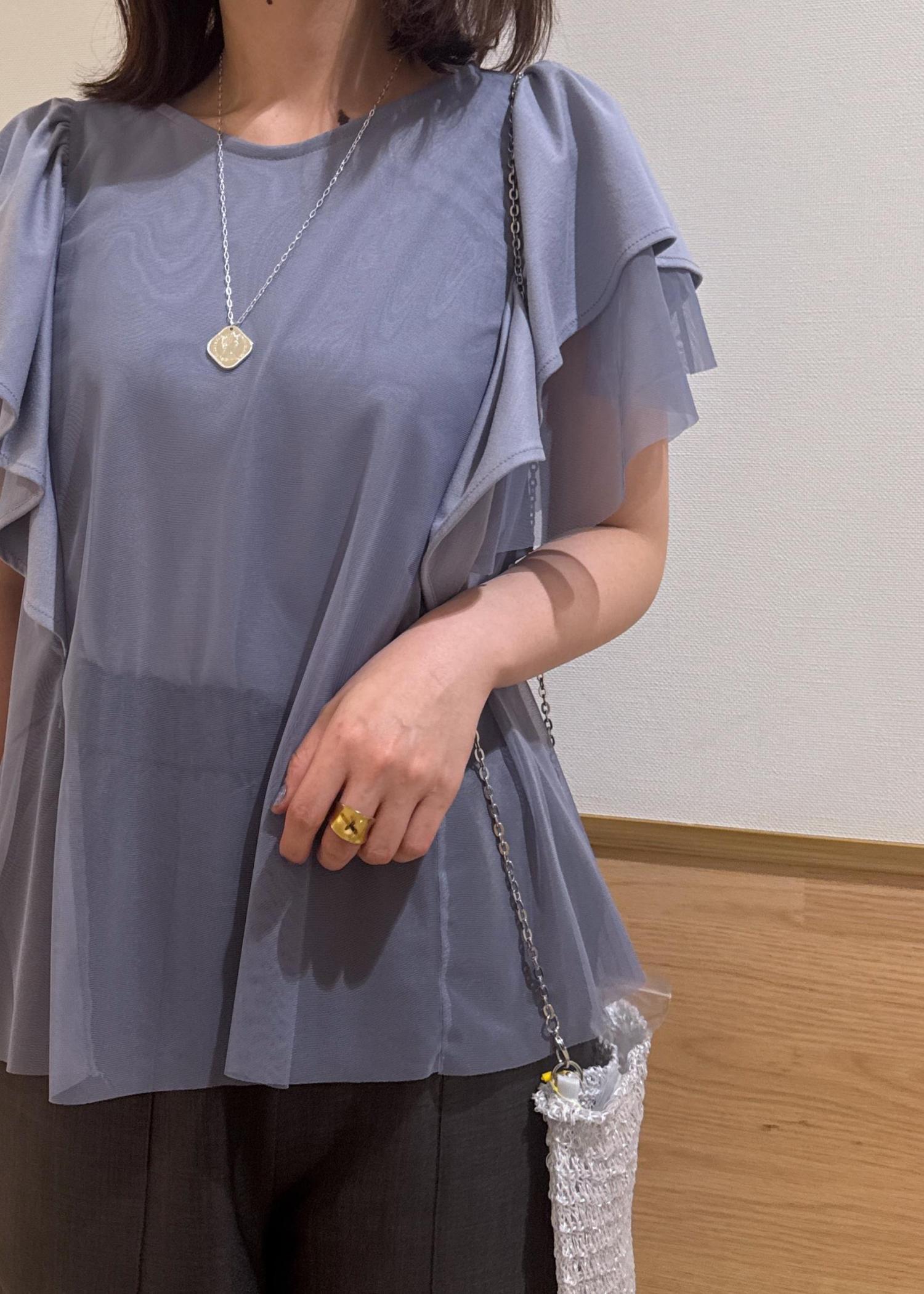 きれいめなチュールカットソーに、チャコールのイージーワイドパンツを合わせたきれいめカジュアルコーデです。