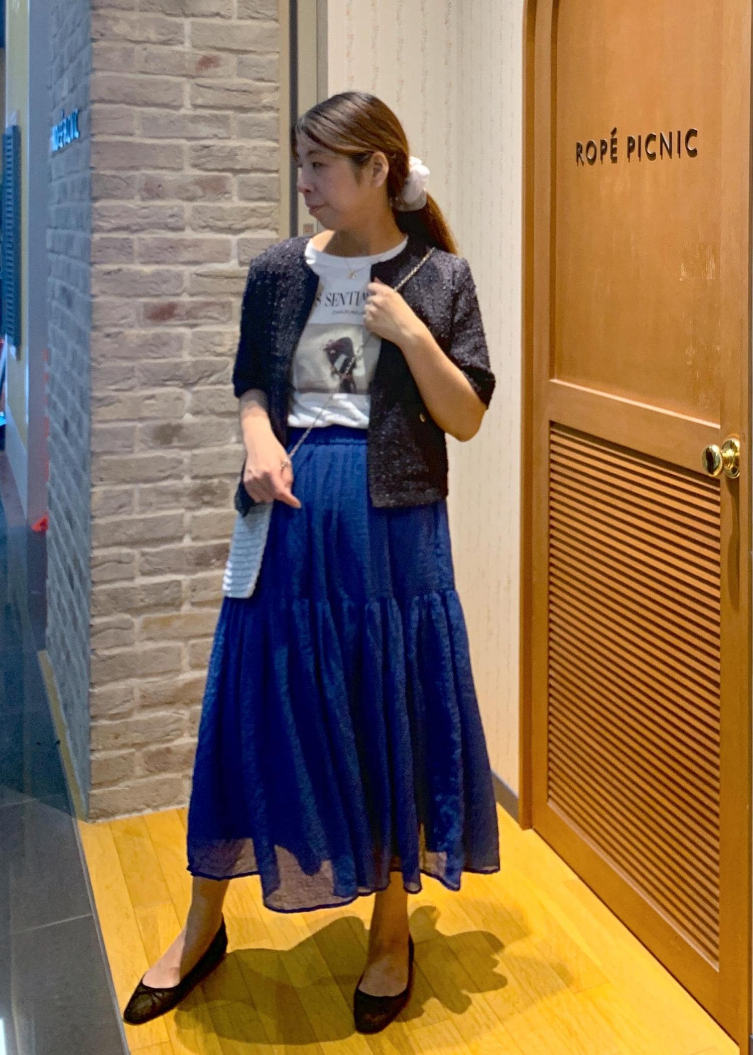 キレイめツィードカーディジャケットをフォトTとティアードスカートを合わせて、キレイめカジュアルなコーディネートにしてみました!