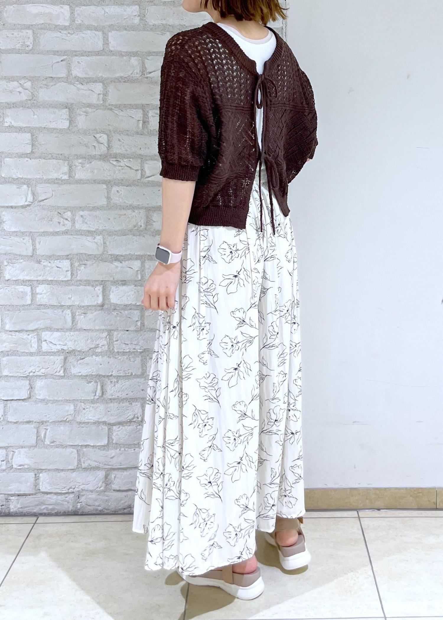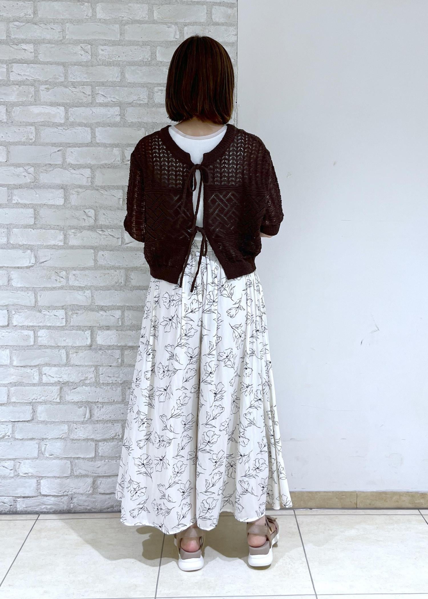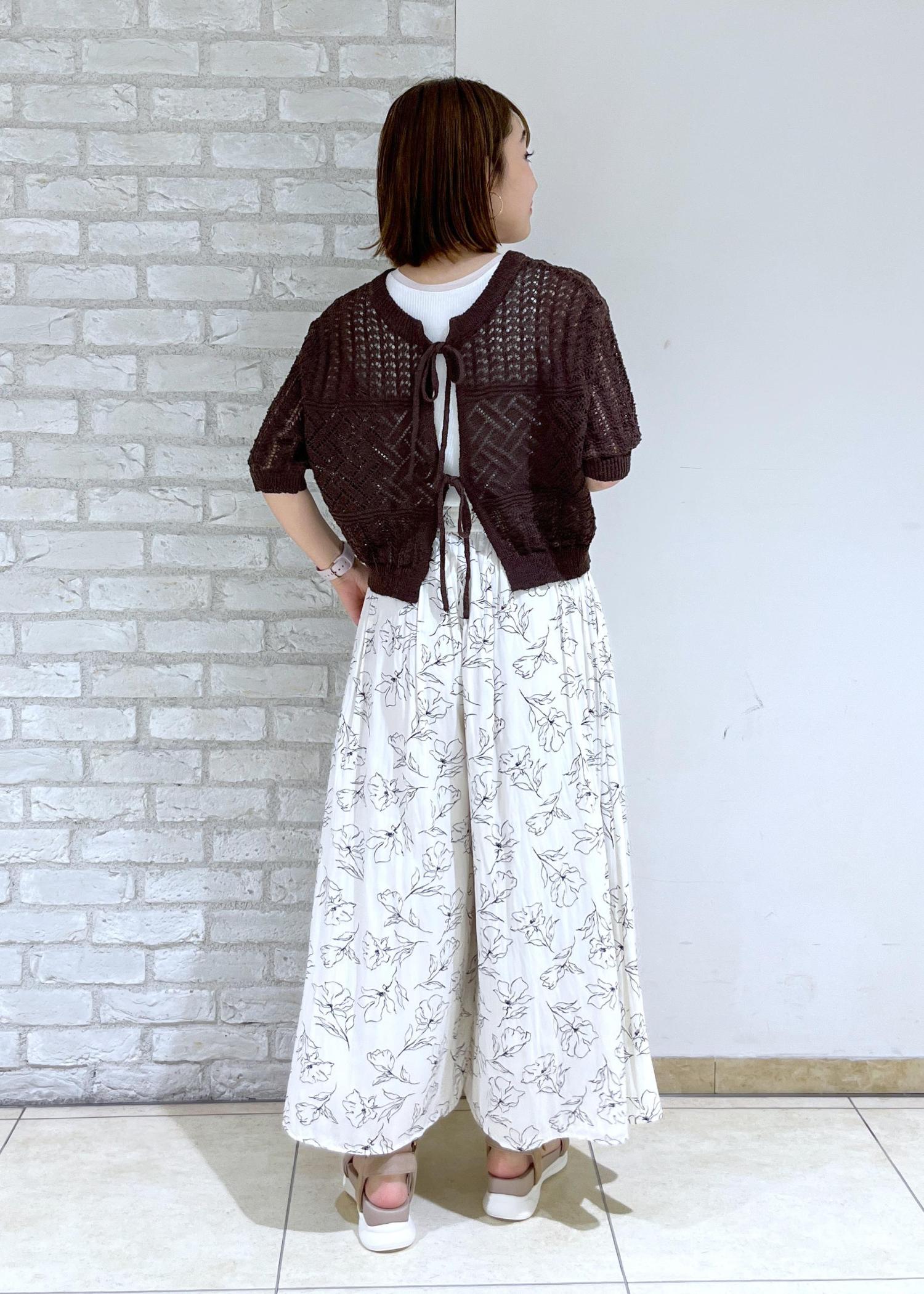 ブラウンの透かし編みカーディガンに花柄のスカーチョで合わせた大人カジュアルコーデ♪