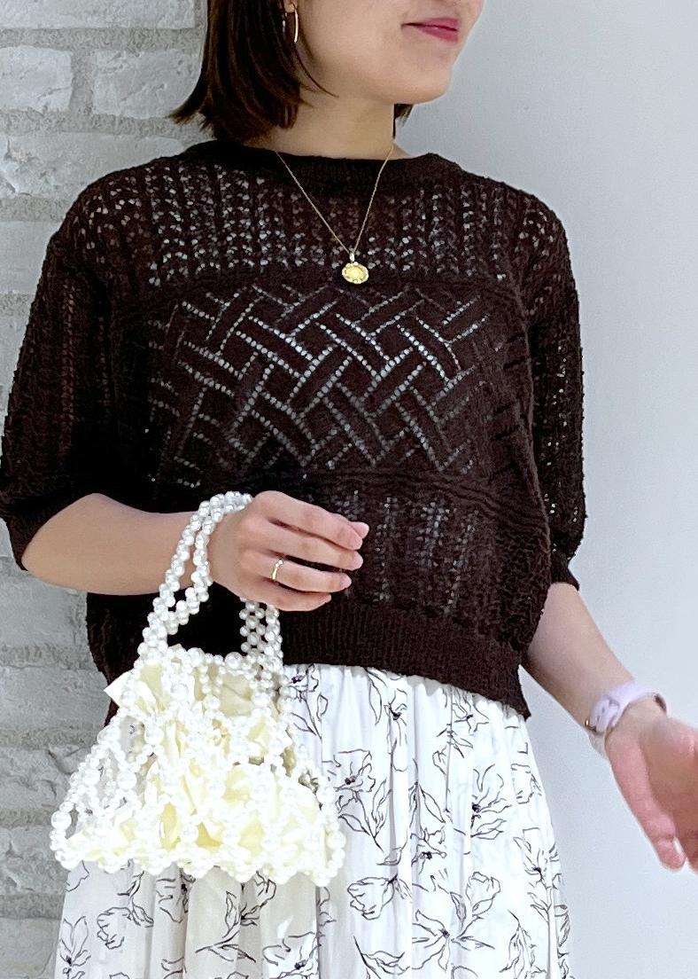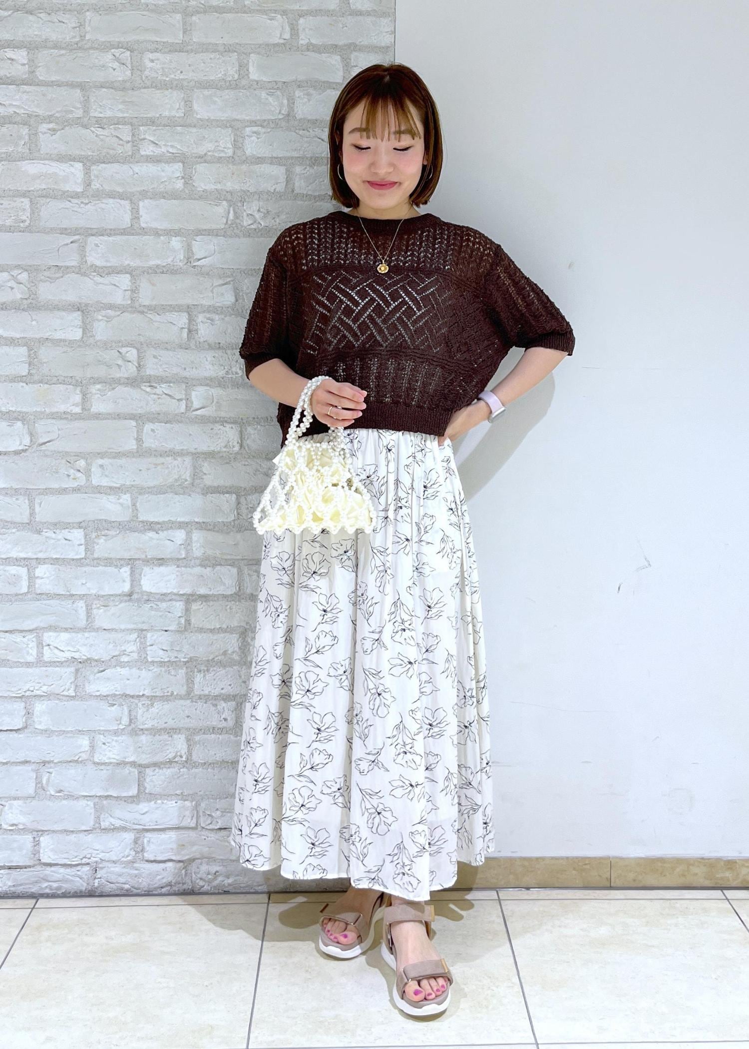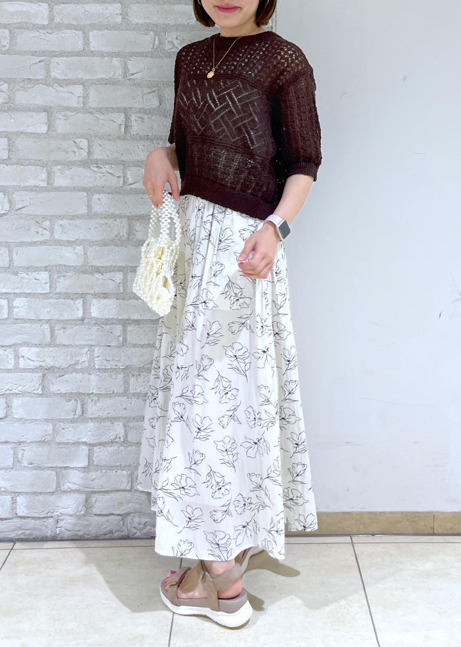 ブラウンの透かし編みカーディガンに花柄のスカーチョで合わせた大人カジュアルコーデ♪