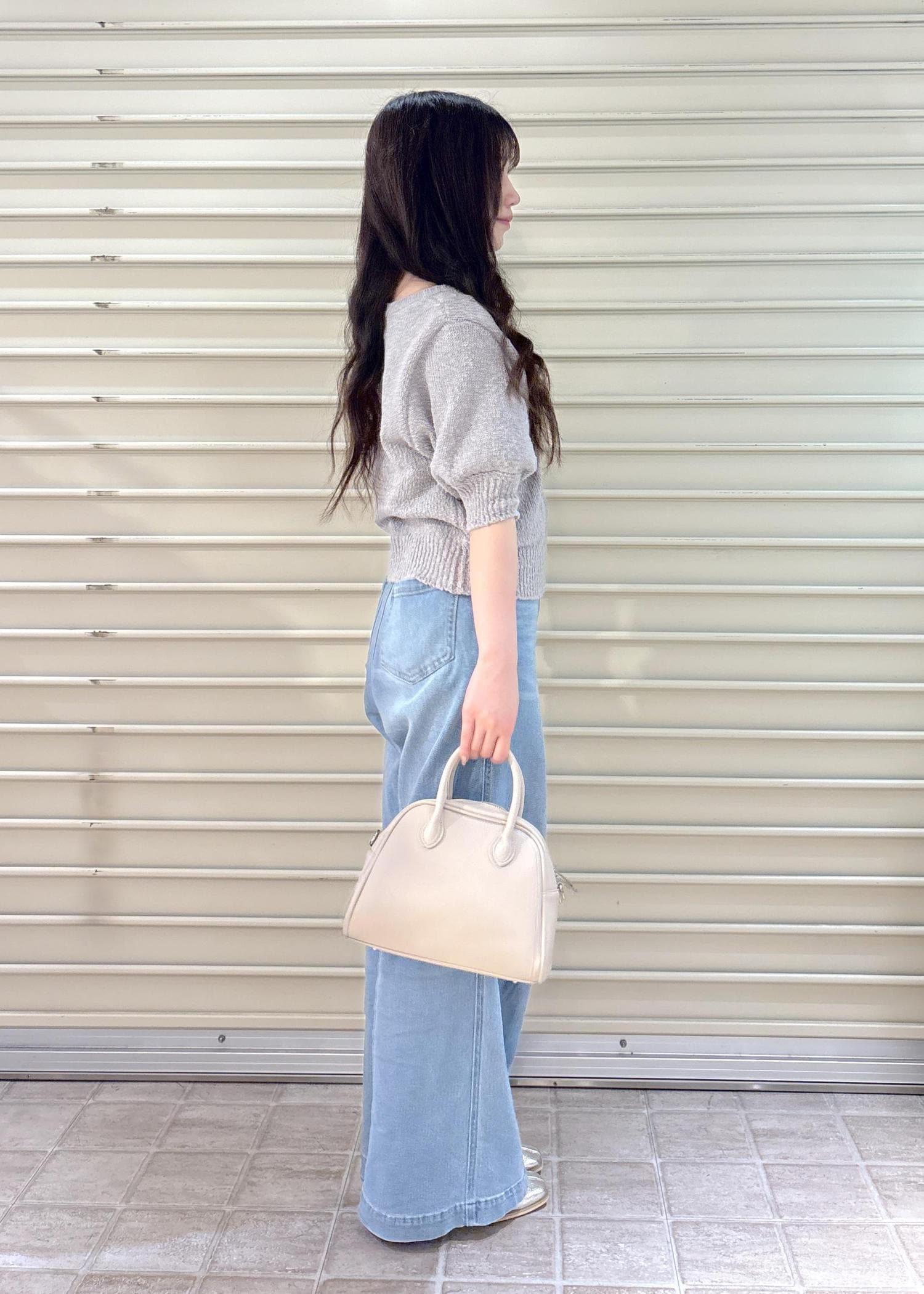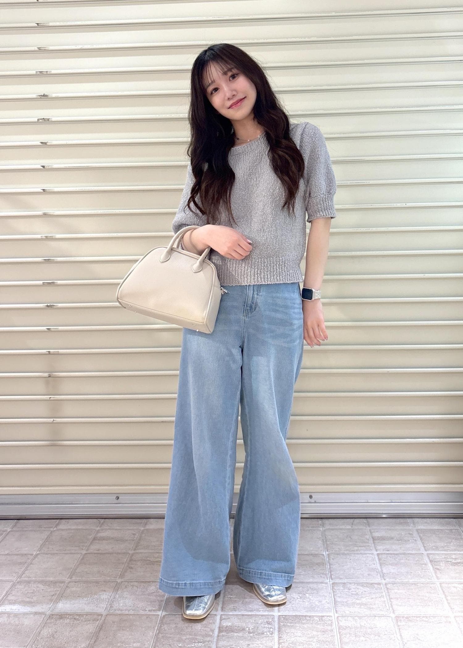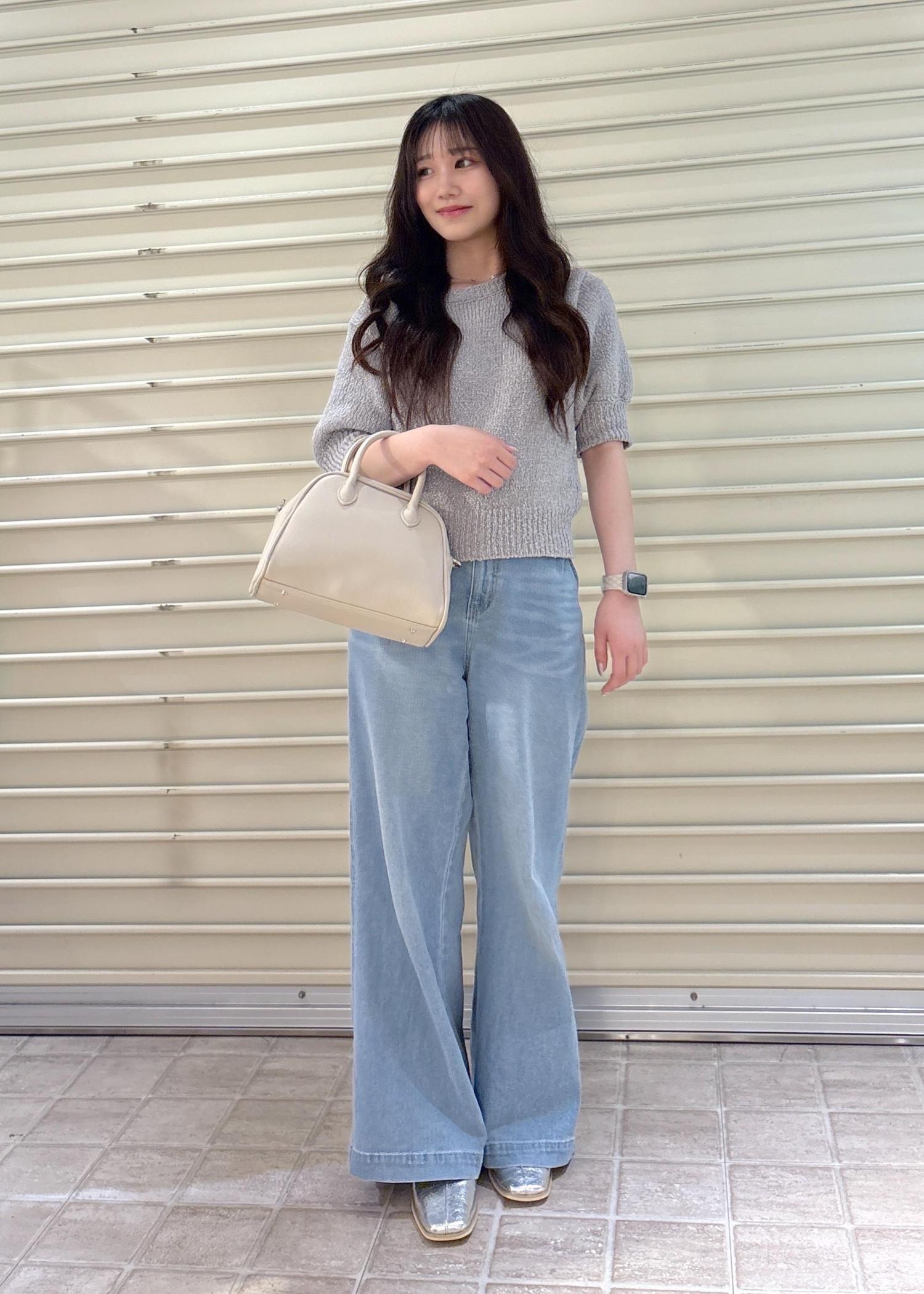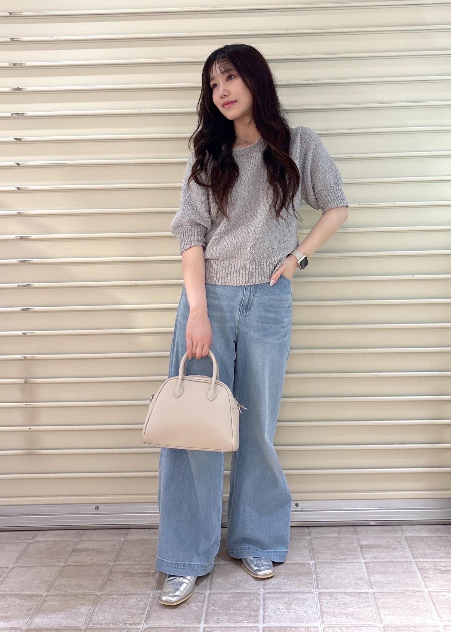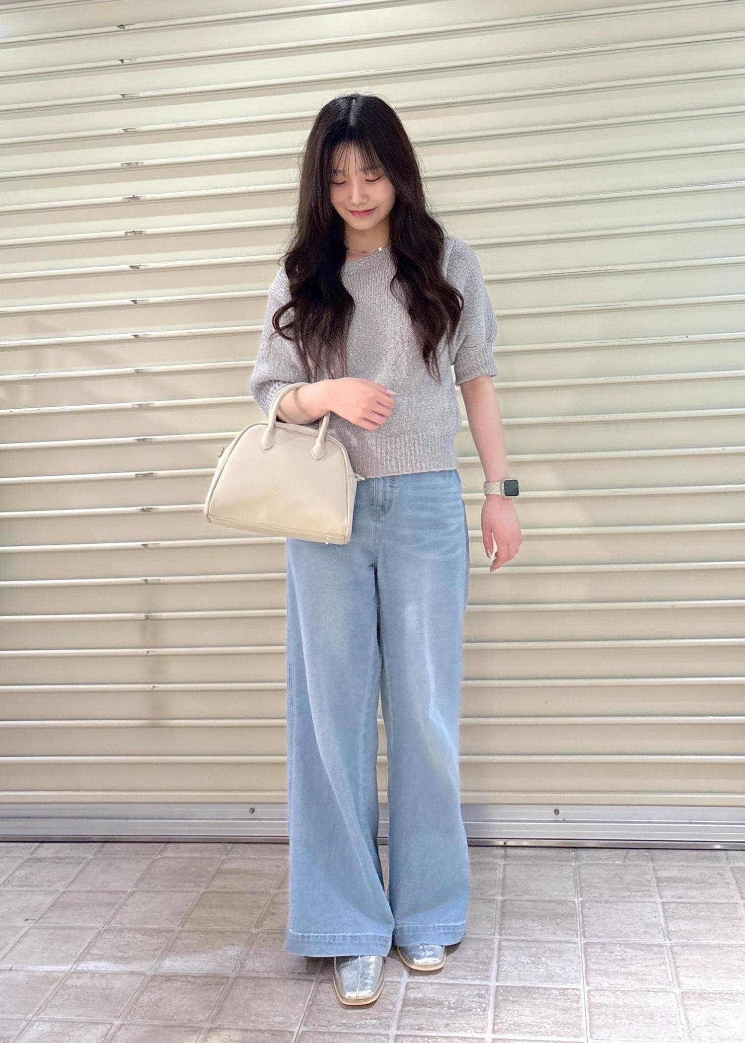 こちらのコーデは、韓国風カジュアルをイメージしてみました!メインのトップスはラメが入っていて今どきっぽく着こなせれます!パンツはワイドになって脚長効果抜群、トレンドのシルバーのパンプスを取り入れて少し大人っぽくなるように意識してみました!バッグは500mlのペットボトルが入るので夏に必須な水を入れるのに丁度良いと思います!