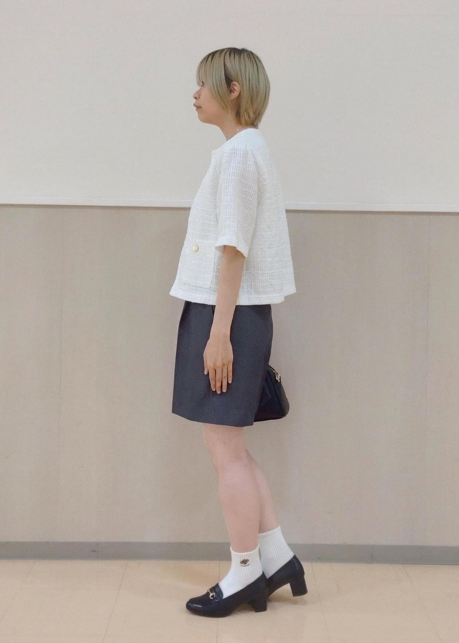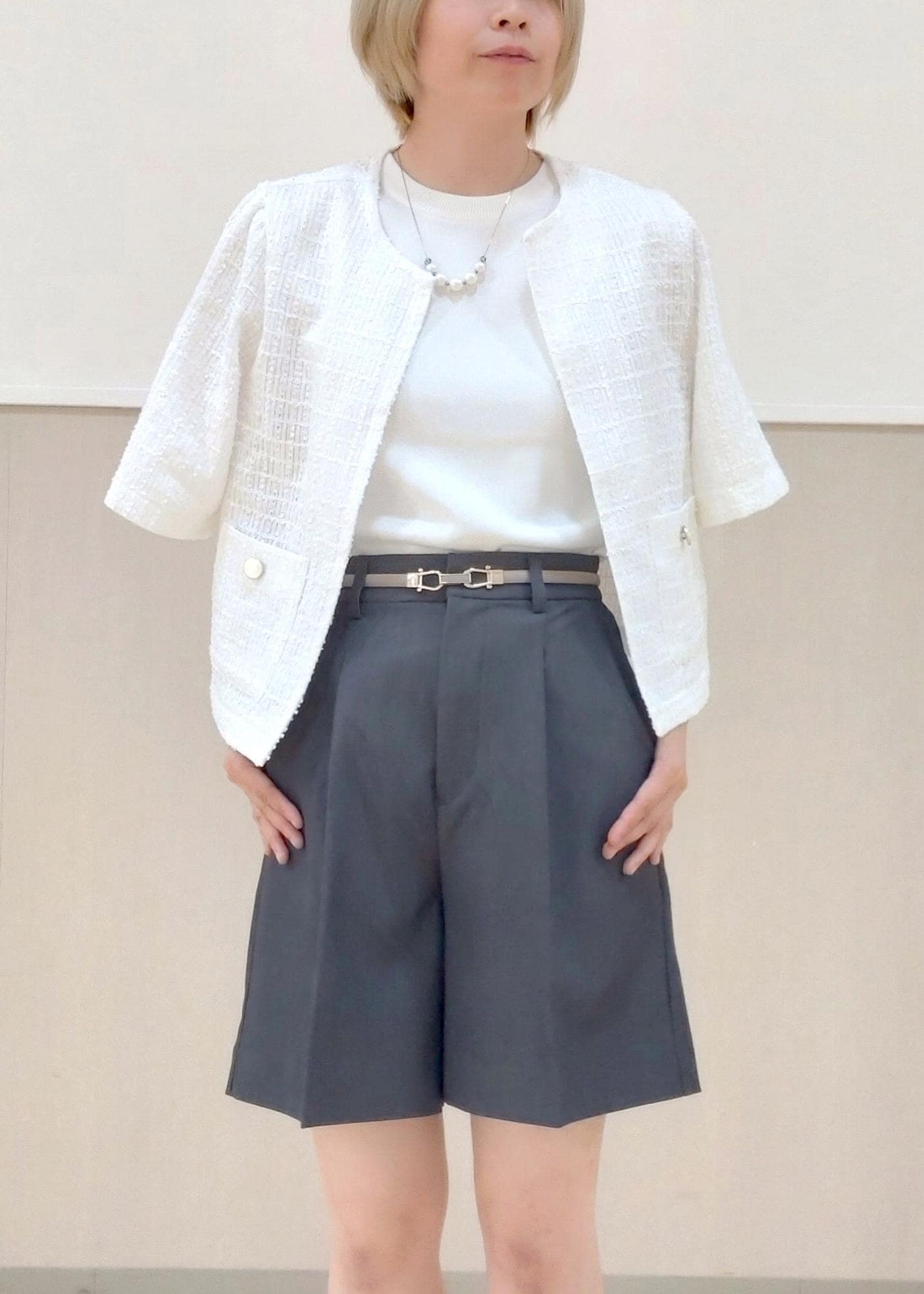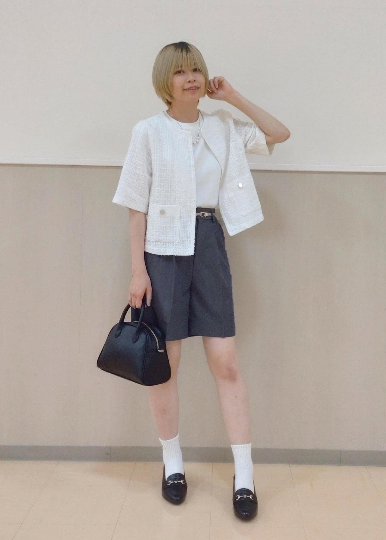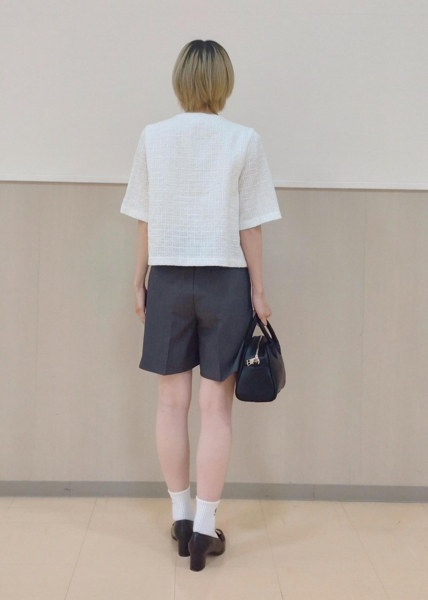 ハーフパンツでヘルシーにツイードアイテムで全体的にきれいめなイメージで合わせたコーディネートです!