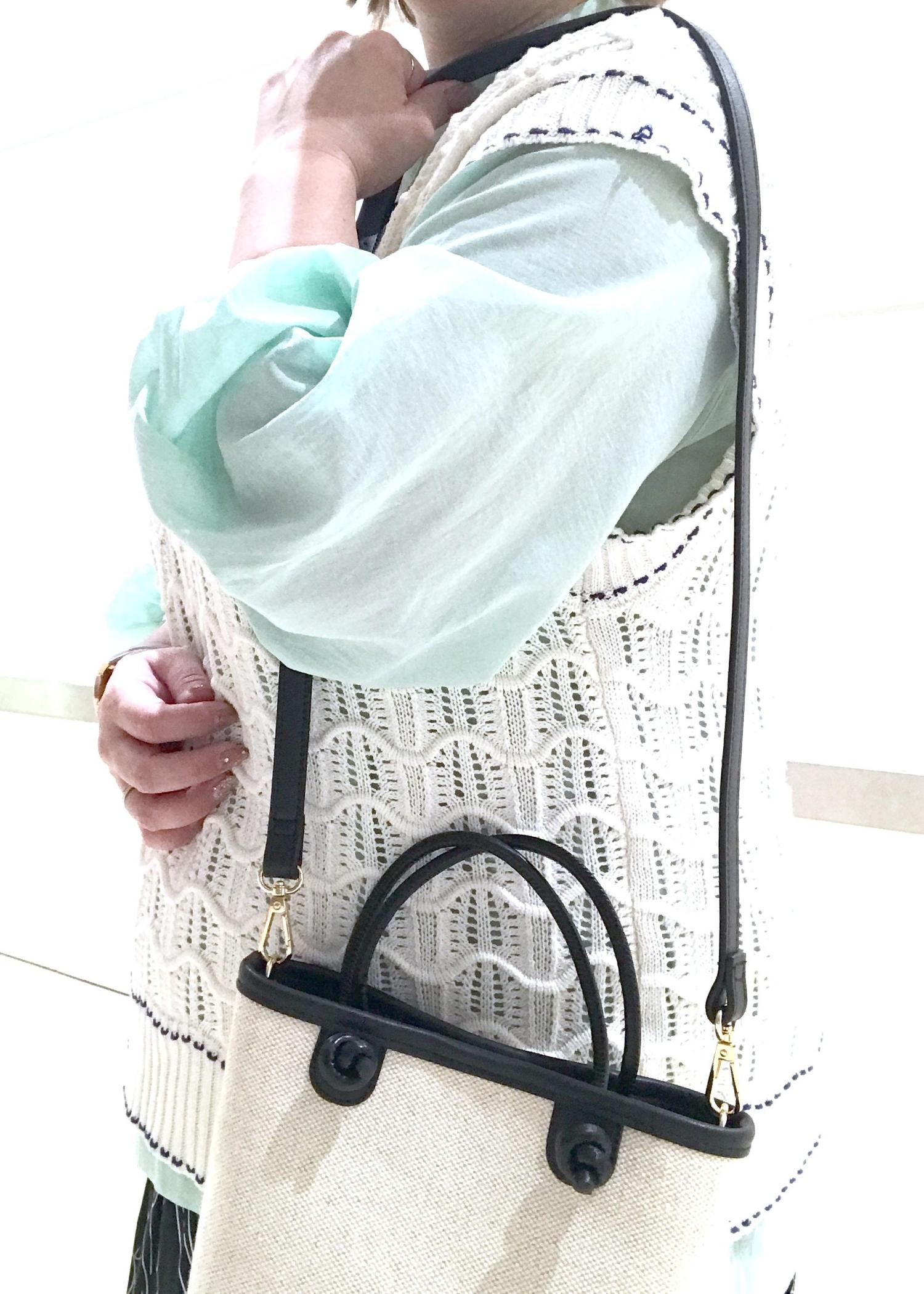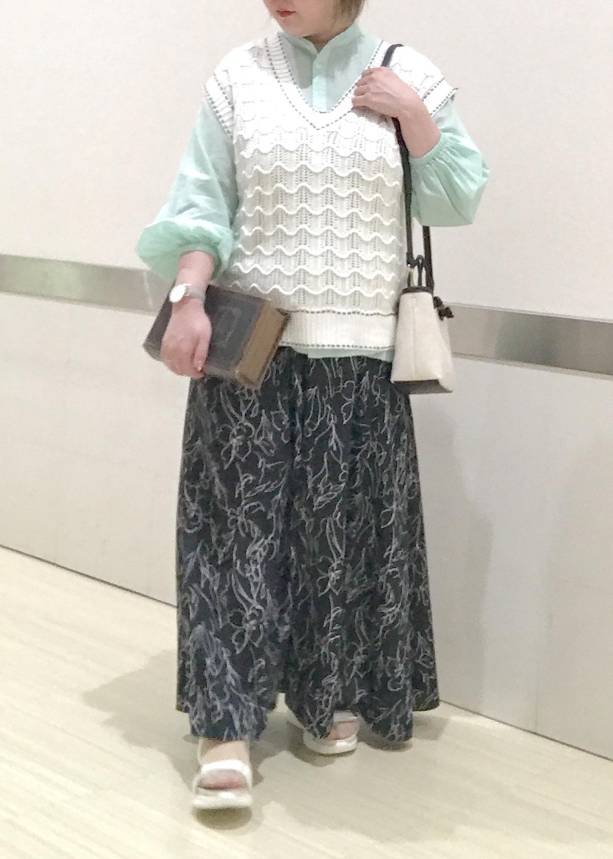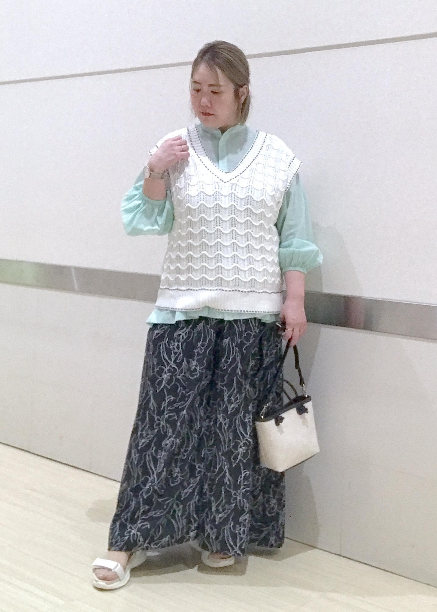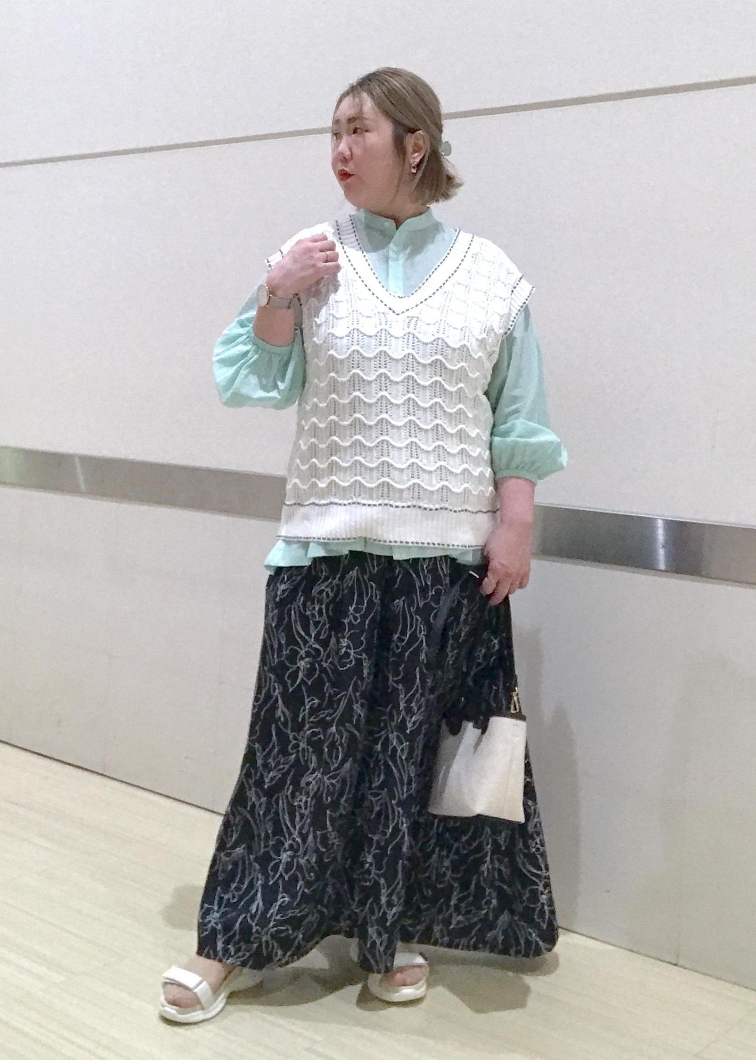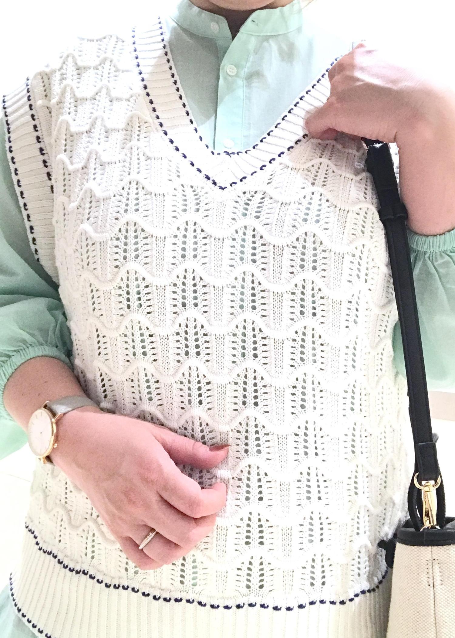 ホワイトのニットベストにフレッシュなグリーンの綿シャツを合わせて爽やかな着こなしにしてみました。 足元はスニーカーサンダルでよりカジュアルな印象に♪ ラフ感もあり、お出かけにオススメです♡
