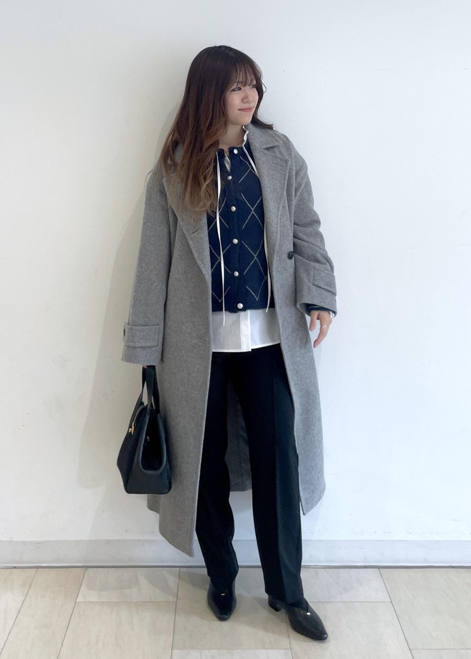 前を開けて羽織るように着用すると、スッキリIラインシルエットになってスタイルUPできます✨