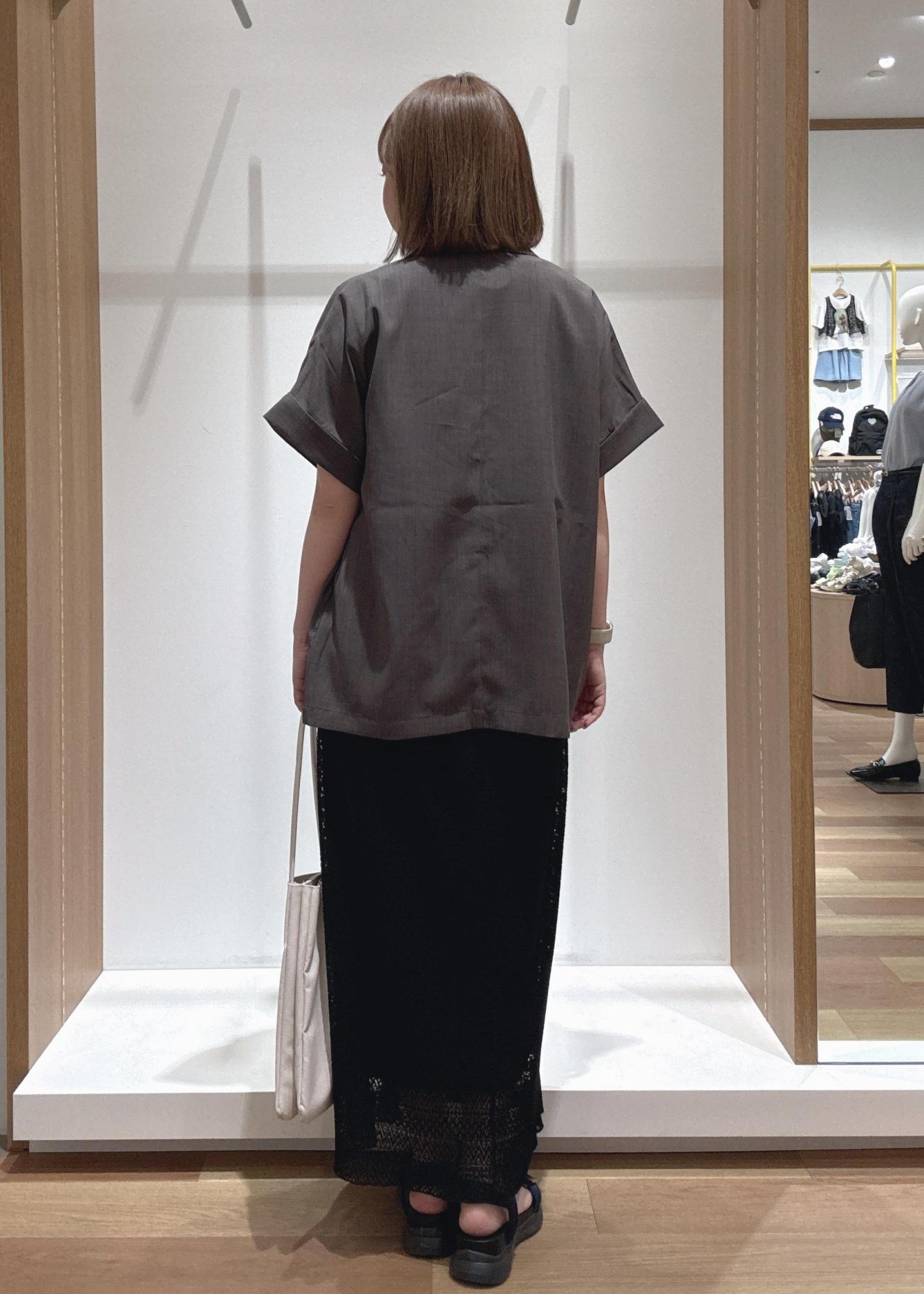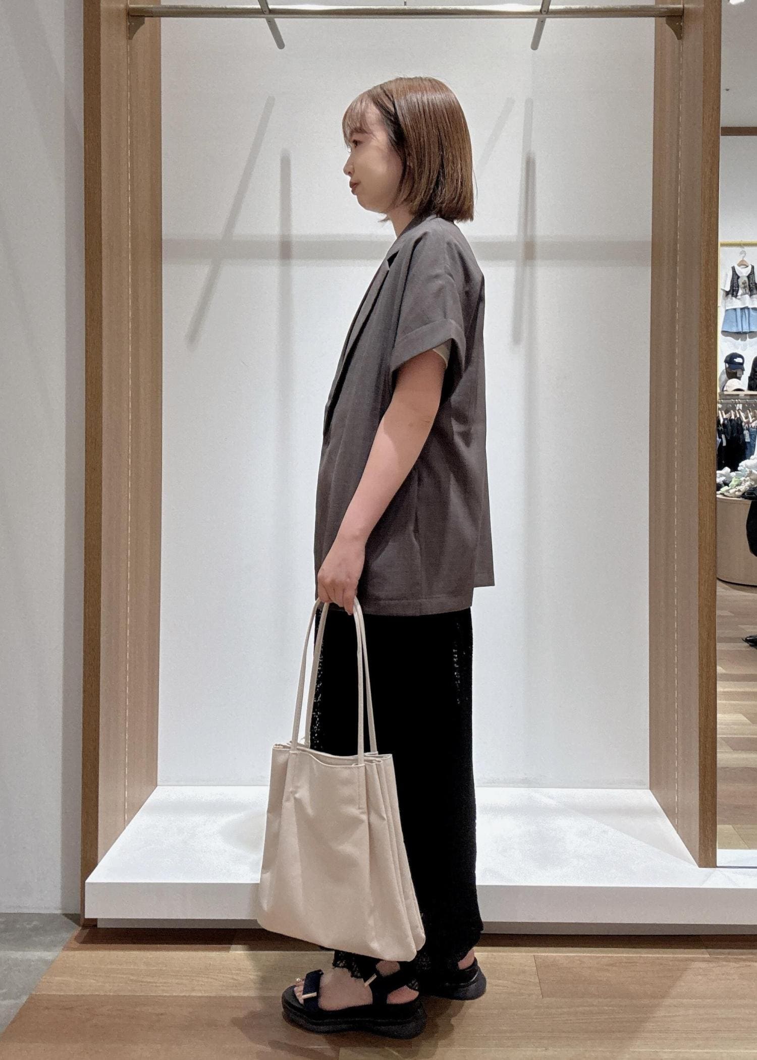 麻調ジャケットは暑い時期でも涼しく着れる素材感で、ゆとりのあるシルエットなので、Iラインスカートでバランスを取りました。