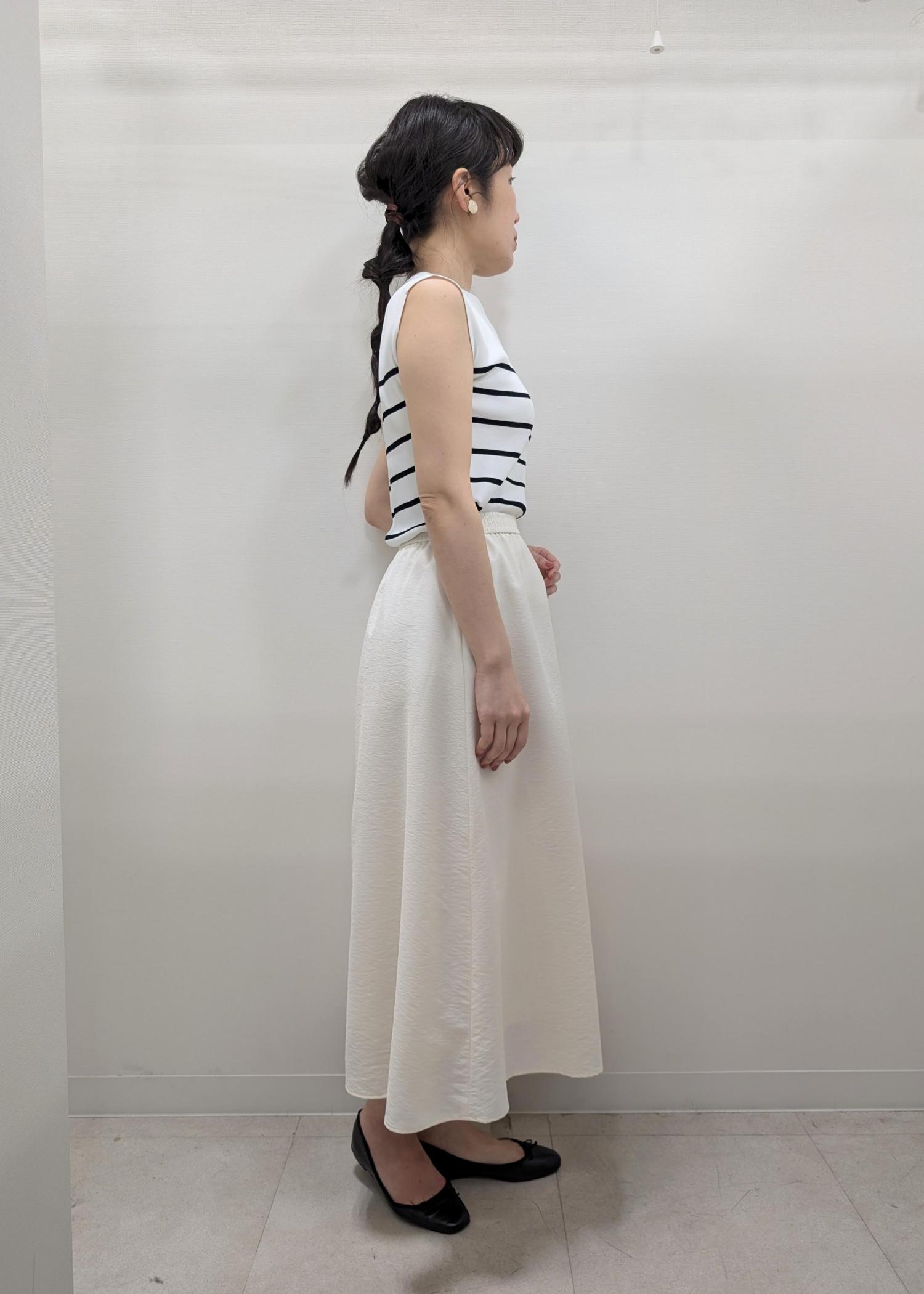 167cmの私でも足首がしっかり見えるくらいの丈があるのでやや長めのジャケットやジレでもバランスが取りやすいです。