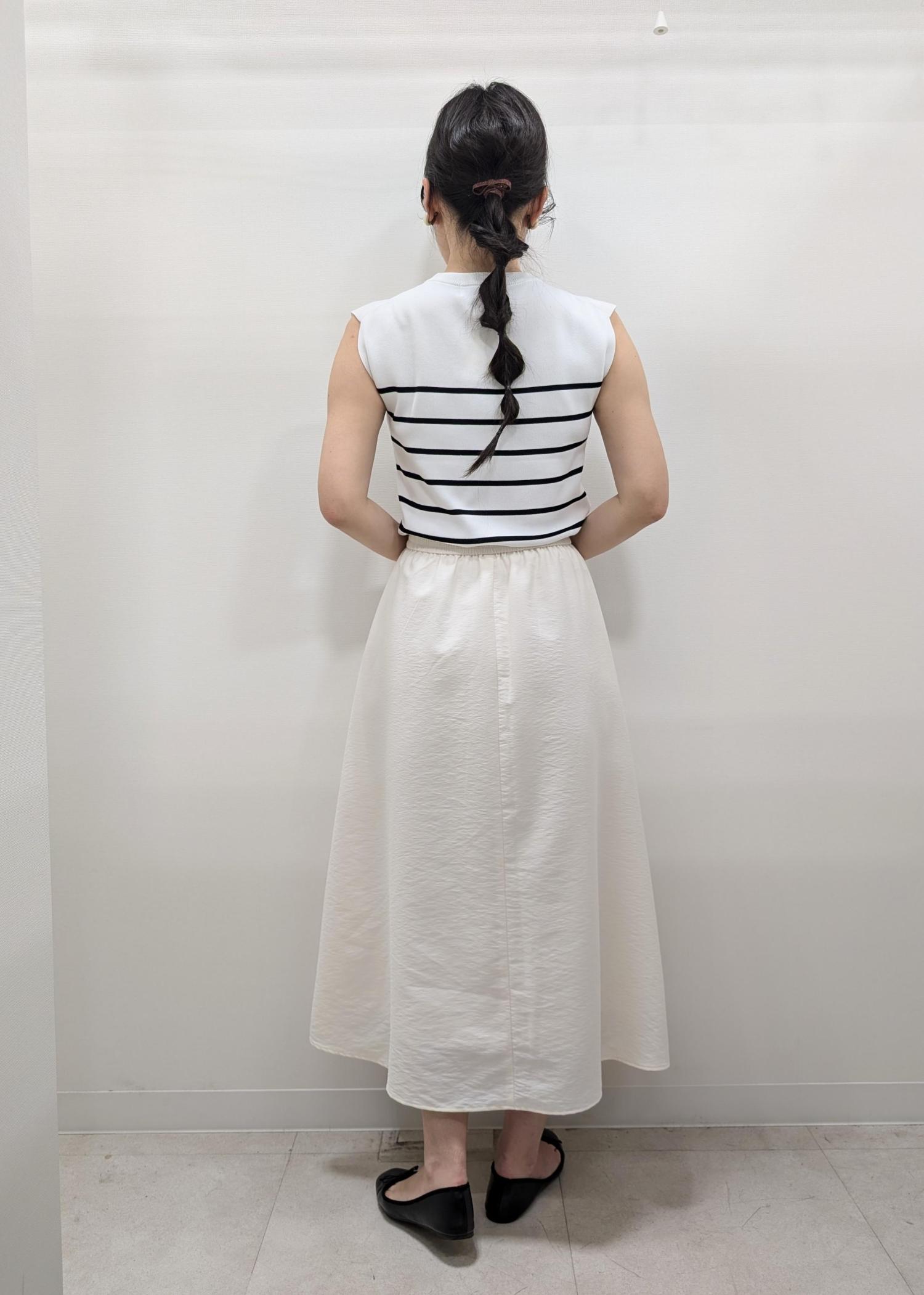 やや腕にかかるノースリーブなので、自然と二の腕面積を減らしてくれるニットです!