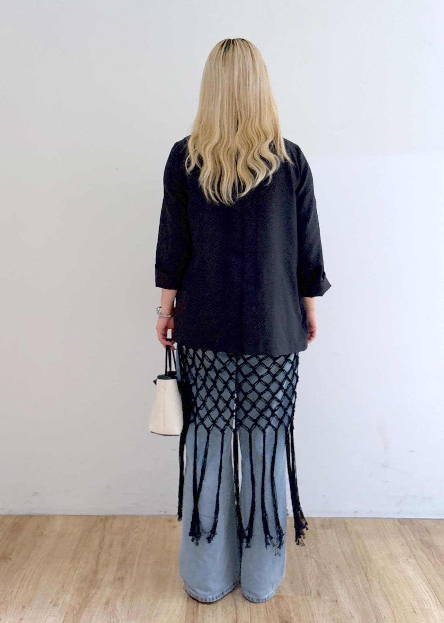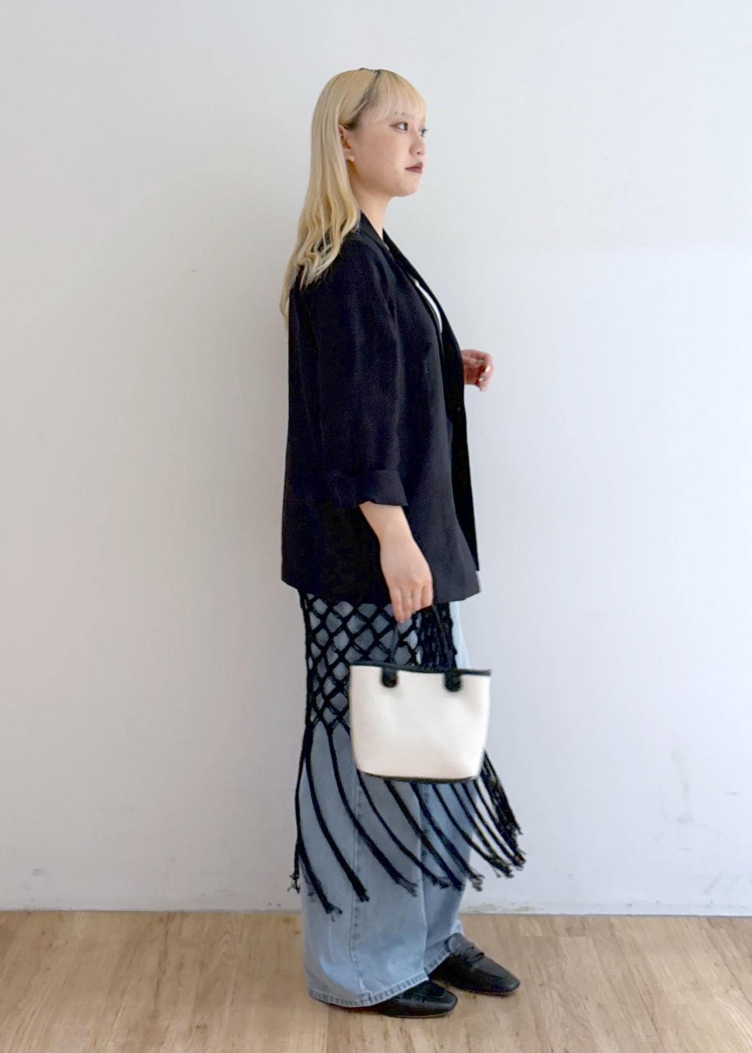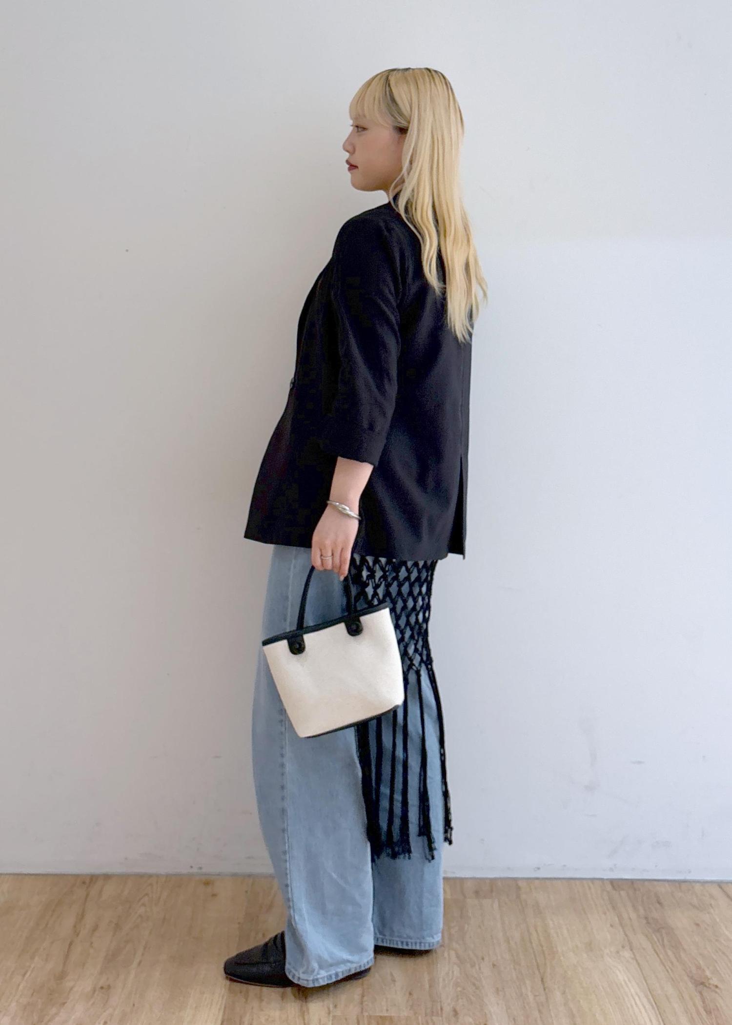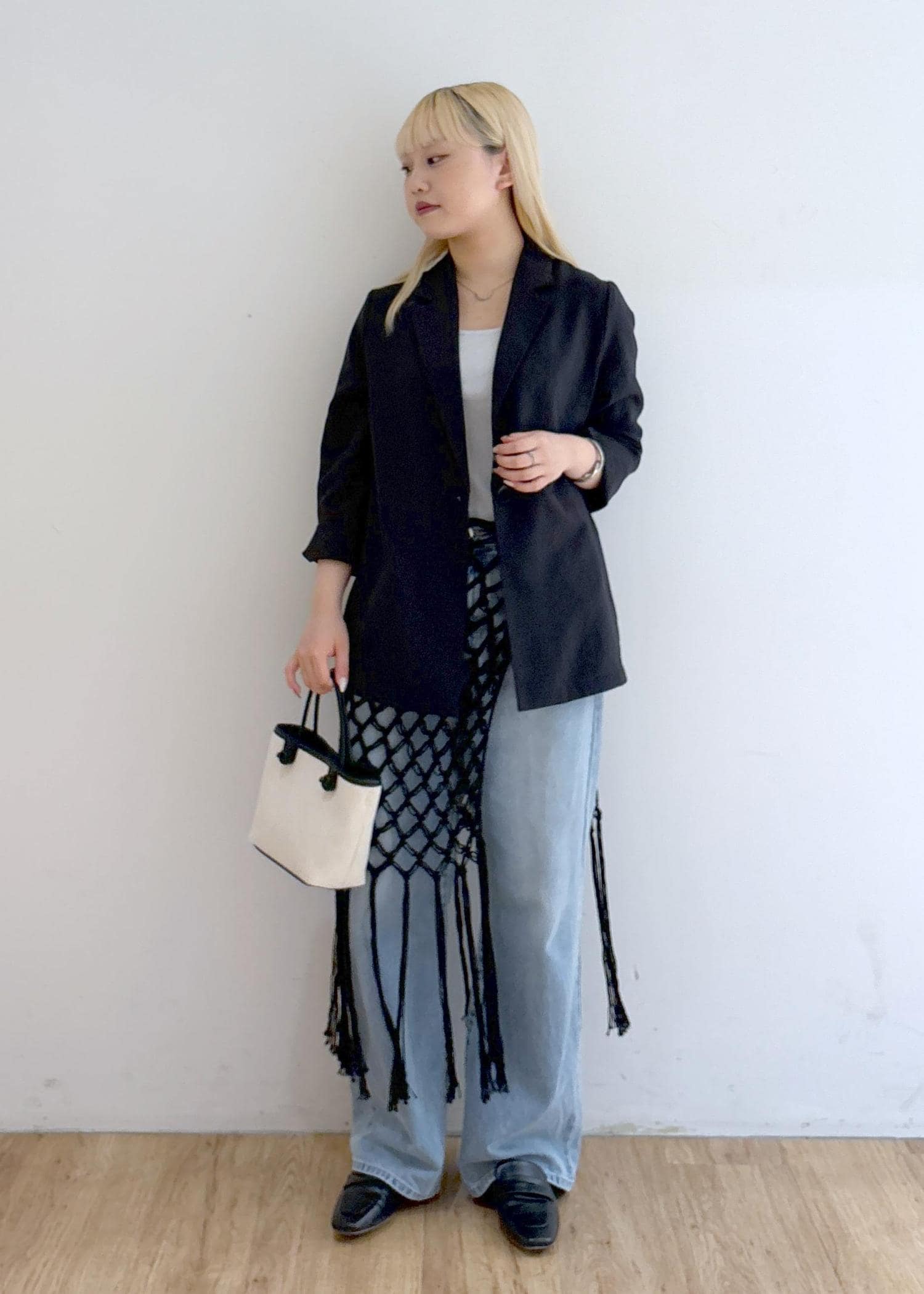 ジャケット × デニム × レイヤードで、カジュアルとトレンド感を合わせたスタイリング。