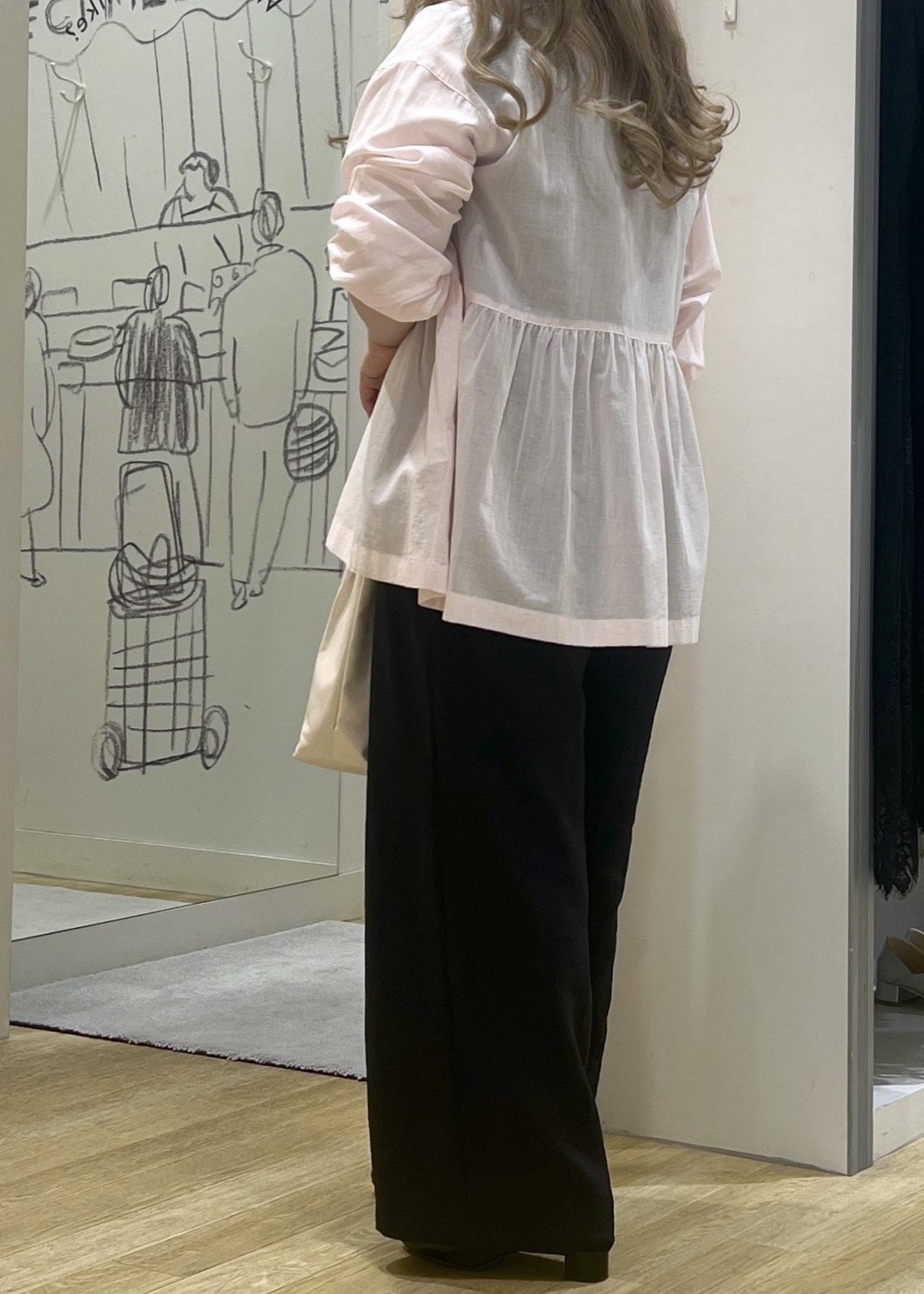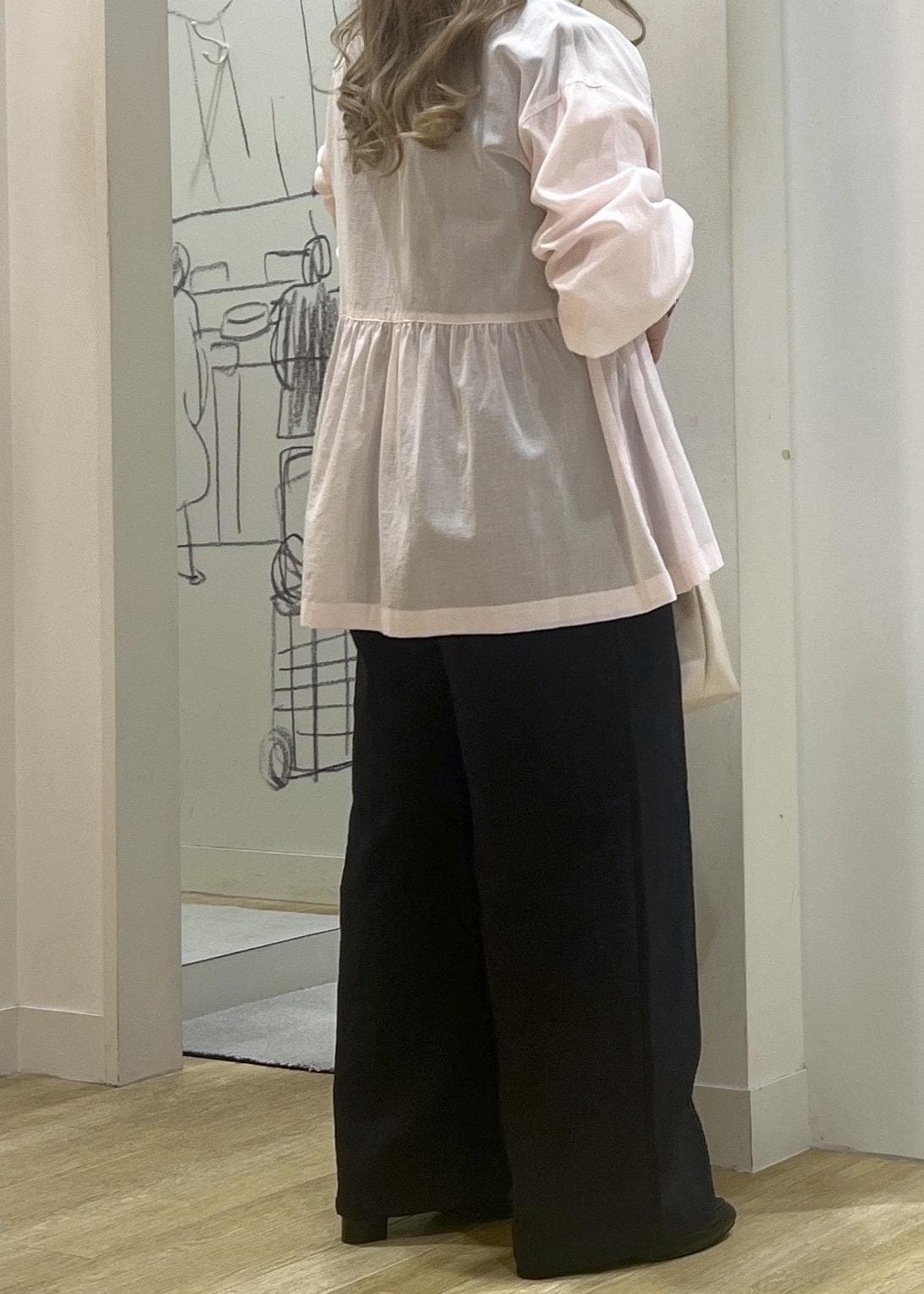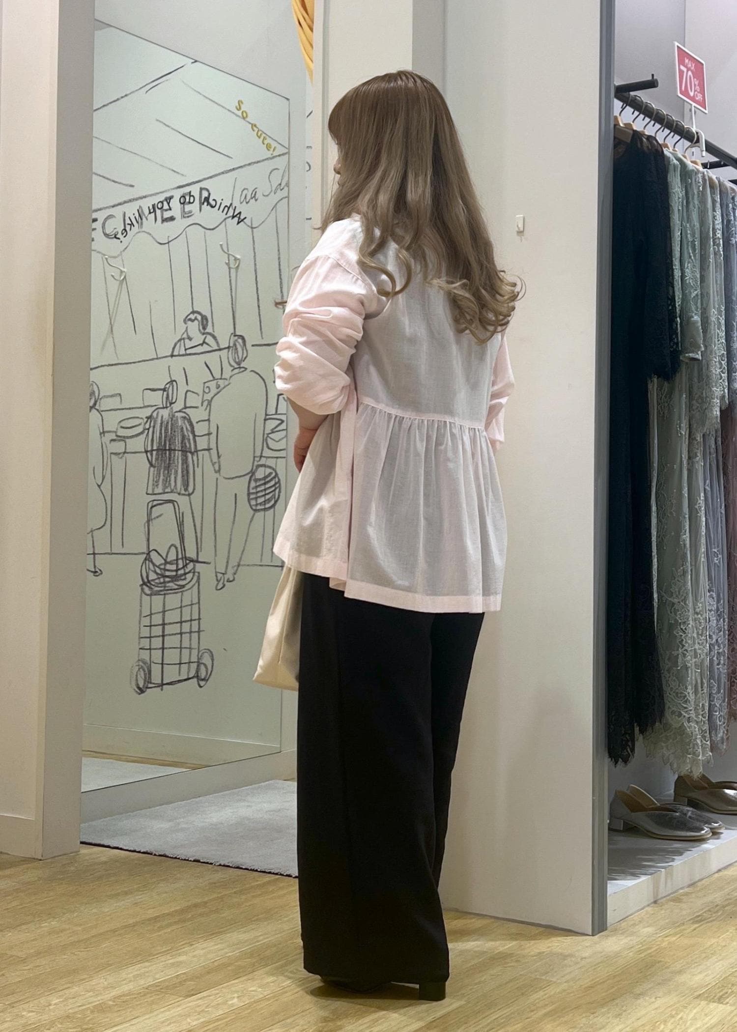 ピンクのペプラムシャツを合わせた、甘くなりすぎない大人っぽいスタイリングを意識しました