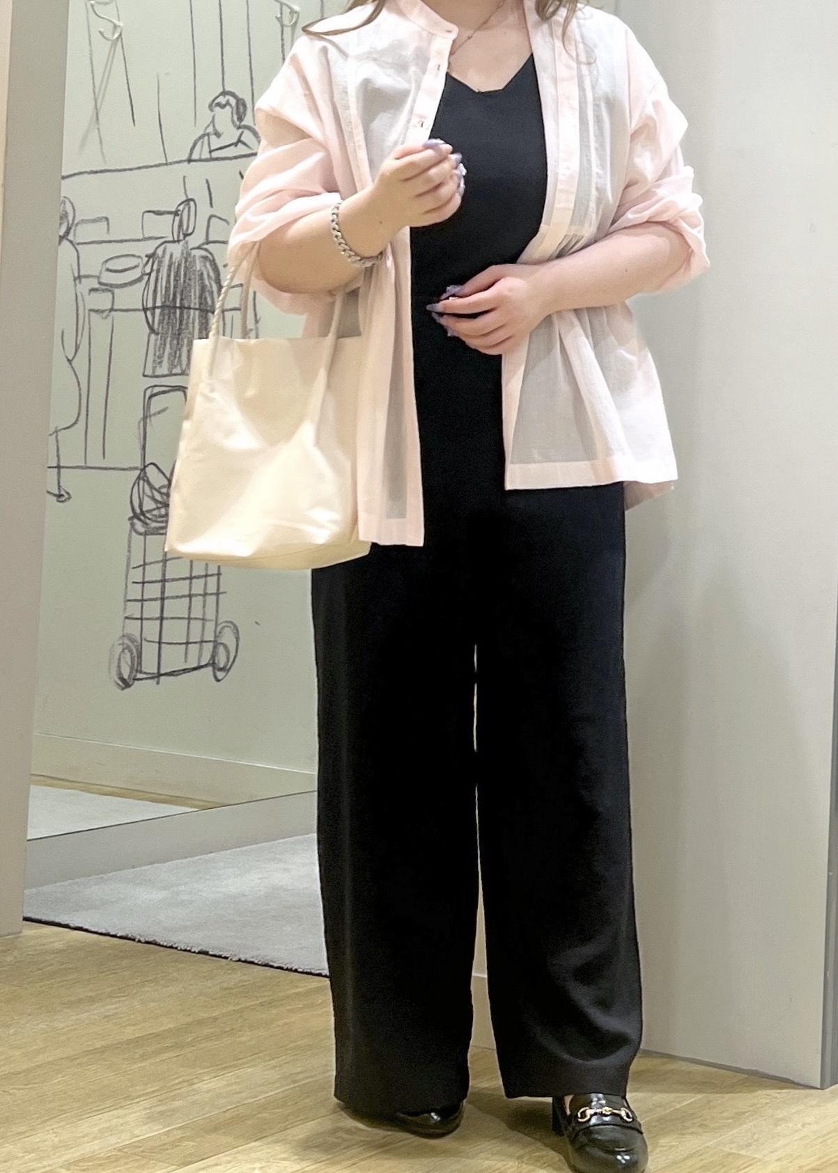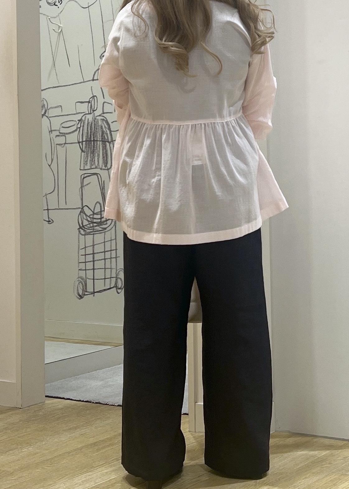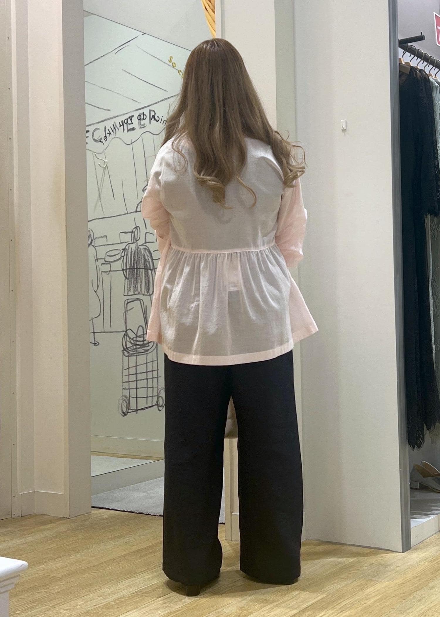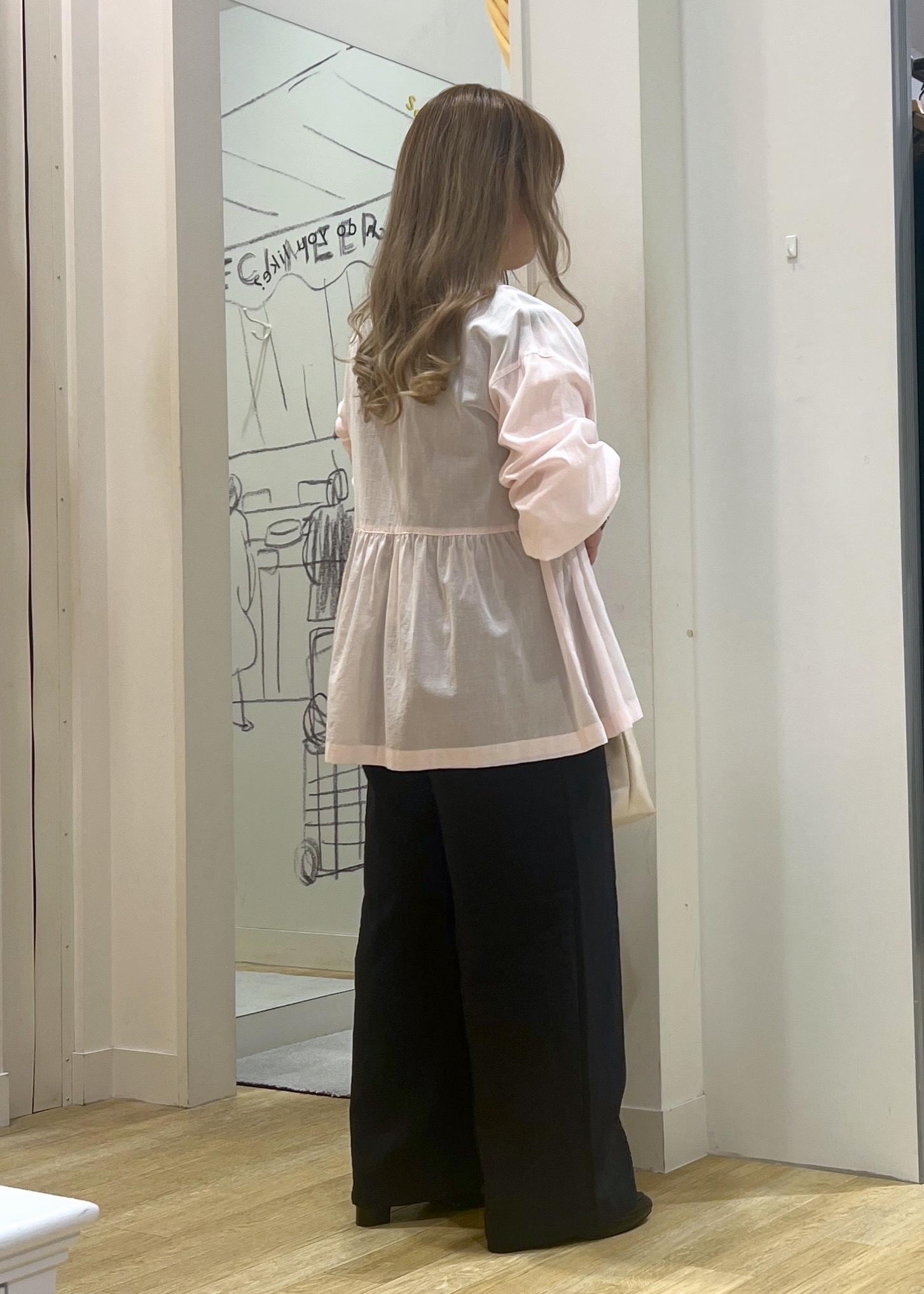 ピンクのペプラムシャツを合わせた、甘くなりすぎない大人っぽいスタイリングを意識しました