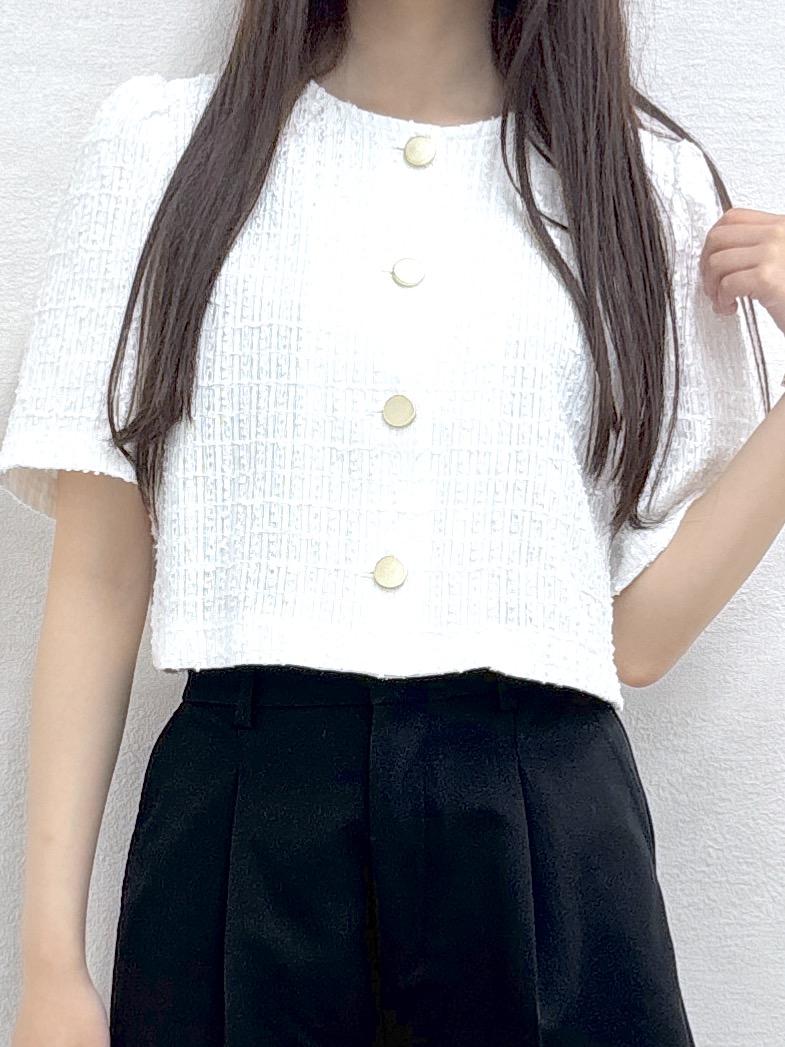 1枚で着るとちょうどシャツが見えないくらいの丈感です。袖は半袖より少し長めです。ボタンはゴールドのシンプルなボタンです。肩に少しボリュームがあるので綺麗に着ていただけます✨