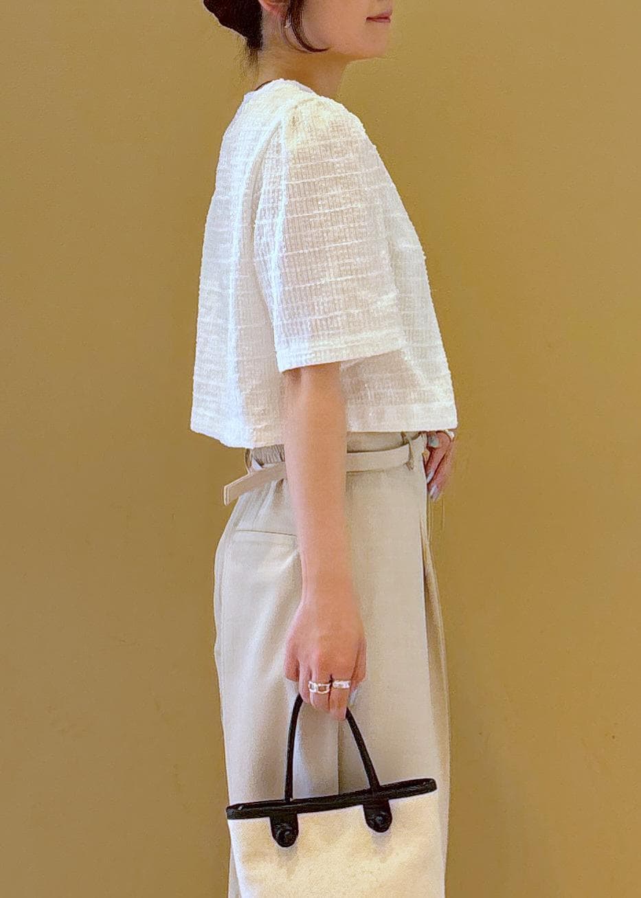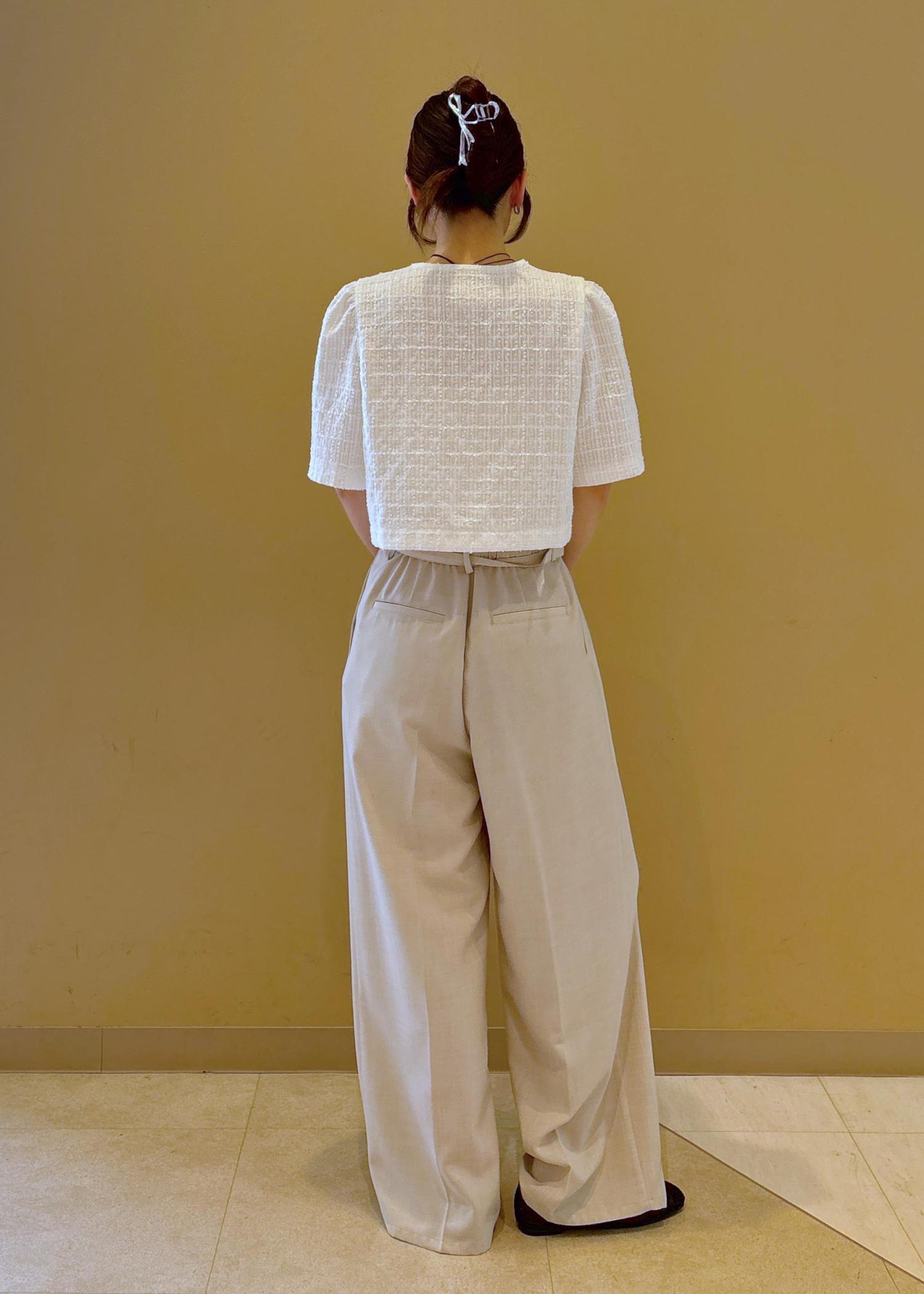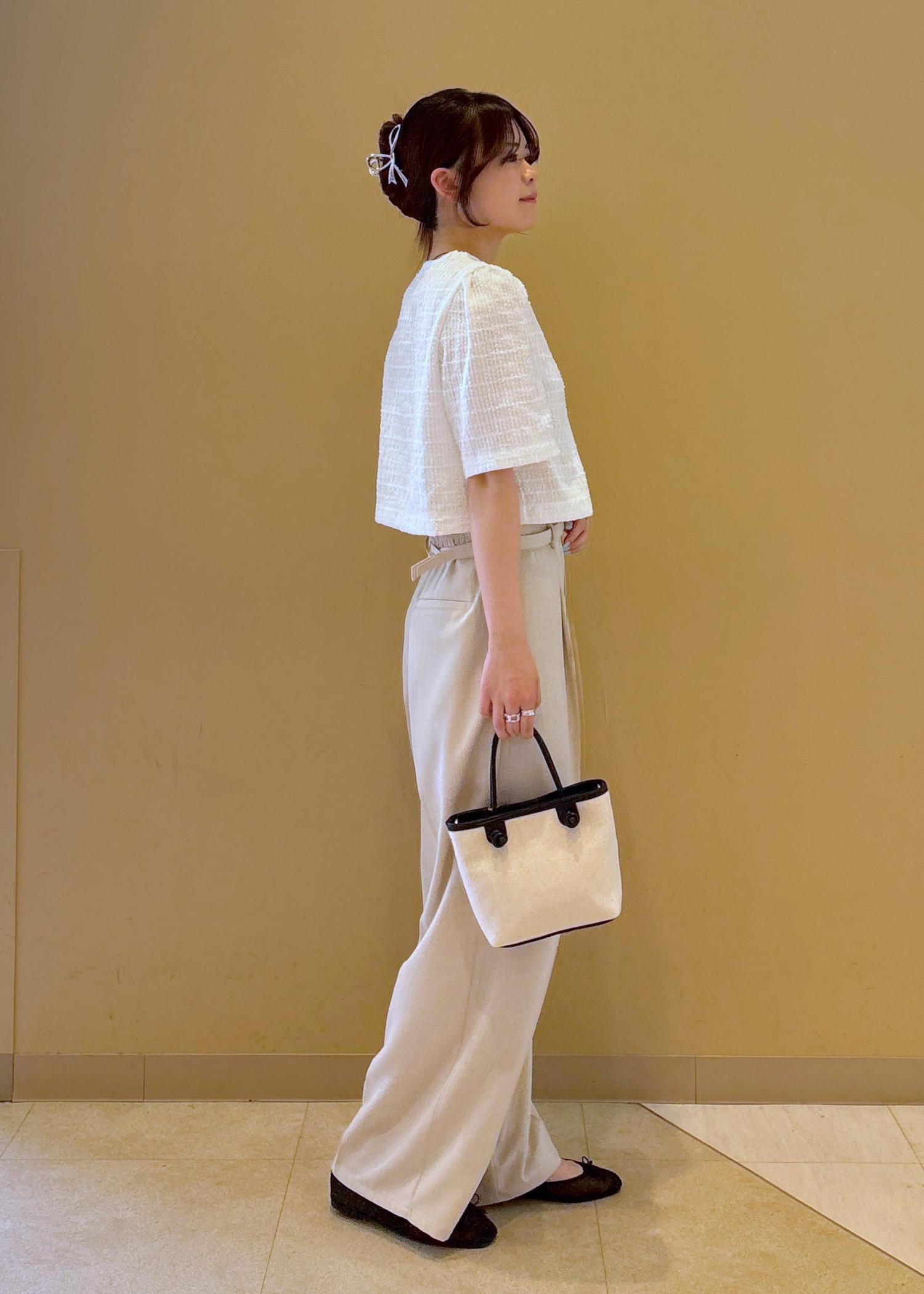 清涼感のあるオールホワイトコーデ。明るいカラーは膨張見えが気になるので短丈トップス+ハイウエストパンツでスッキリ見えするように合わせました。