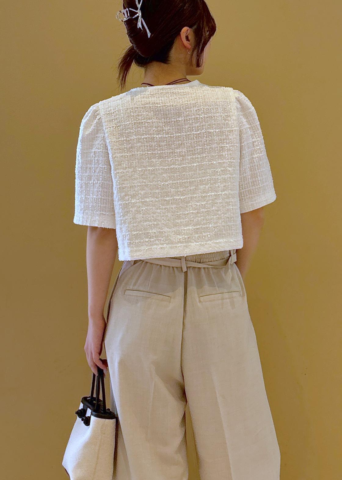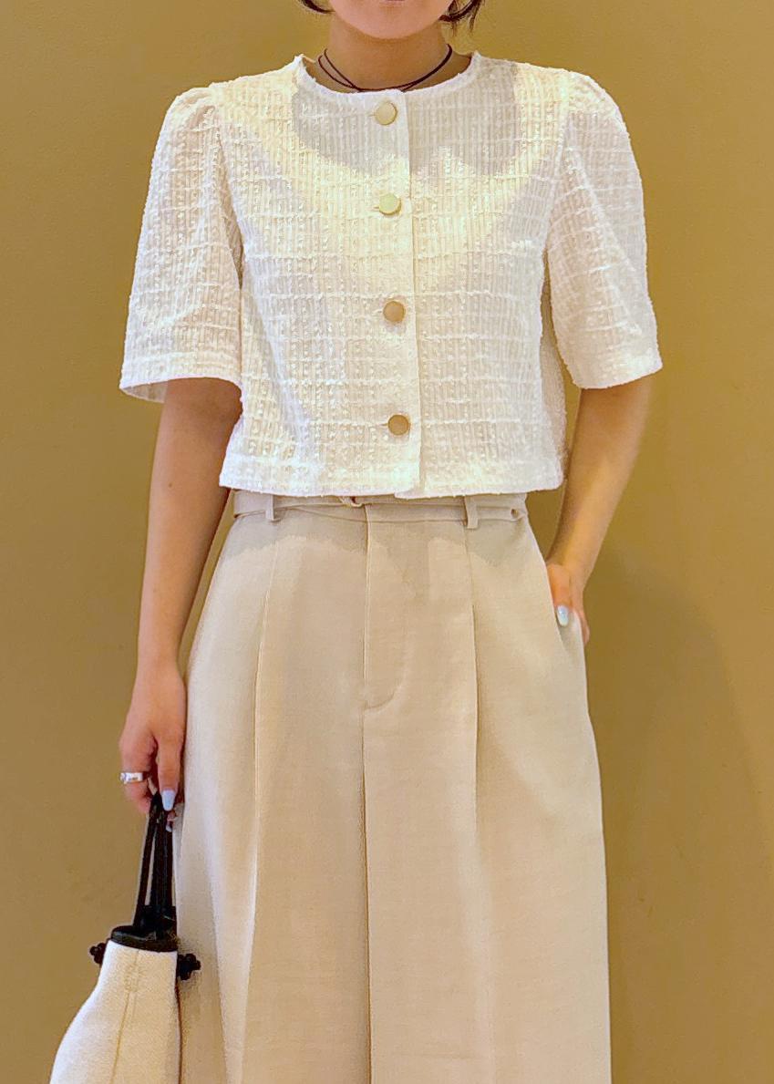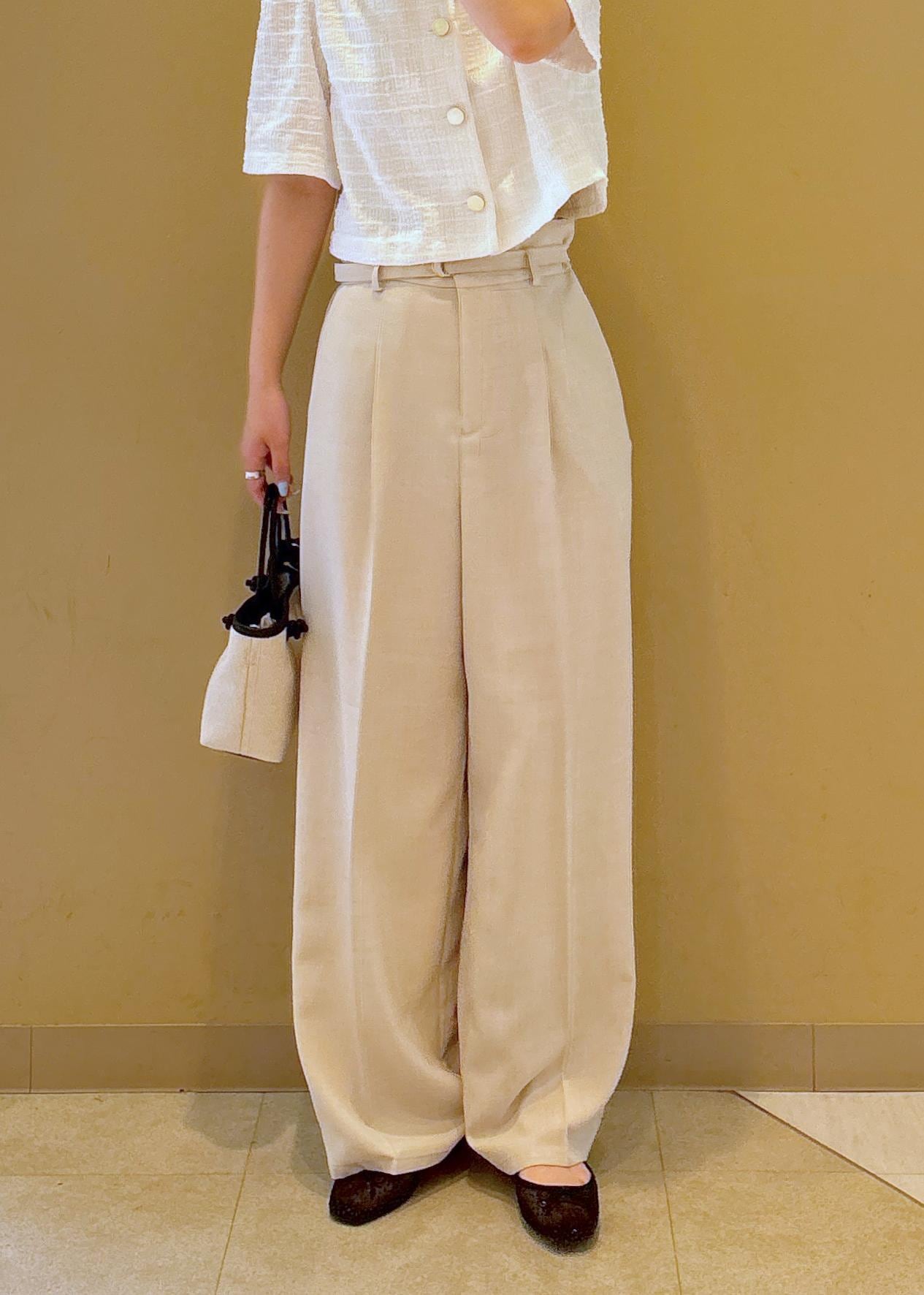 清涼感のあるオールホワイトコーデ。明るいカラーは膨張見えが気になるので短丈トップス+ハイウエストパンツでスッキリ見えするように合わせました。