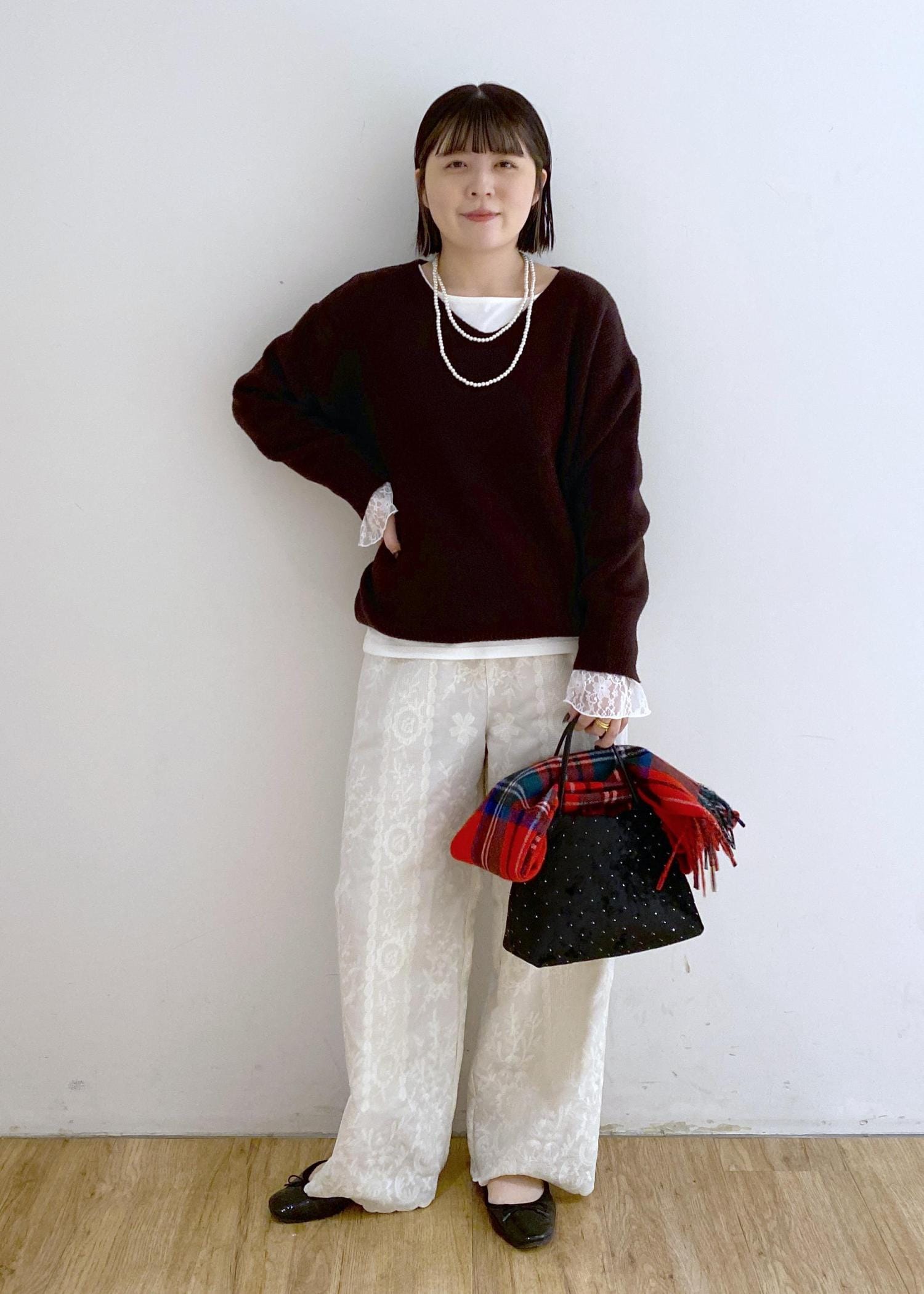 ブルベ夏おすすめパステルカラーでコーディネートしてみました!ビジューデニムを足元からアクセントにレイヤードしているところがポイントです。