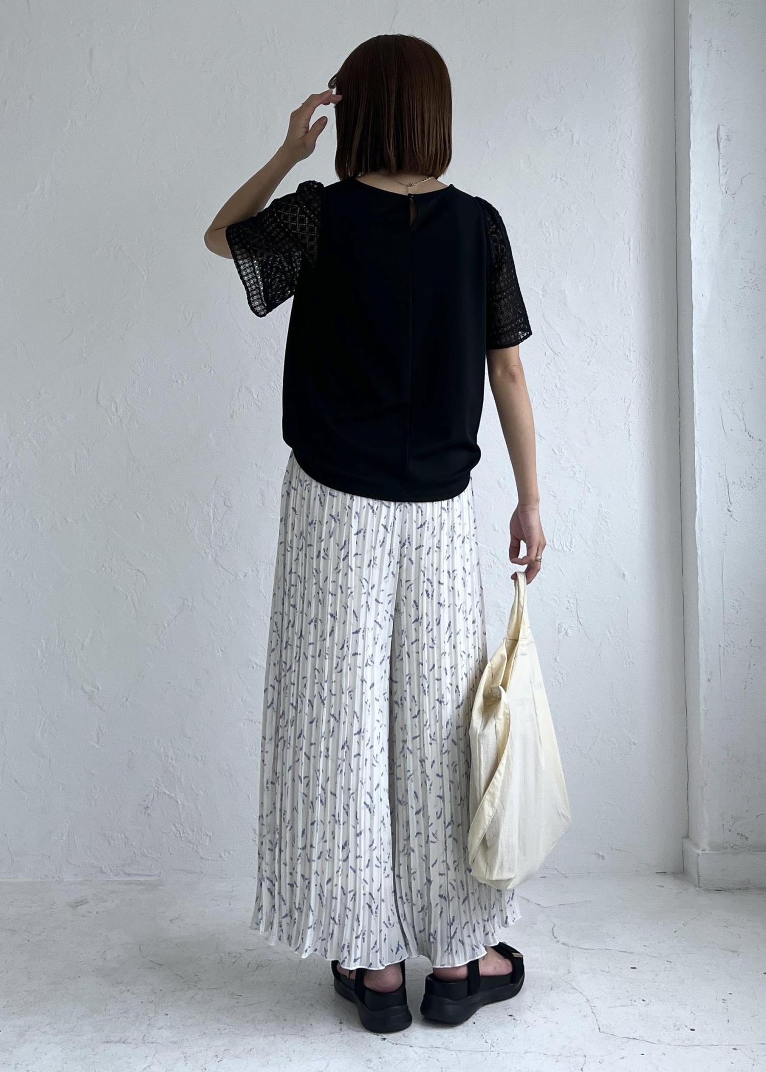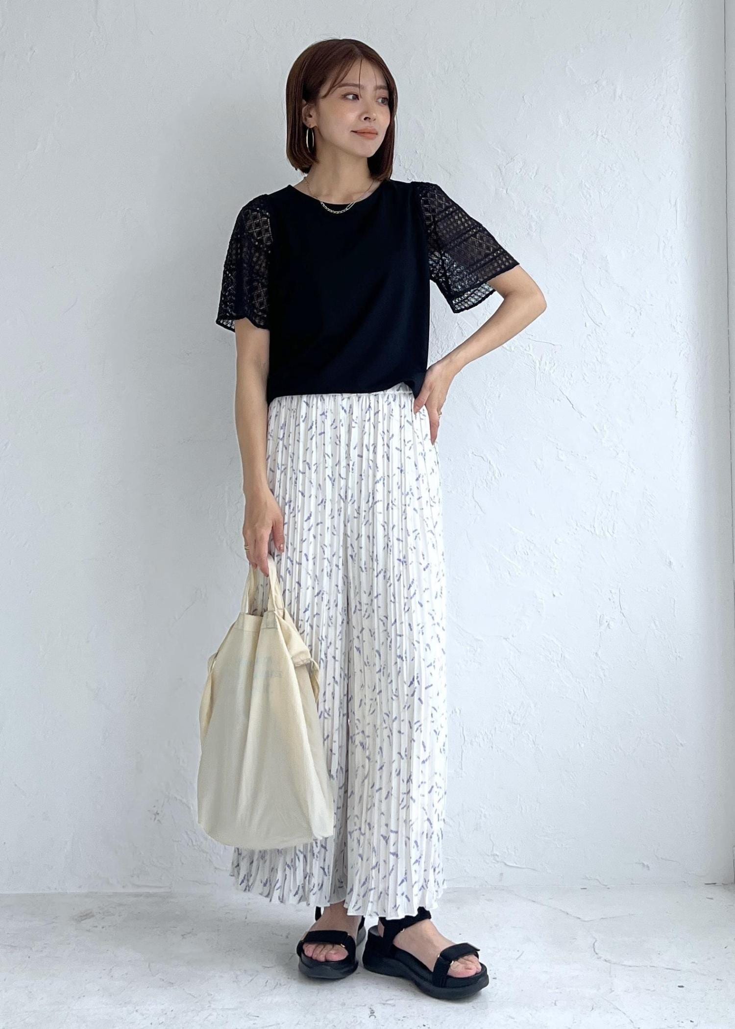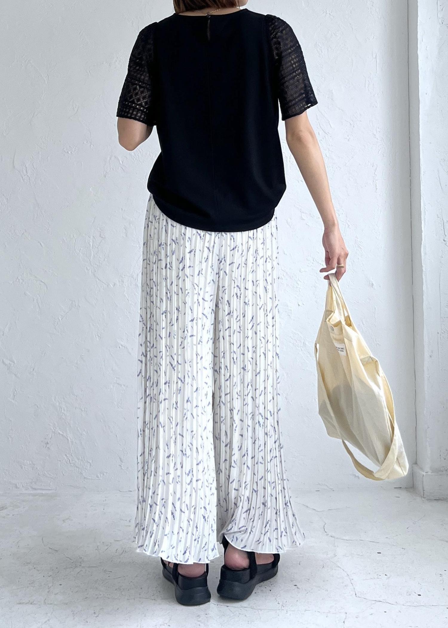 花柄のプリーツパンツはリラックス感のある柔らかいプリーツ素材で、履き心地も楽ちん。