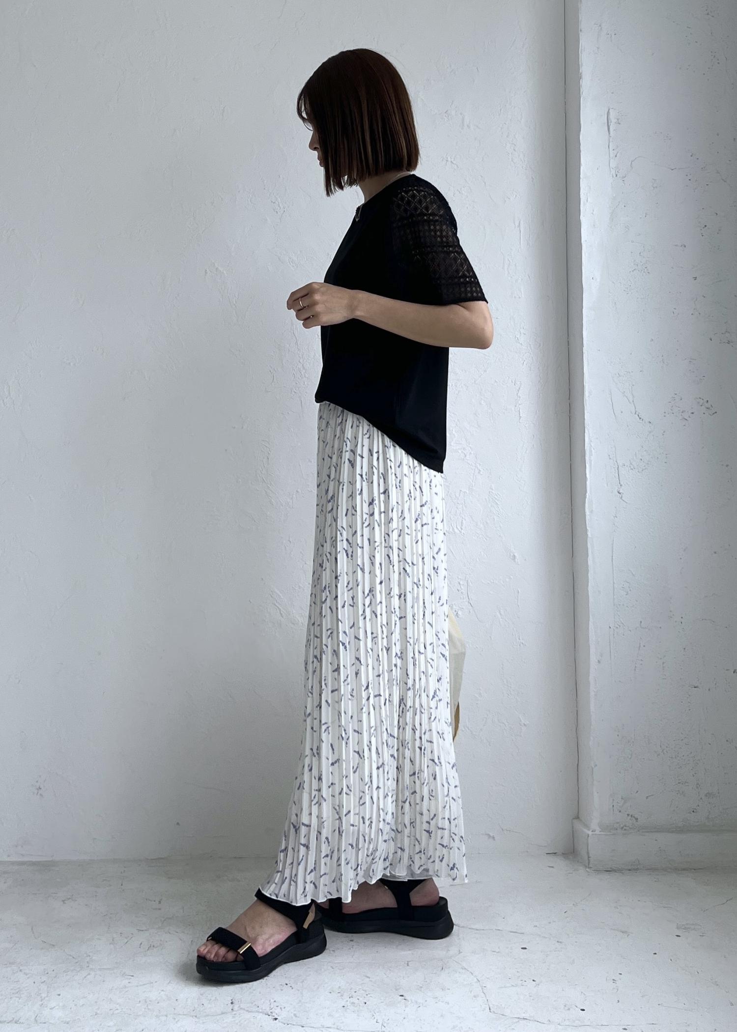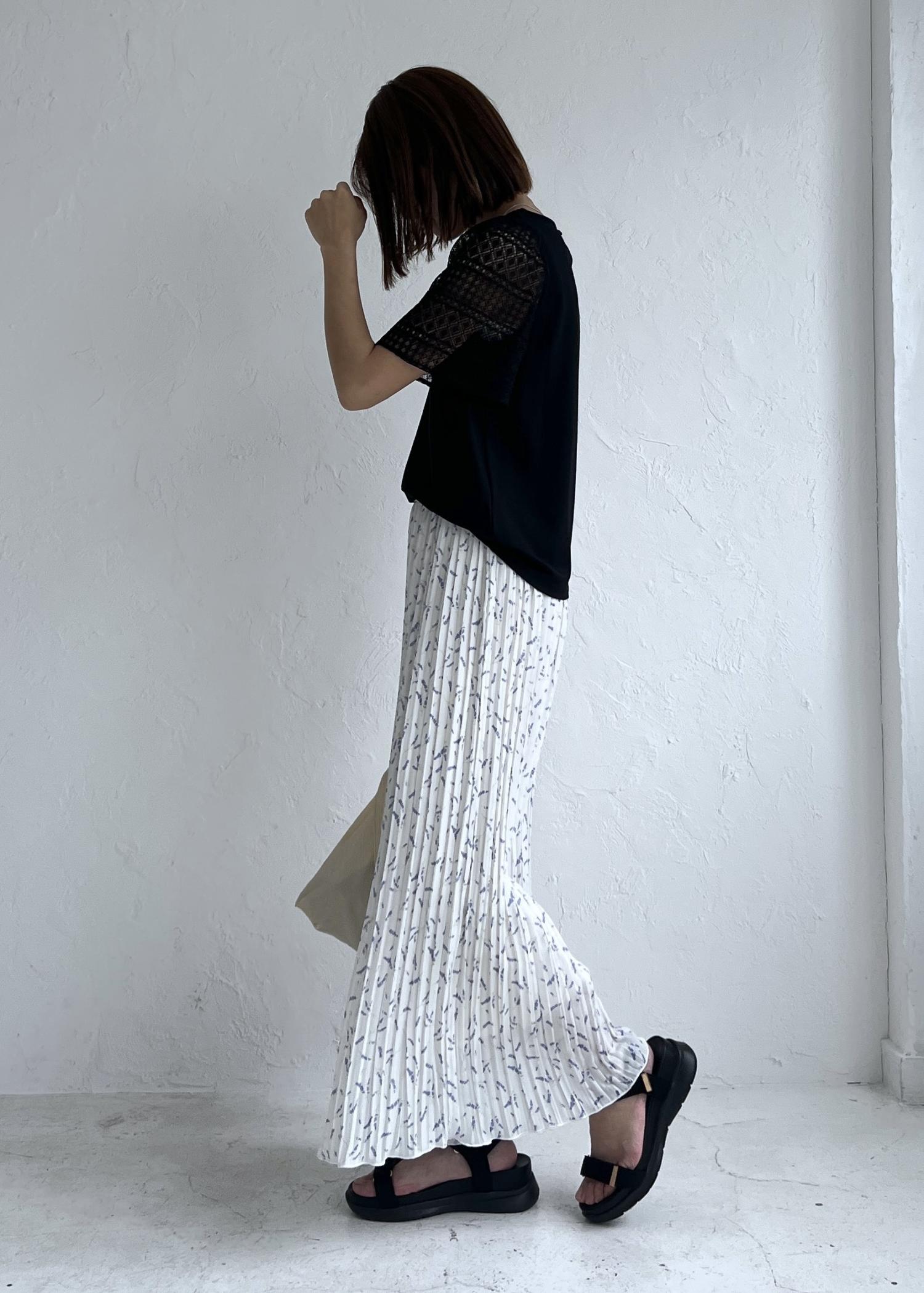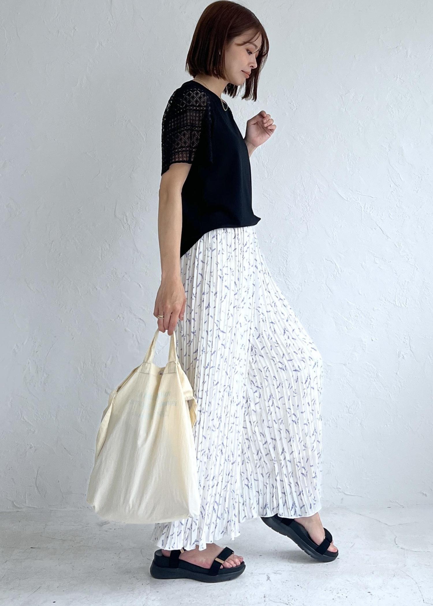 花柄のプリーツパンツはリラックス感のある柔らかいプリーツ素材で、履き心地も楽ちん。