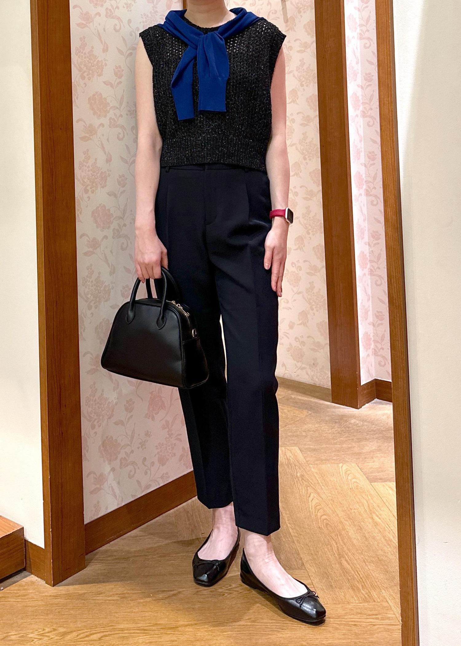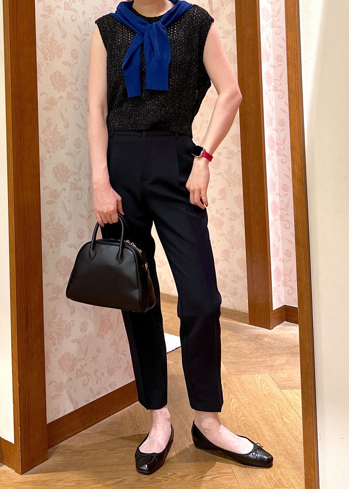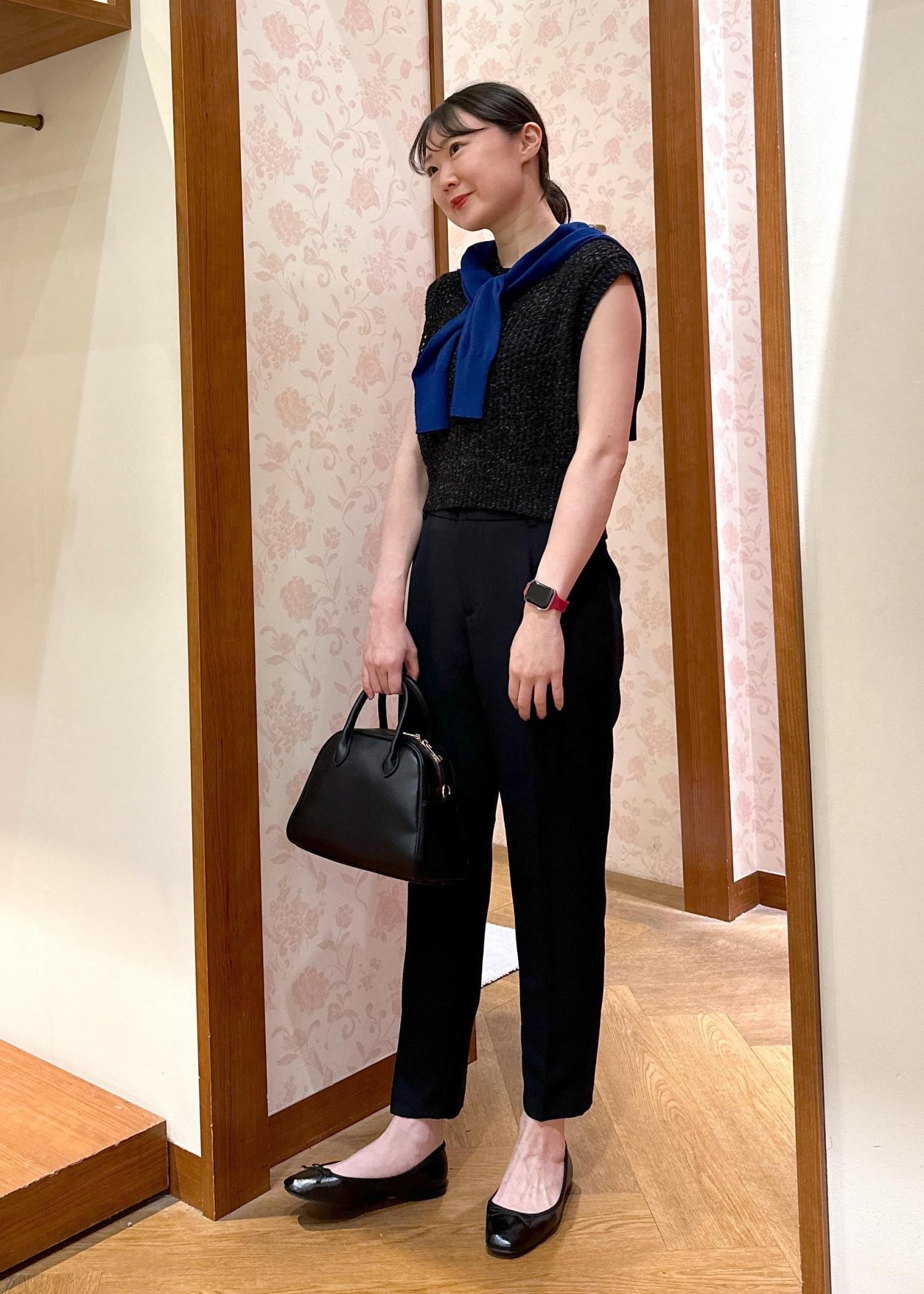 普段の仕事服に、トップスを少しカジュアルに変更して暗めカラーですが華やかに。お出かけやお食事、幅広い場面で活躍できます◎