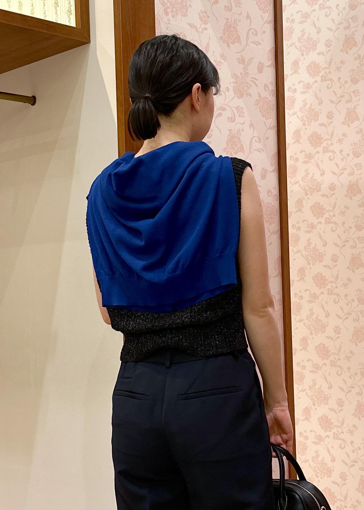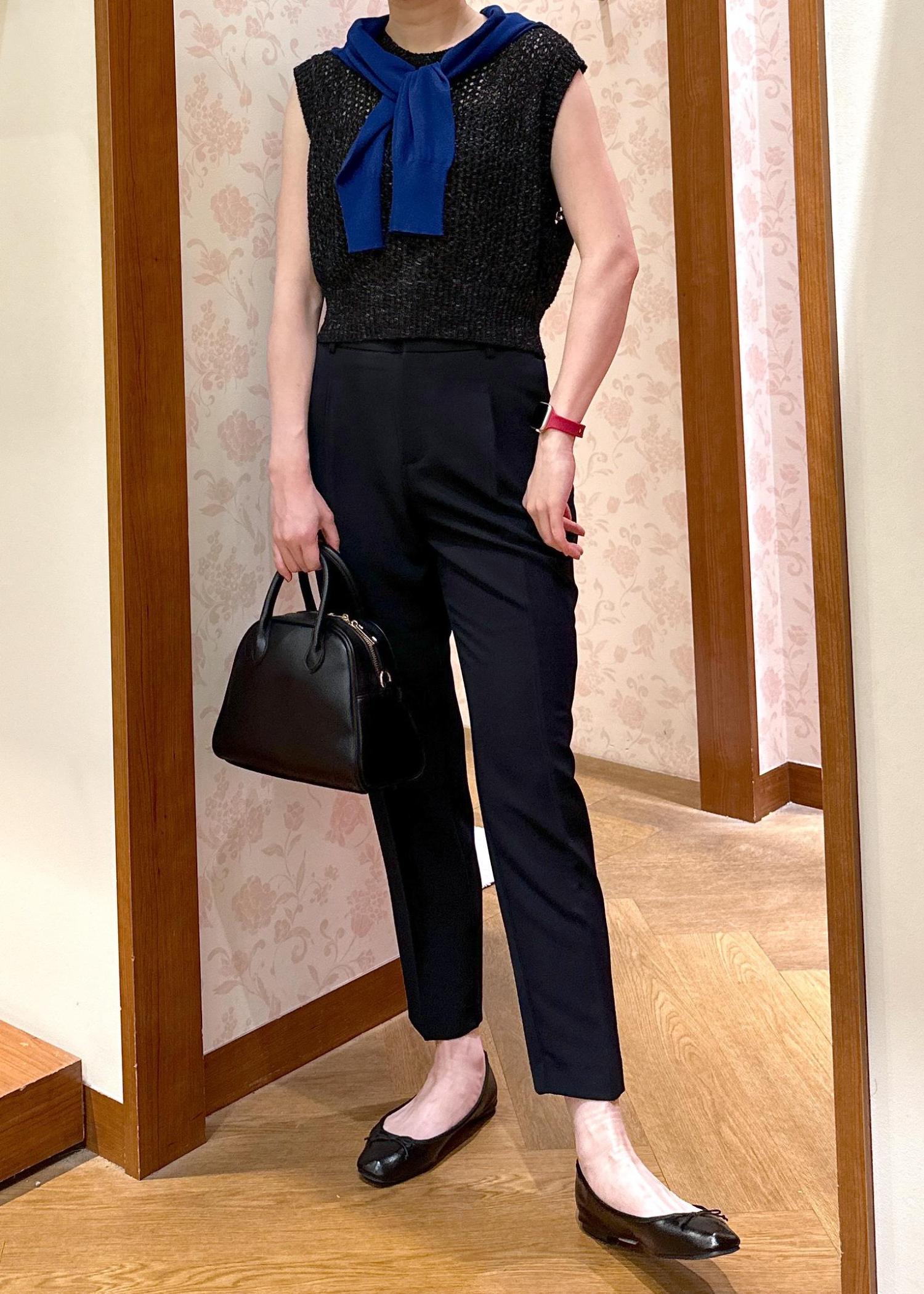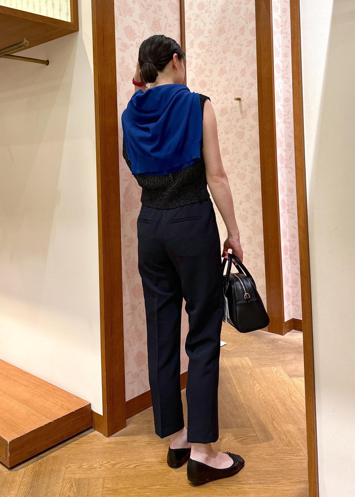 普段の仕事服に、トップスを少しカジュアルに変更して暗めカラーですが華やかに。お出かけやお食事、幅広い場面で活躍できます◎