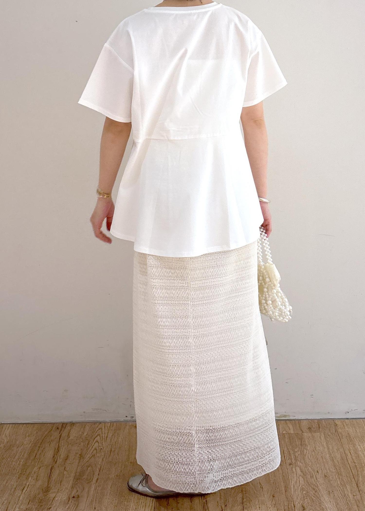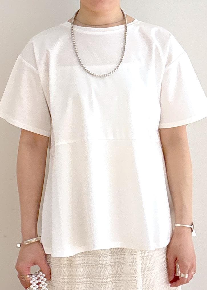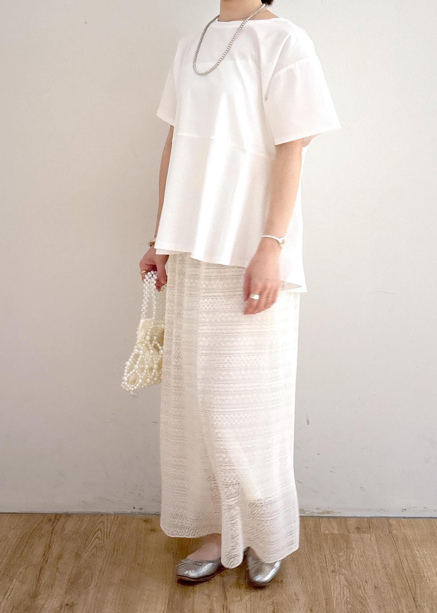 トップスはカット生地なので、程よいカジュアルさが出ます。オールホワイトでも甘過ぎない印象にしました。