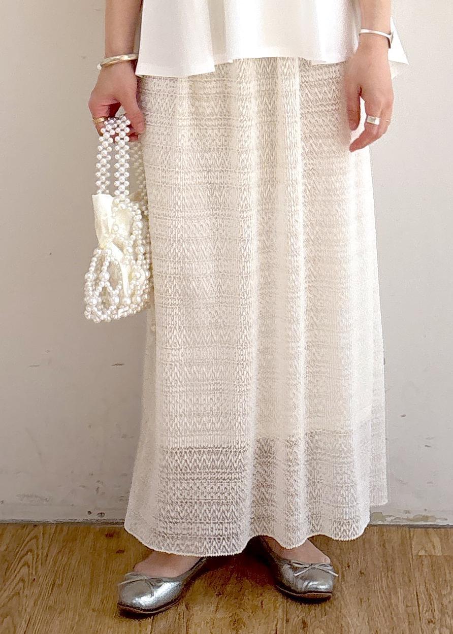 繊細なレースの生地が可愛いく涼しげです。ウエストはゴムですが若干緩く、落ちてはきませんが、インしたりベルトをつけると安心かもしれません。身長155cm丈はローヒールでも引きずりません。