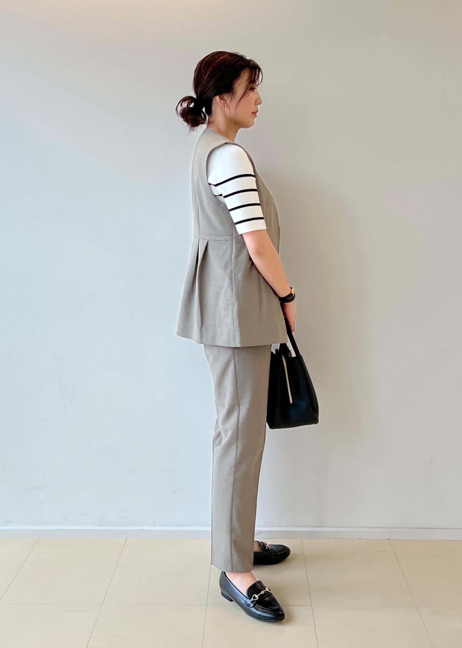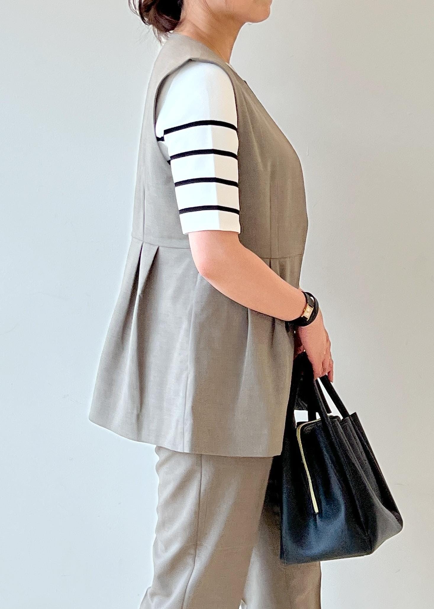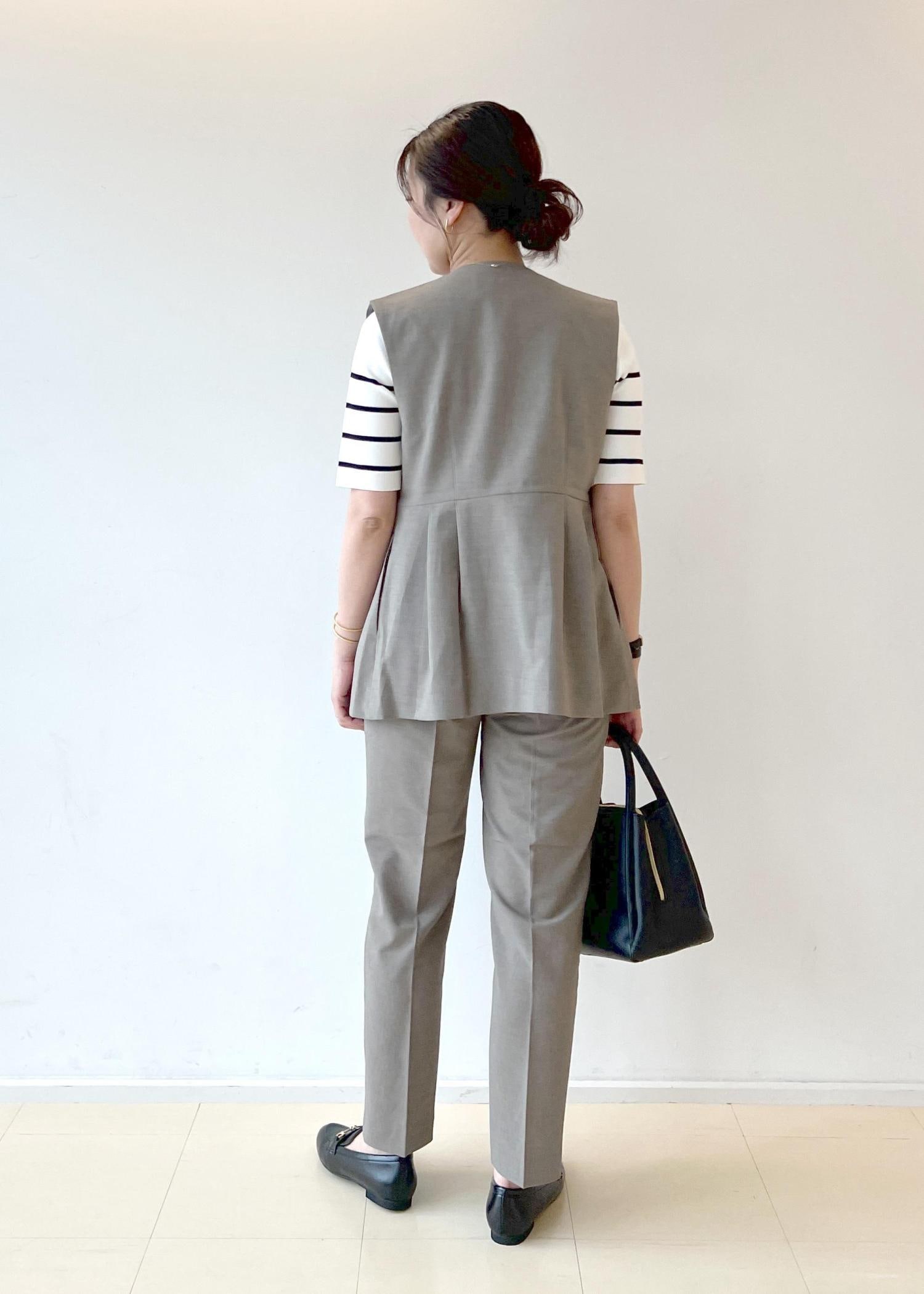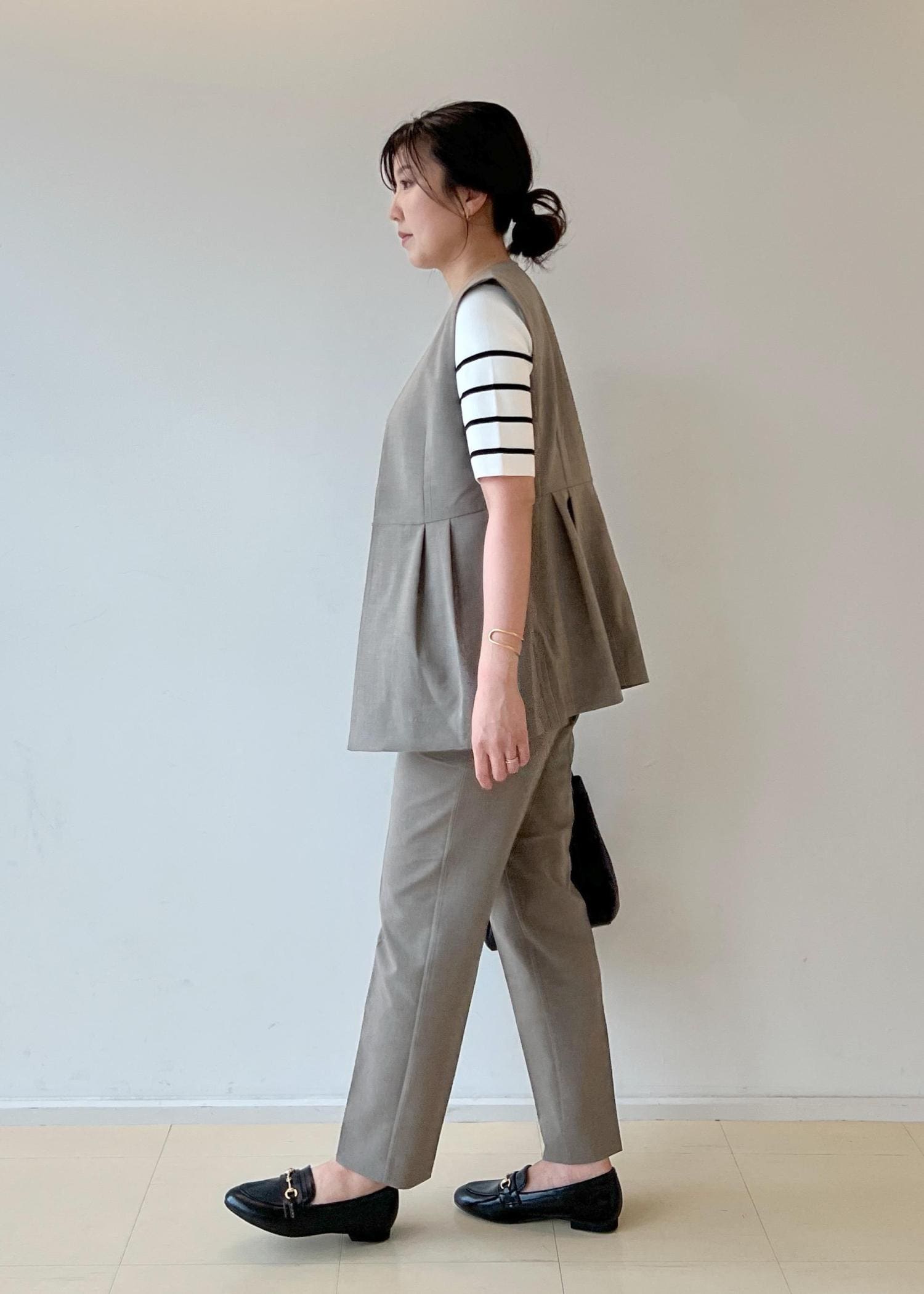 今から夏に使えるオフィスカジュアルコーデです。気になるヒップ周り・二の腕が隠せるコーディネートにしてみました。