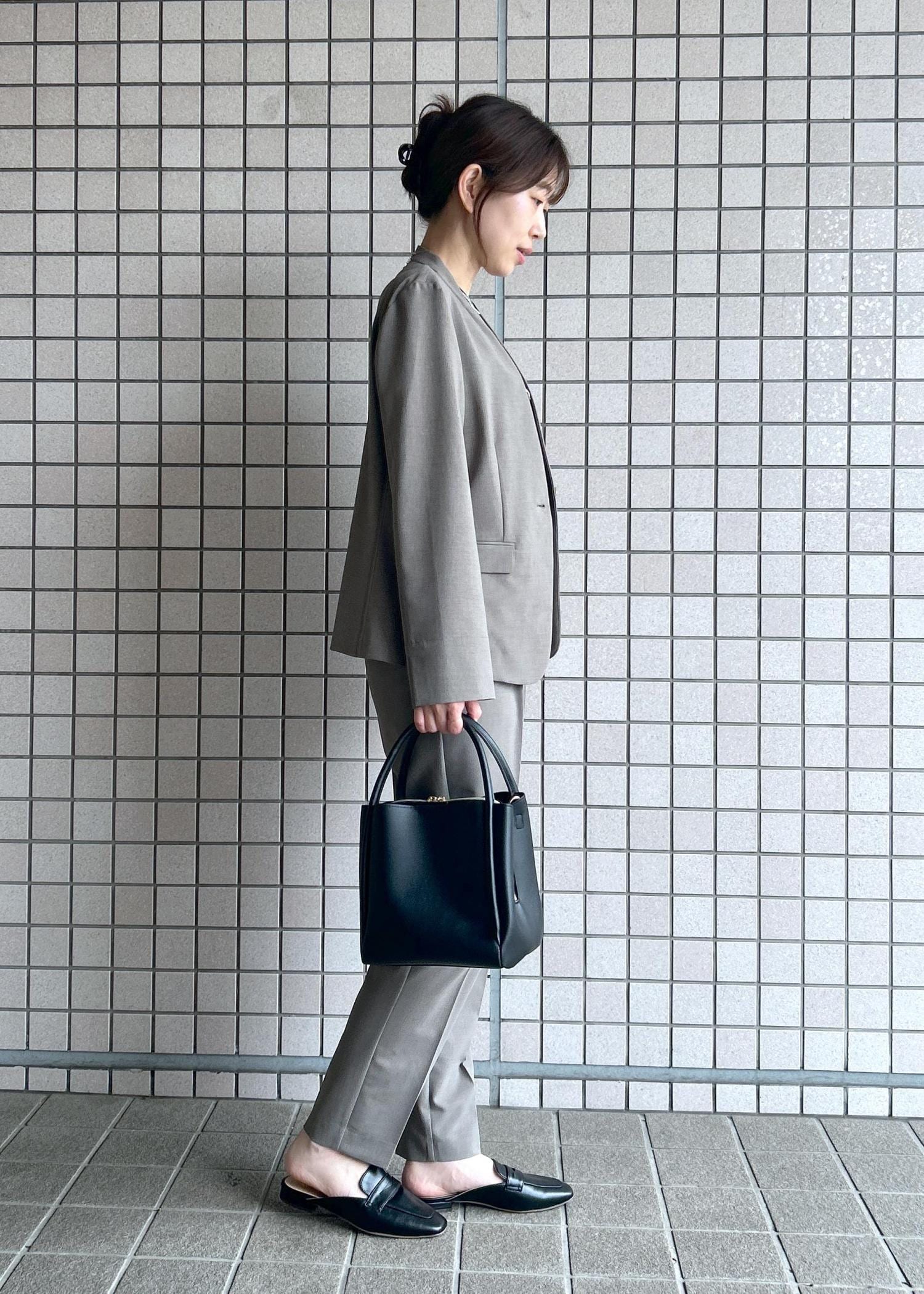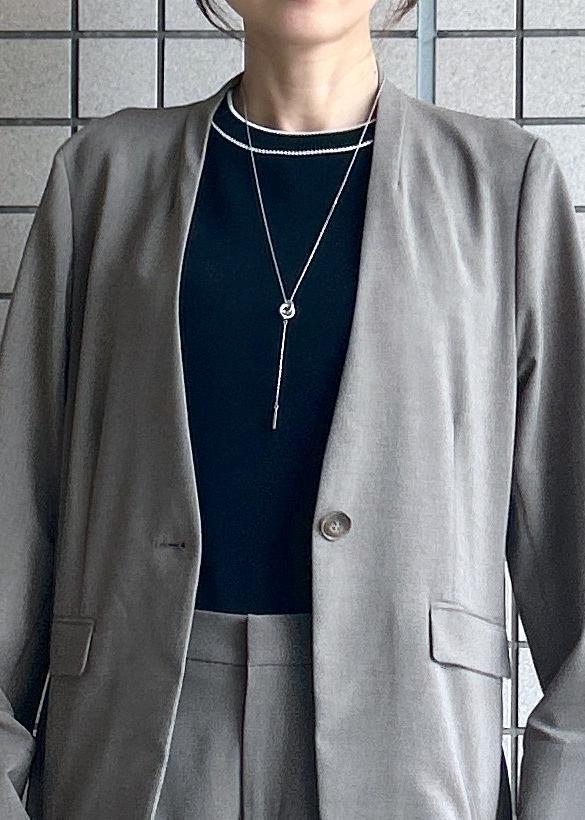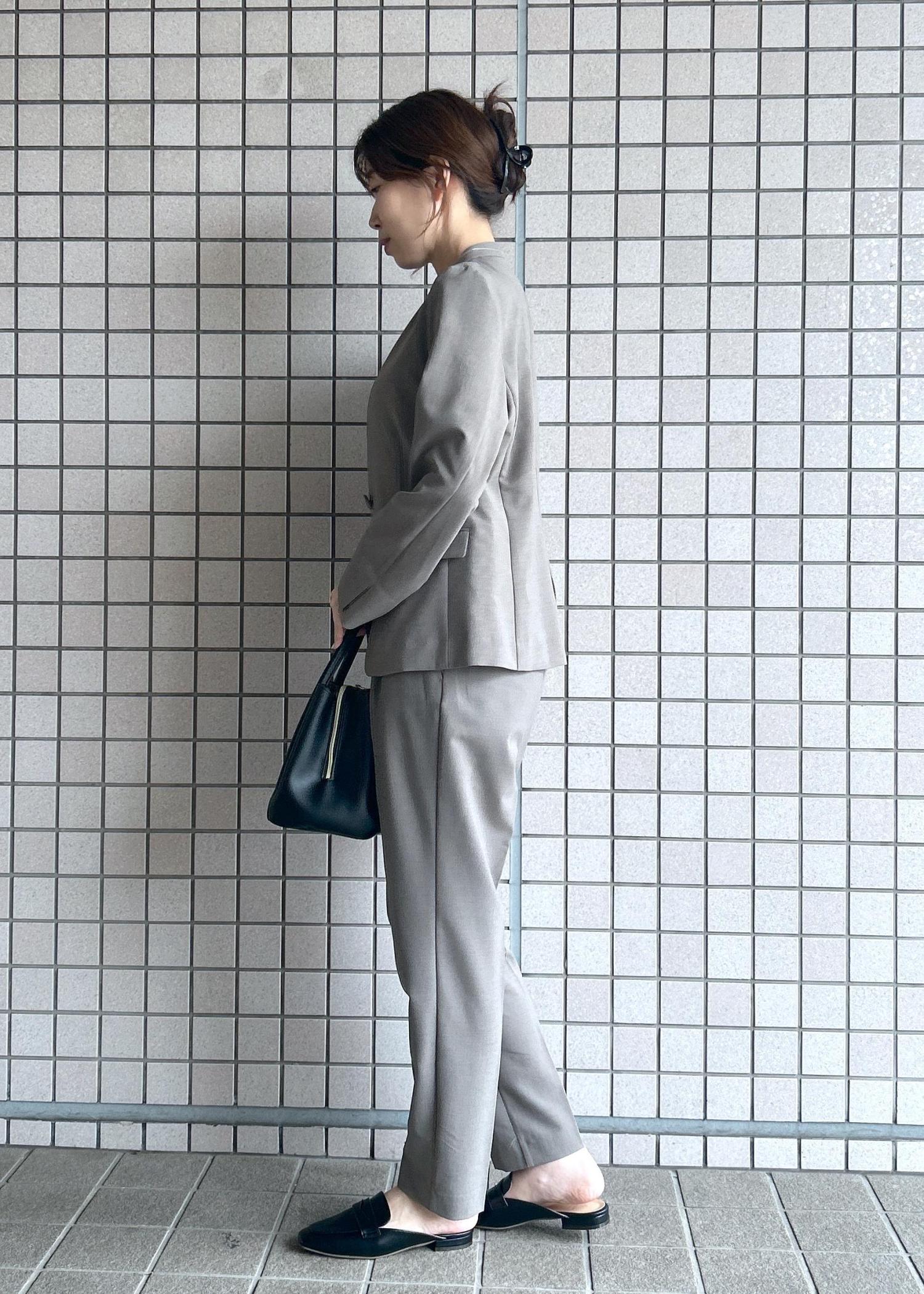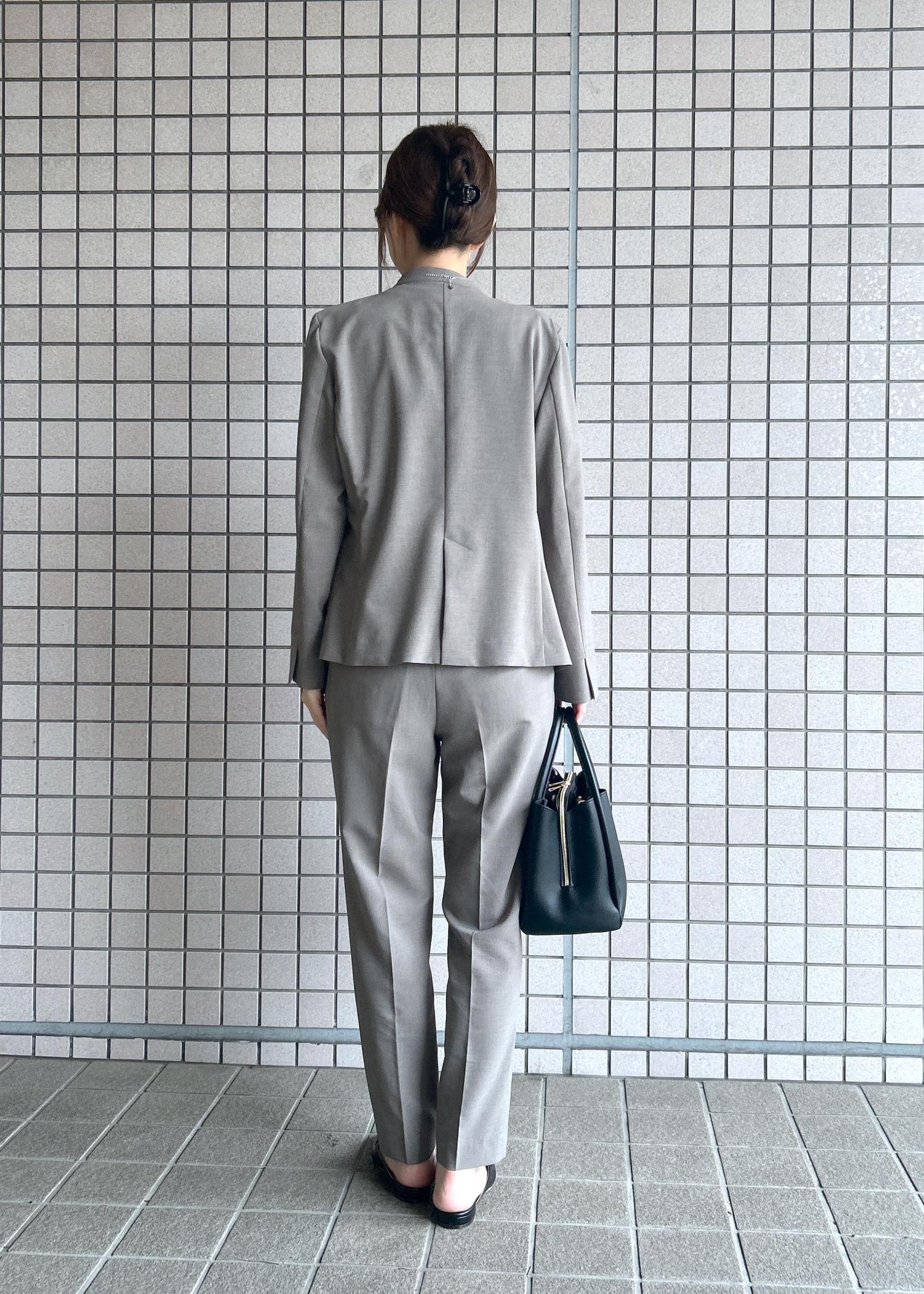 シンプルなノーカラーのジャケットは、インナーもあわせやすくお顔まわりもすっきり◎