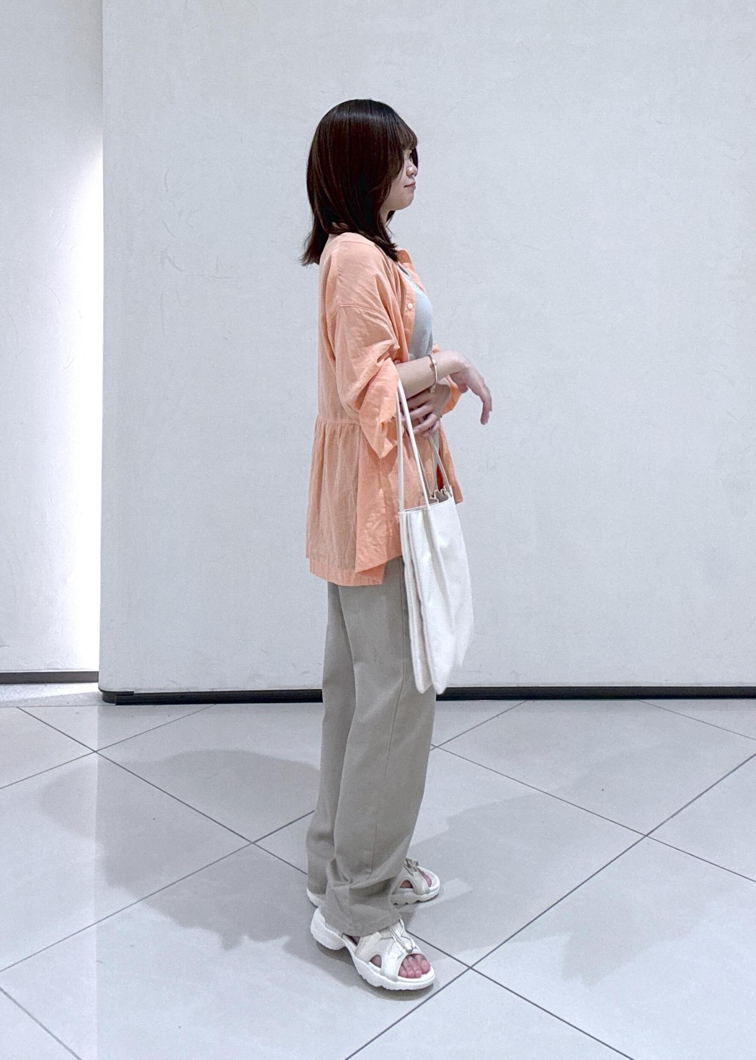 ペプラムシャツは1枚で可愛く着ていただけるので、シンプルになりやすい夏のコーディネートにはピッタリです!