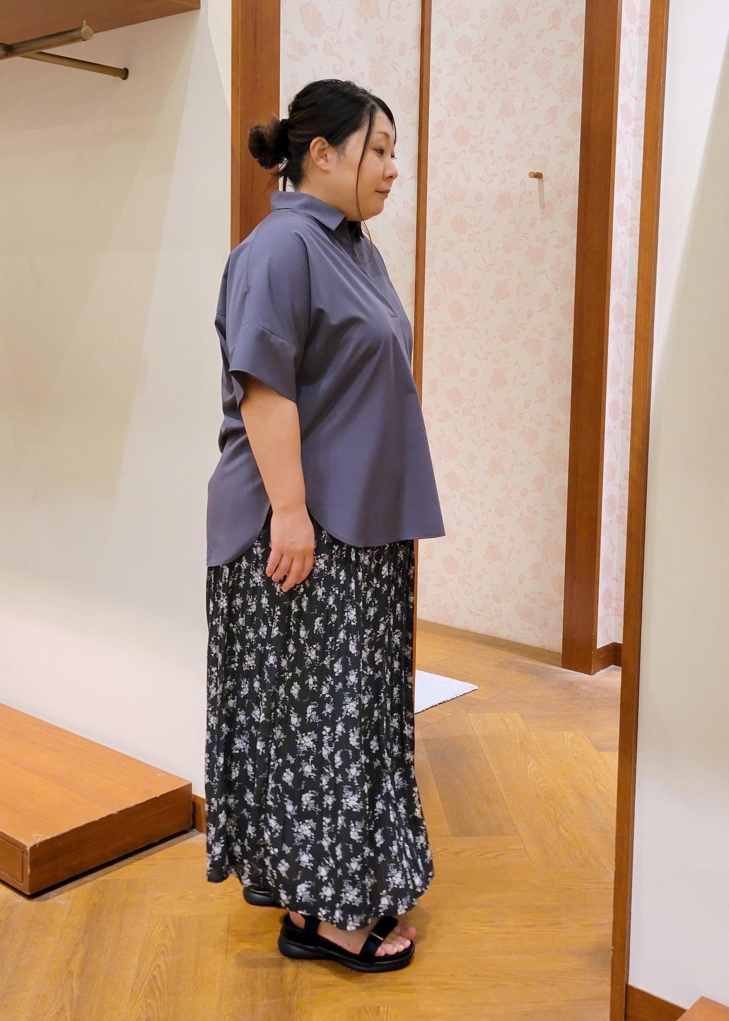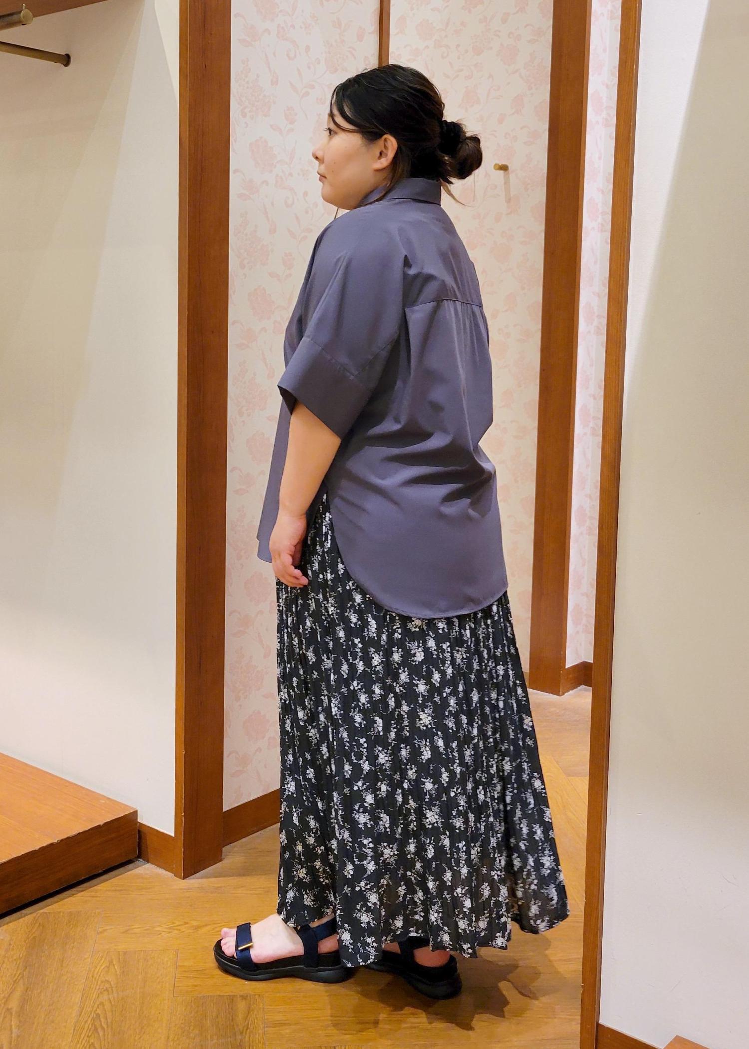 スキッパーシャツブラウスを毎年人気の着丈が選べるスカートを合わせた大人カジュアルスタイルです。