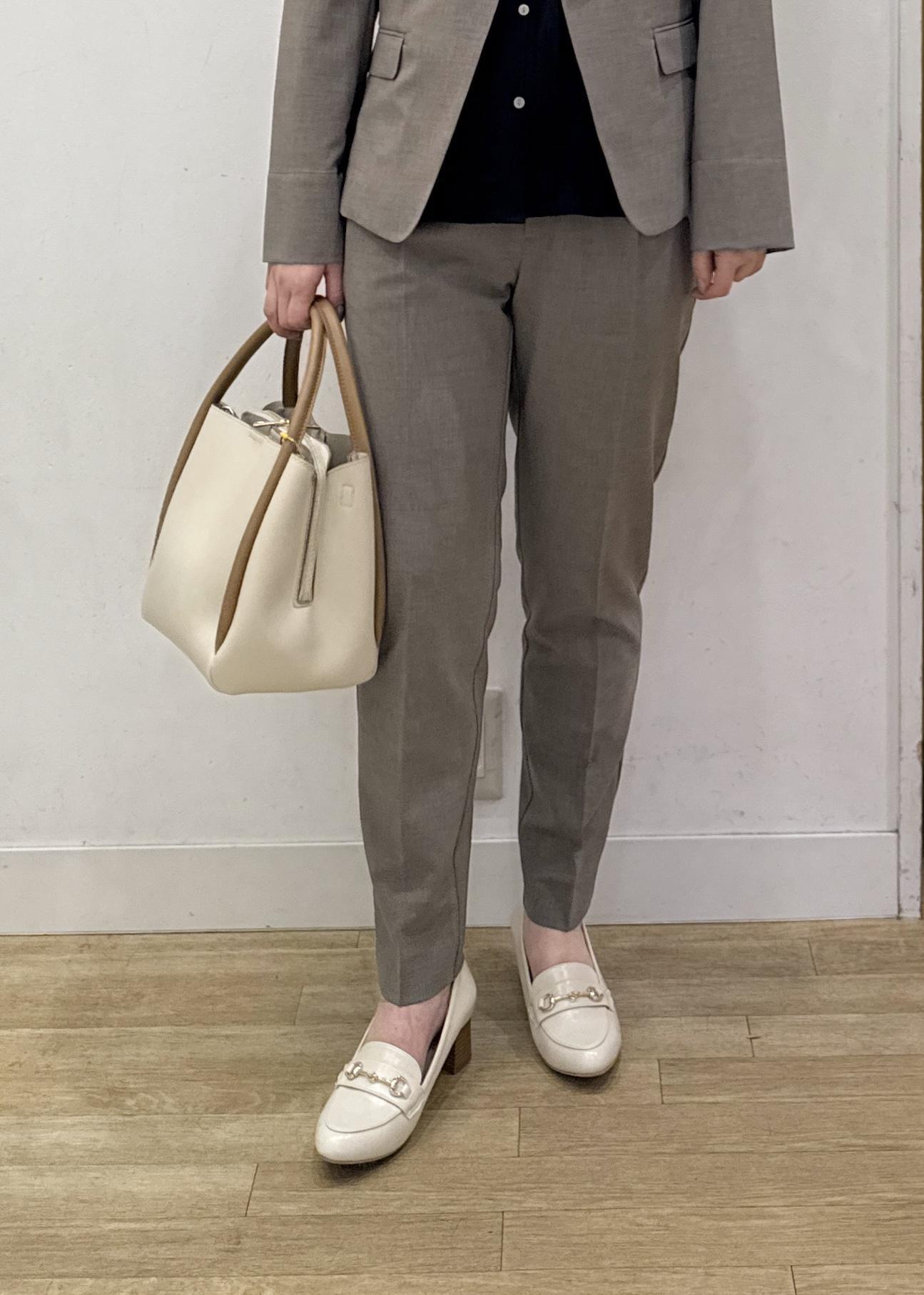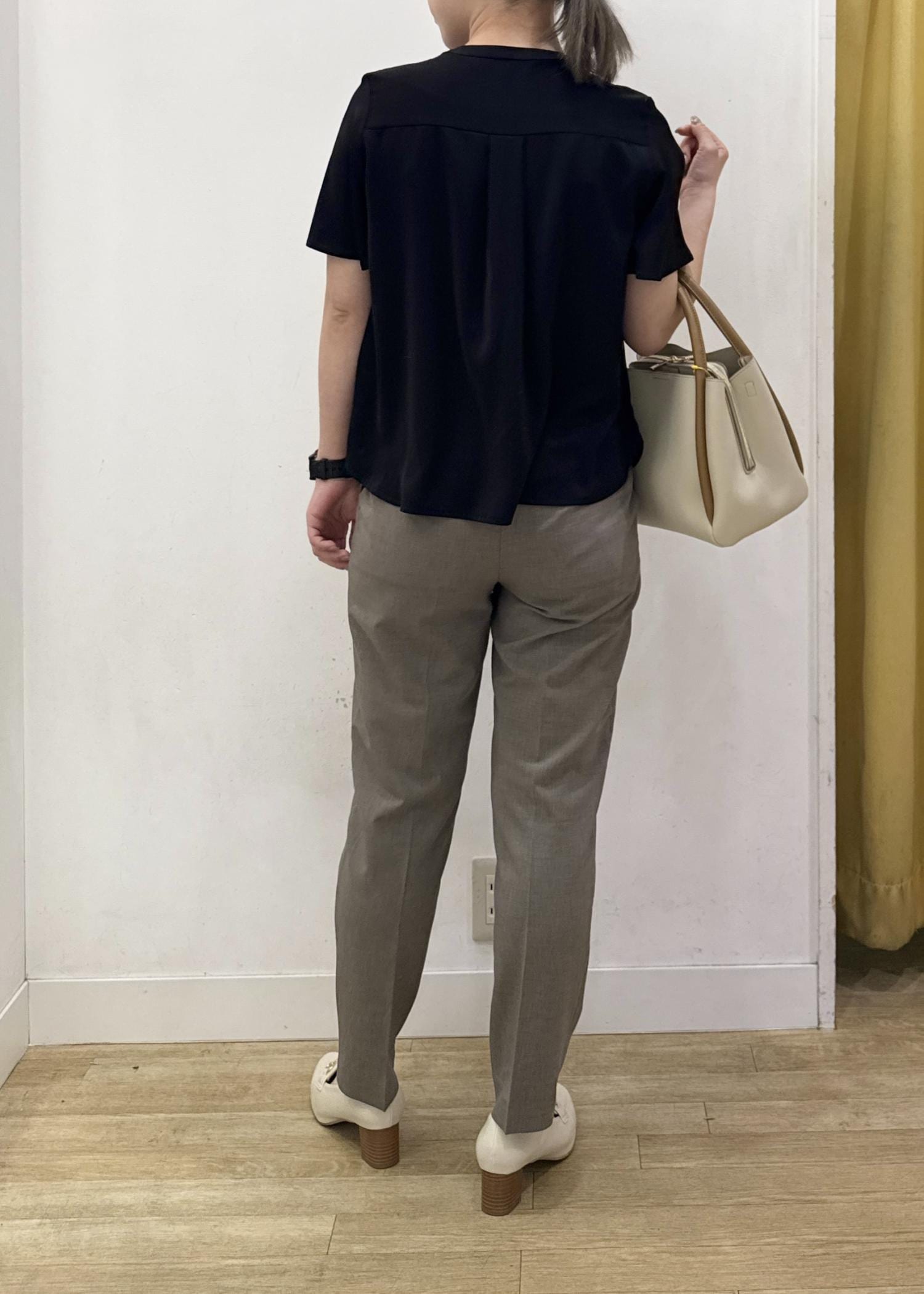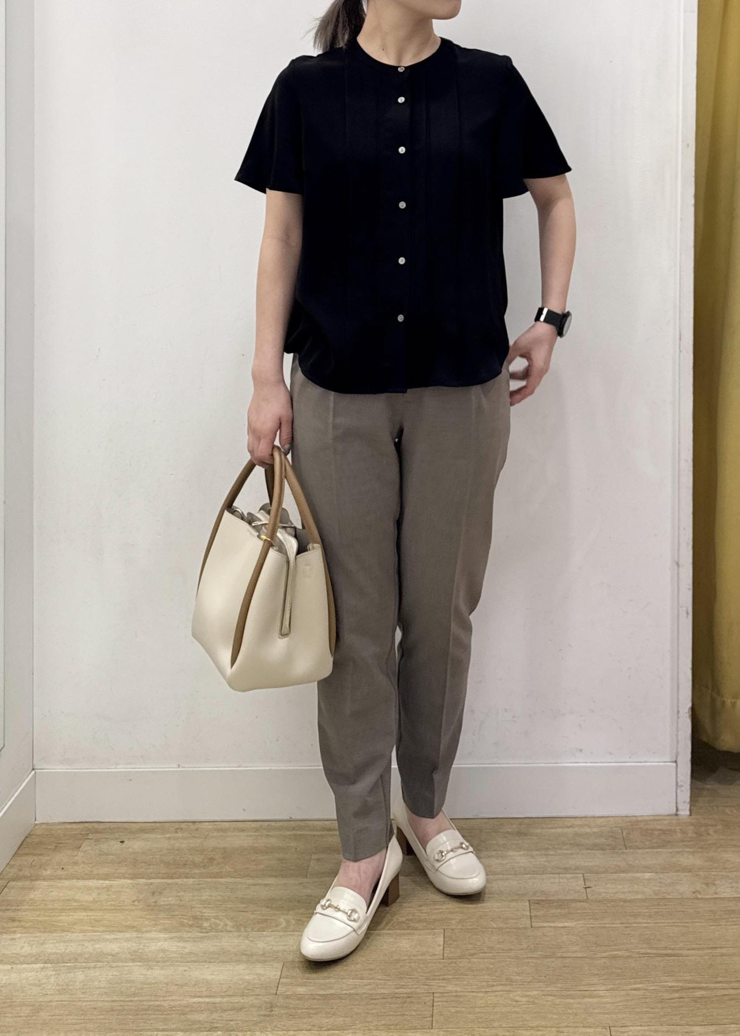 サラッと薄手の素材とスッキリとしたラインのテーパードパンツは夏のお仕事着にもオススメです。 -