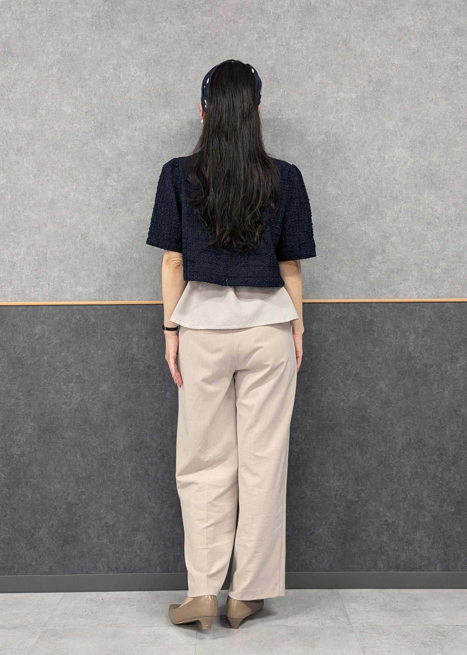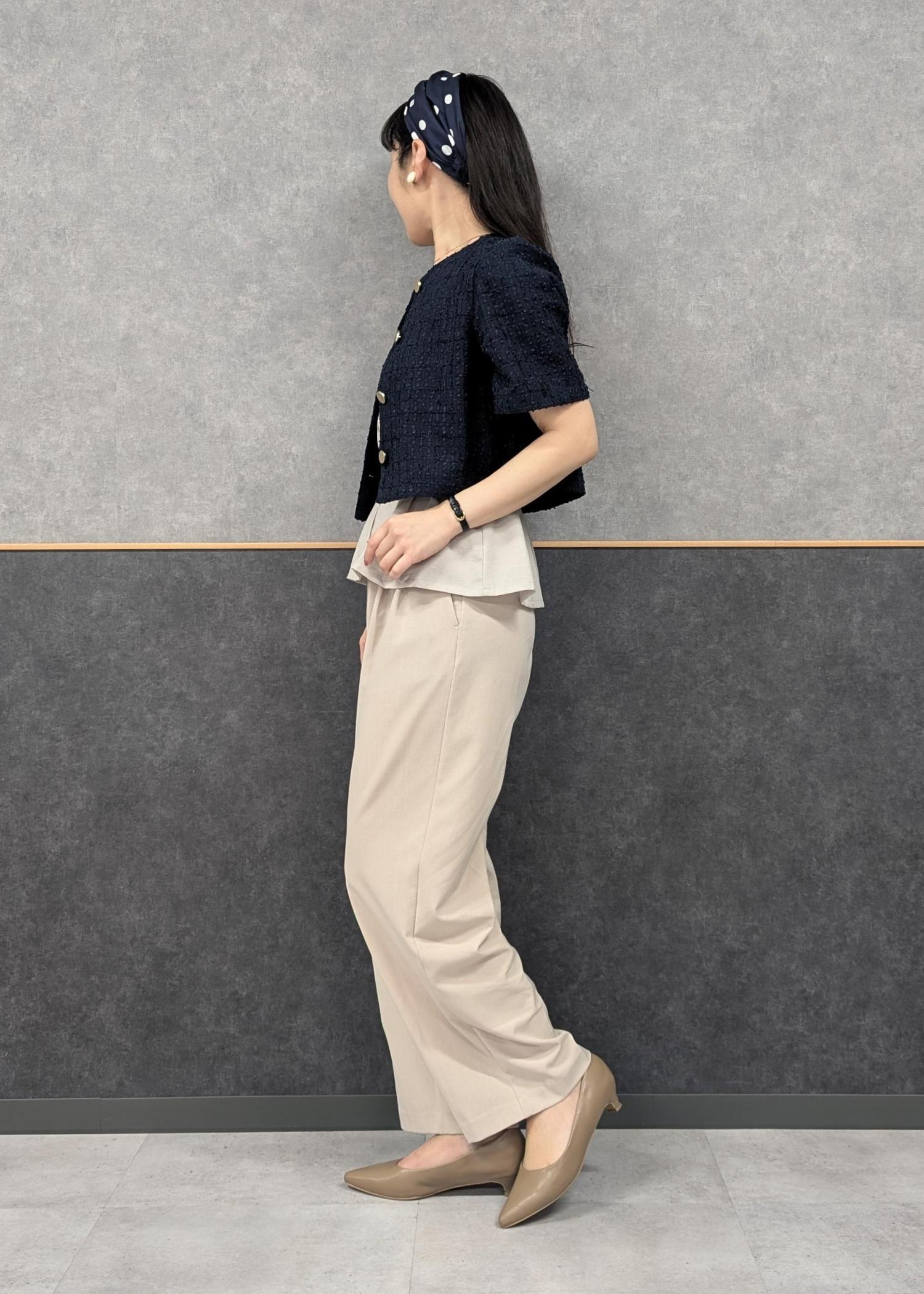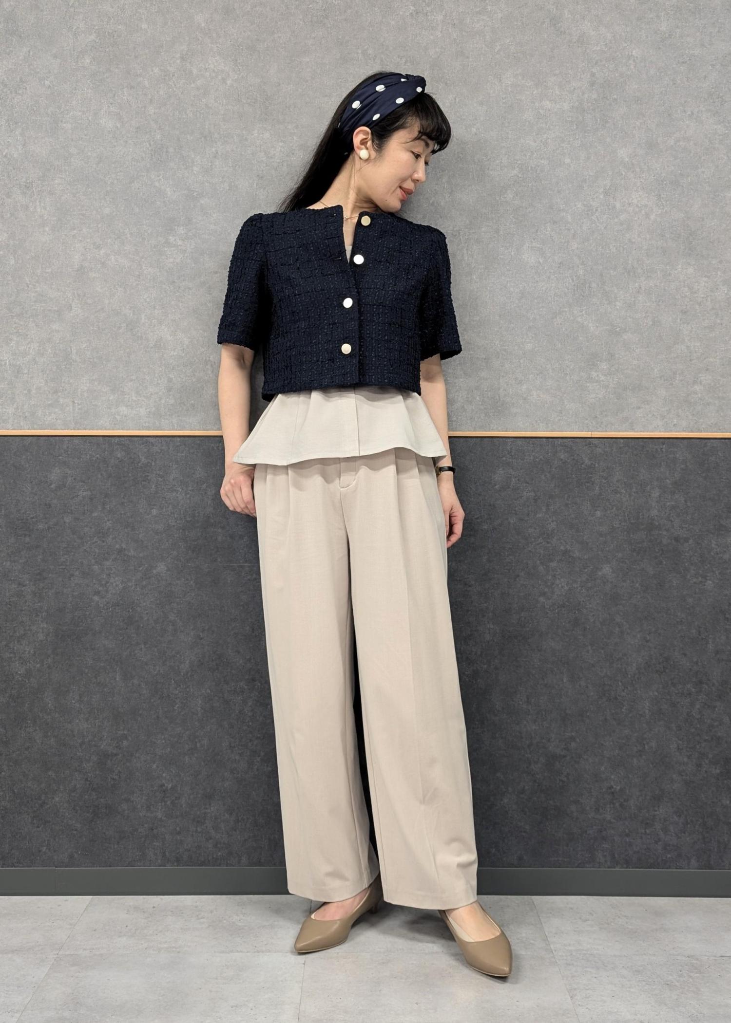 長めのビスチェとクロップド丈のジャケットを合わせることで、ペプラムのようなシルエットが出て可愛い組み合わせです(^.^)